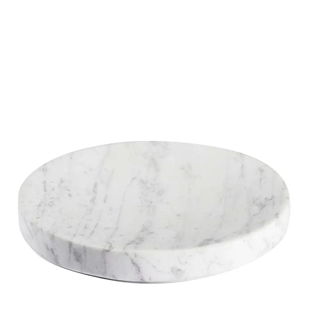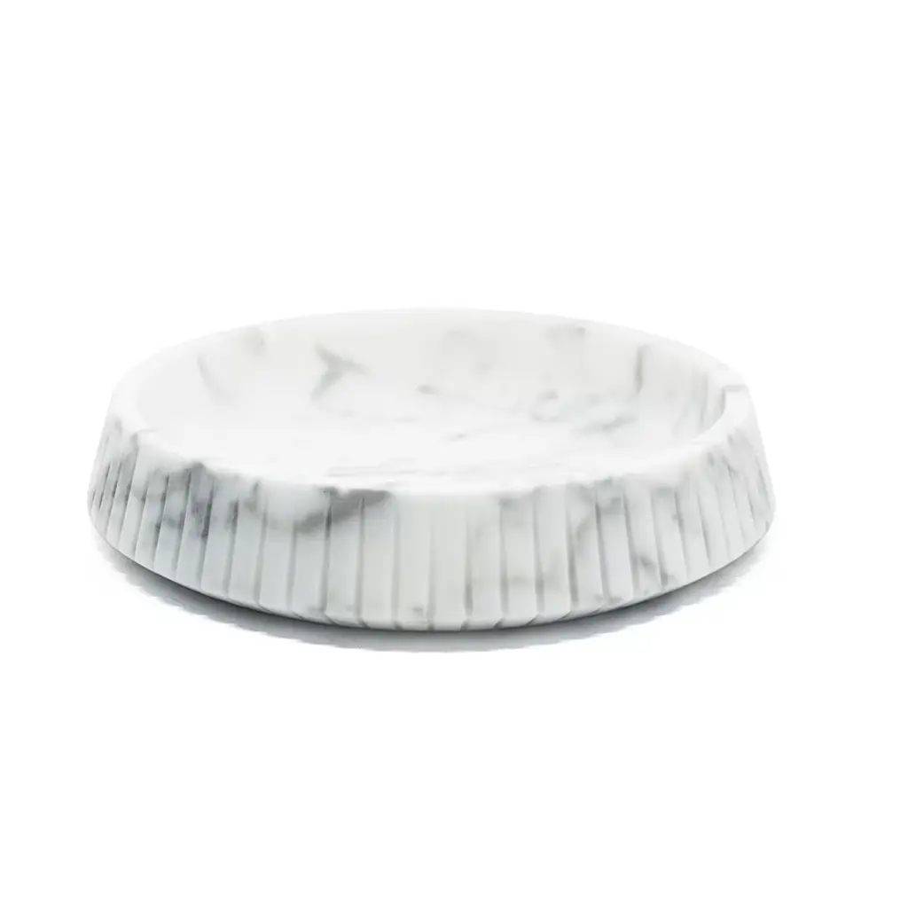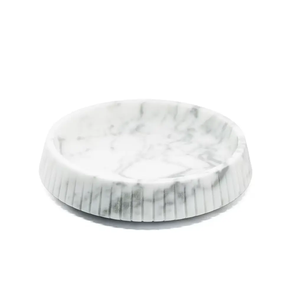 This elegant centerpiece can be used on the table, in the kitchen or on a sideboard. It is perfect for holding fruit, bread, flowers or other objects. Designed by Jacopo Simonetti and produced by expert Italian artisans, each item is one-of-a-kind due to the White Carrara marble's unique veining. Trimmed in engraved stripe detailing. Not dishwasher safe.