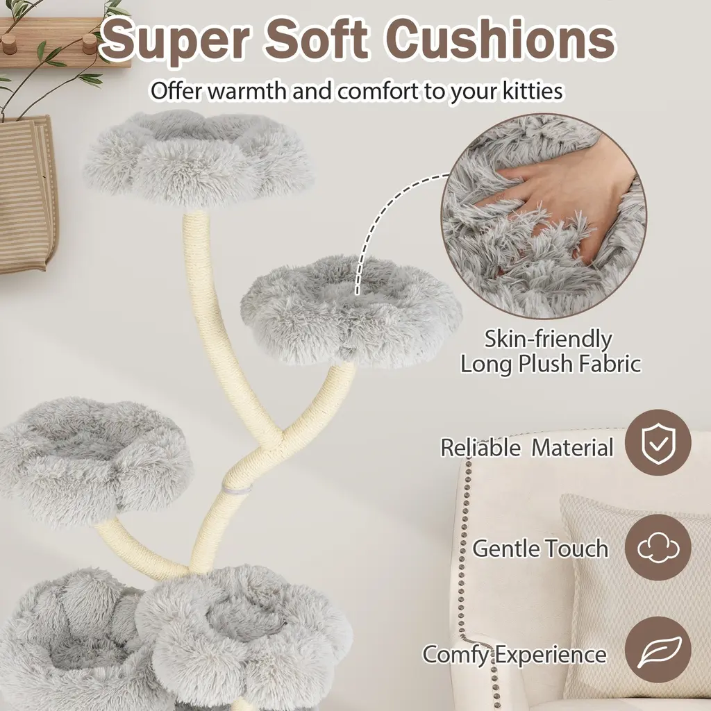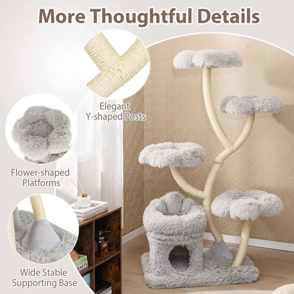 SpecificationsDescription:Elevate your cat’s daily adventures with this 65" multi-level cat tower, thoughtfully designed with four flower-shaped platforms to encourage climbing, perching, and interactive play. Built on a thick 2" base and supported by durable metal pipes, the structure ensures reliable stability, while fully wrapped sisal posts satisfy scratching needs and help protect your furniture. The cozy 2-in-1 cat condo at the bottom provides a quiet hideaway with a private entry, and the upper house, upholstered in soft plush fabric, offers a snug retreat for napping. Every surface is wrapped in long, skin-friendly fluff to deliver warmth and comfort during rest or play. With its unique Y-shaped posts and chic floral design, this freestanding cat tree blends seamlessly into your living space while offering your feline a dedicated zone for climbing, lounging, and relaxing. Ideal for multi-cat households, each tier supports up to 28.5 lbs, making it a stylish and functional centerpiece for any pet-loving home.