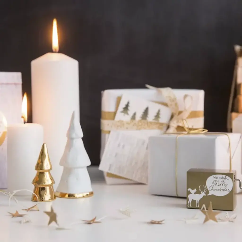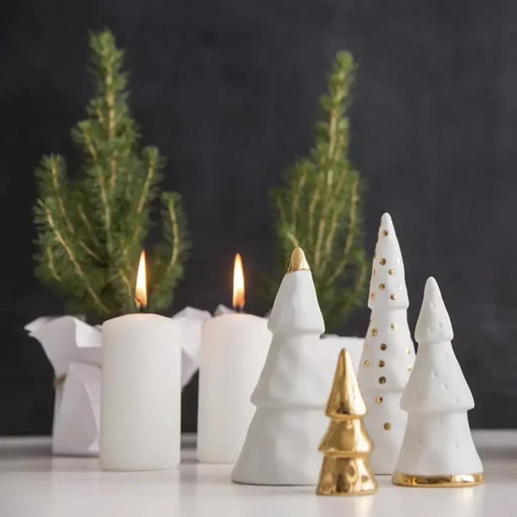 The Winter Forest Porcelain Fir Trees, Set of 4 from Räder, designed by Indigo Ruh, are a timeless addition to seasonal displays. Each tree in this set of four features unique detailing, from gold-tipped branches to delicate dotted patterns. The porcelain's pristine surface mimics freshly fallen snow, while metallic accents add some festive sparkle. These versatile pieces can stand alone as striking accents or combine to form a stunning centerpiece. Their varying heights and designs allow for creative arrangements, perfect for mantels, tabletops, or alongside other holiday decor.