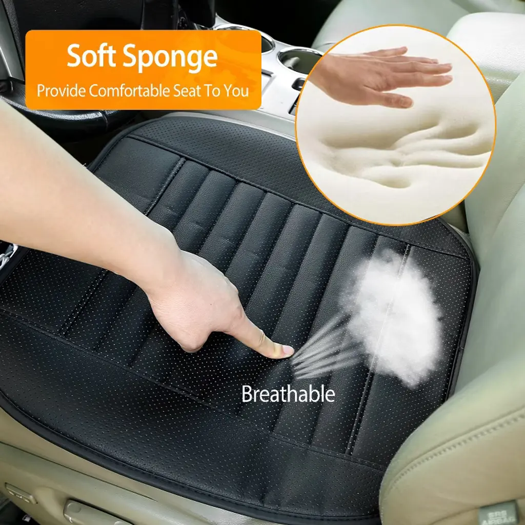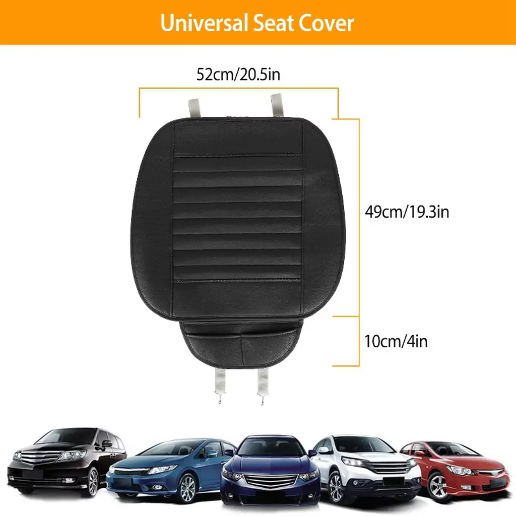 Breathable Comfort: The car seat cover features a soft, breathable design with a thin sponge and bamboo charcoal filling, providing relief from long hours of sitting and keeping you cool and comfortable. Non-Slip Bottom: Equipped with small silicone bumps, the non-slip bottom ensures the seat cover stays securely in place, enhancing driver safety by preventing shifting during use. Universal Fit: Designed to fit most car seats, this cover is suitable for use in all seasons, keeping your car seat fresh and protected from wear and tear. Convenient Storage Pocket: The front pocket allows quick access to your essentials such as a wallet, phone, or cards, providing extra organization and convenience. Easy Installation: The seat cover can be easily installed or removed with the included snaps and elastic bands. It stays securely in place for a snug, hassle-free fit. Note: To clean, use a damp towel—do not machine wash. Ensure the seat belt locks are not covered when installing, as they vary in placement across car models. Specifications: Brand: iMounTEK Product Type: Car Front Seat Cover Color: Black Material: PVC Leather Size: 52x49x1 cm / 20.5x19.3x0.4 in Weight: 321g / 0.7 lbs Package Size: 54x51x1.5 cm / 21.3x20x0.6 in Package Weight: 385g / 0.85 lbs Package Includes: 1 x Car Front Seat Cover 2 x Snaps 1 x User Manual