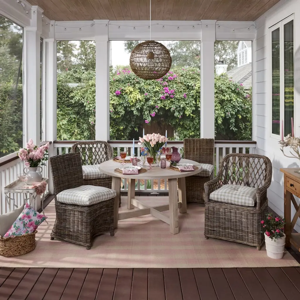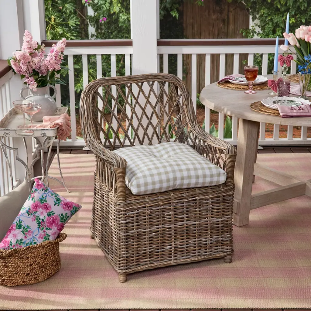 The Arden x Alexandra Kay Plush Blowfill Seat Cushion 2-Pack is made with soft polyfiber fill and long-lasting outdoor polyester fabric with PFAS-Free C0 treatment. Alexandra Kay collaborated with the Arden design team to bring her palette and style to this ultra-comfortable outdoor seat cushion that is also eco-friendly and Skin-safe for your family. This outdoor chair cushion measures 20in W x 20 in L x 4.5 in T. The 100% printed polyester outdoor fabric resists fading, so your patio cushion looks vibrant for longer. Skin-safe C0 water protection helps your seat cushion withstand continued outdoor use, while cleaning easily with just soap and water for low-maintenance upkeep. Two sets of ties make sure your outdoor seat cushion stays firmly in place, while the center tuft adds a decorative touch. Inside this outdoor chair cushion is 100% polyfiber blowfill to help it retain shape and provide long-lasting comfort during outdoor use. Made from 100% recycled plastic, the polyfiber fill provides an environmentally friendly and durable option for your backyard patio. Sink into the plush design and enjoy your seat cushion set while sipping coffee with family or cocktails with your friends.