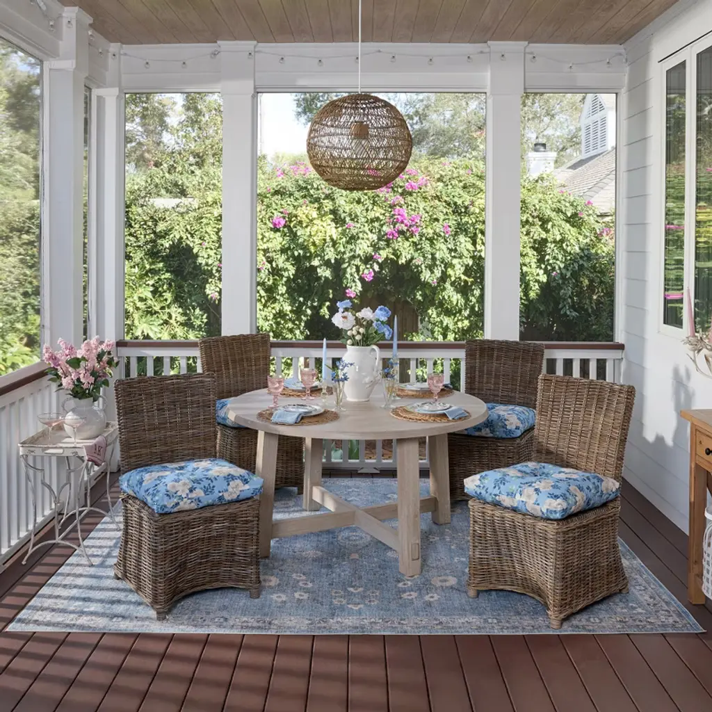 The Arden x Alexandra Kay Plush Blowfill Seat Cushion 2-Pack is made with soft polyfiber fill and long-lasting outdoor polyester fabric with PFAS-Free C0 treatment. Alexandra Kay collaborated with the Arden design team to bring her palette and style to this ultra-comfortable outdoor seat cushion that is also eco-friendly and Skin-safe for your family. This outdoor chair cushion measures 20in W x 20 in L x 4.5 in T. The 100% printed polyester outdoor fabric resists fading, so your patio cushion looks vibrant for longer. Skin-safe C0 water protection helps your seat cushion withstand continued outdoor use, while cleaning easily with just soap and water for low-maintenance upkeep. Two sets of ties make sure your outdoor seat cushion stays firmly in place, while the center tuft adds a decorative touch. Inside this outdoor chair cushion is 100% polyfiber blowfill to help it retain shape and provide long-lasting comfort during outdoor use. Made from 100% recycled plastic, the polyfiber fill provides an environmentally friendly and durable option for your backyard patio. Sink into the plush design and enjoy your seat cushion set while sipping coffee with family or cocktails with your friends.