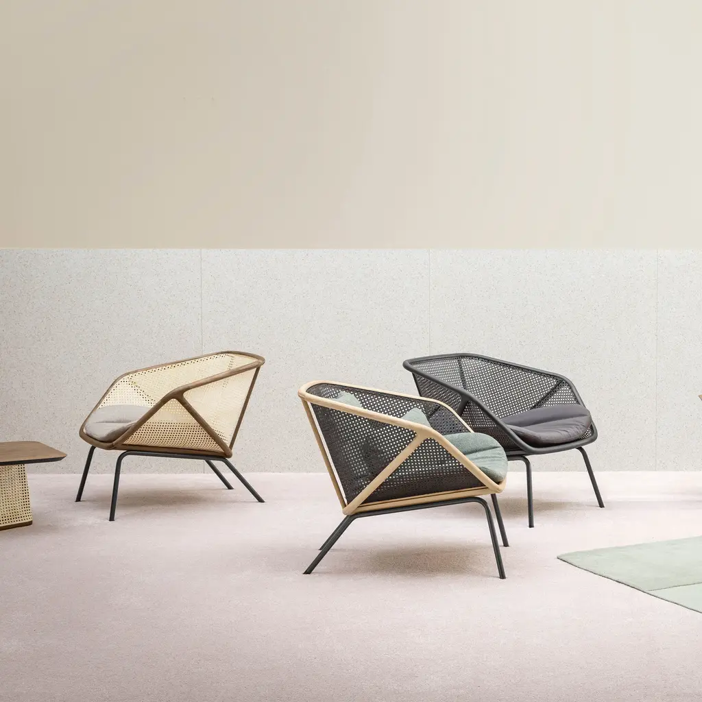 With its steam-bent beechwood frame and open woven-cane structure, Colony recasts traditional materials with a forward-thinking flair. Milan-based design Skrivo takes a strikingly geometric tack in creating an armchair for Italian brand Miniforms that is also deeply comfortable. Optional upholstered cushions in complementary shapes are also available to add even more ease. Finish choices for this sturdy yet lightweight seating include both natural walnut or beech as well as a vegetal-dyed eco leather, with steel legs in black or contrasting hues.
