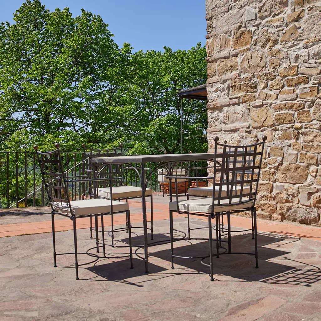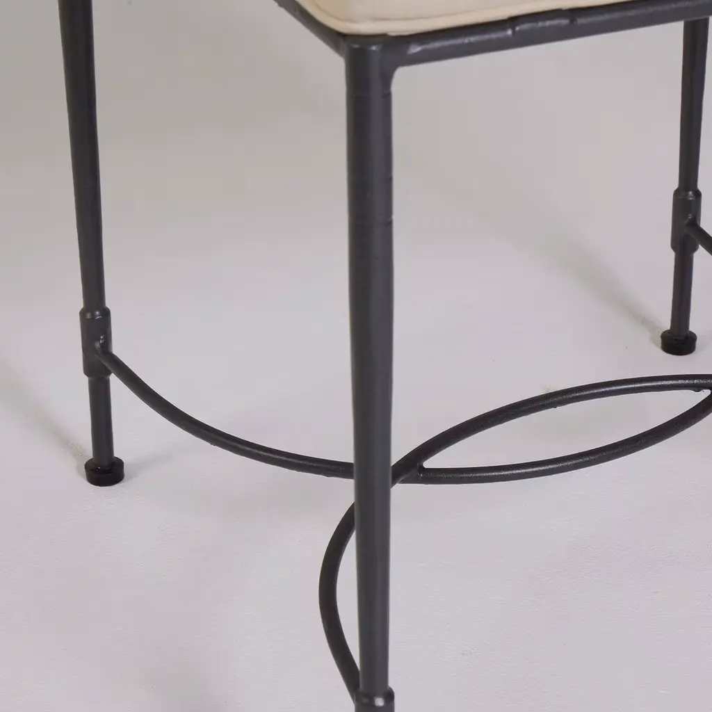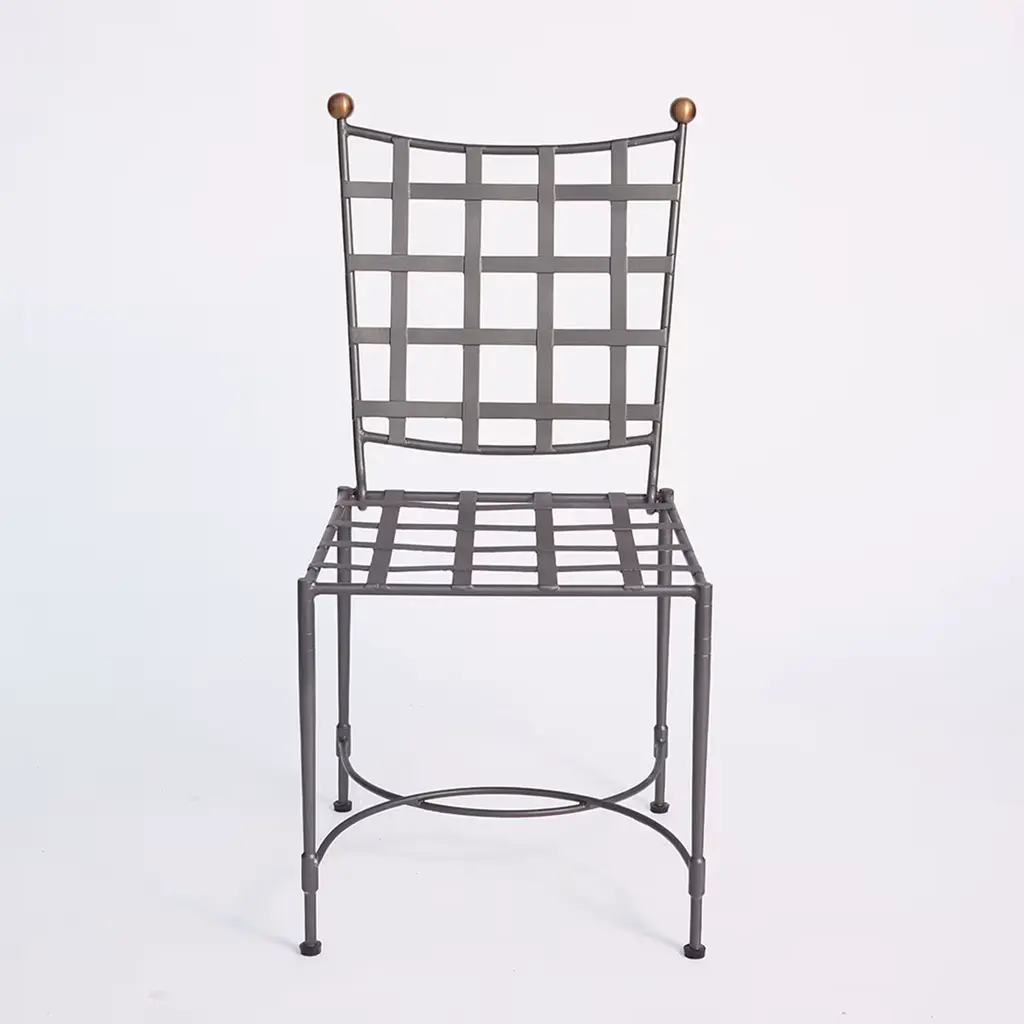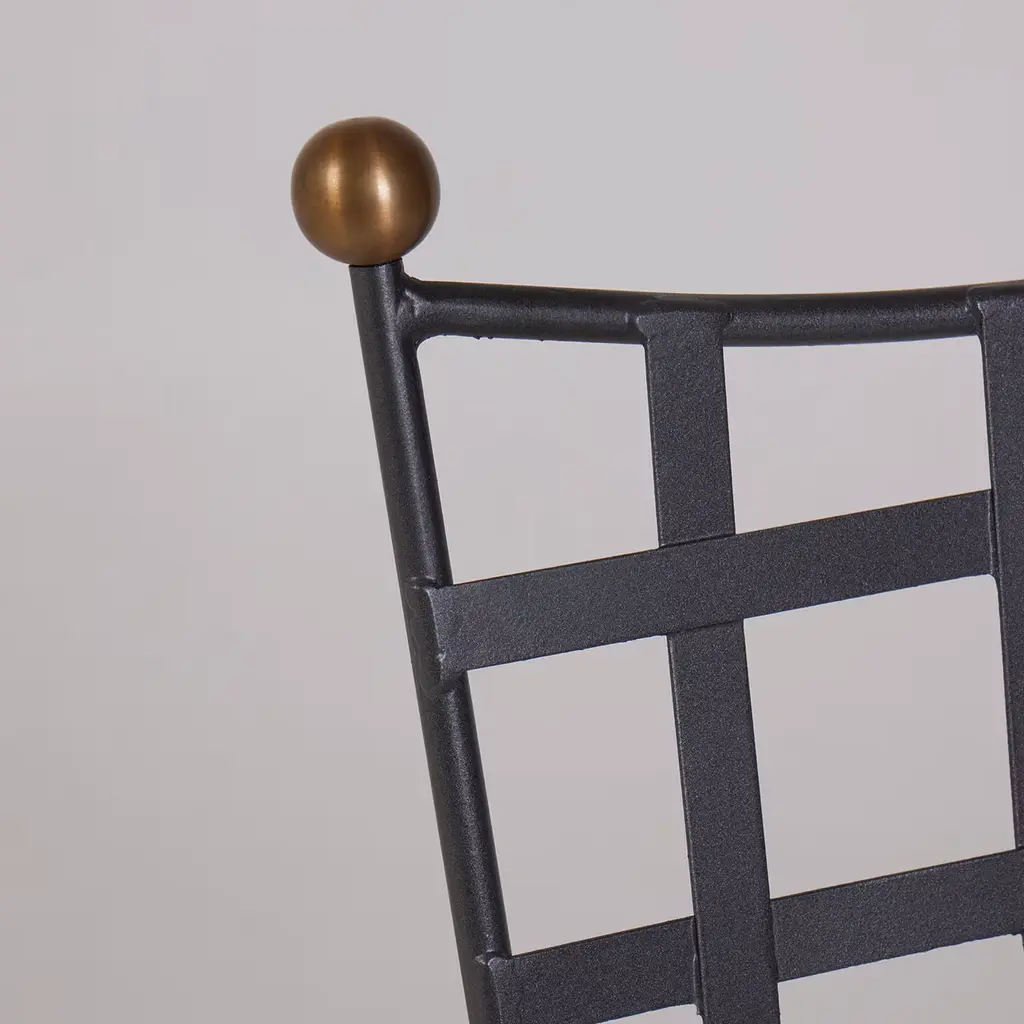 An elegant design for enjoying outdoor moments, this artisan chair was designed with class and comfort in mind. Its beige Sunbrella "Canvas" cushion's cover - removable other than water-resistant and stain-resistant - maximizes the protection already ensured by the cross-weave iron frame that is hot-dip galvanized and fire-varnished in graphite gray. Burnished brass knobs and curved stretchers complete the design.