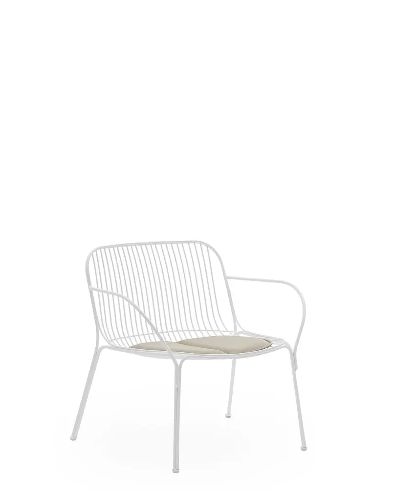 HIRAY takes metal, one of the most important materials for the greening of the Kartell catalogue, and uses the welded wire process to shape it. The result is an essential and functional product that is nevertheless rich in emotion. Metal wires form well-defined yet lightweight structural parts of the collection’s chair, chair with arms, bistro table, armchair, divan and side table. The various articles come in white, Bordeaux, black and green.