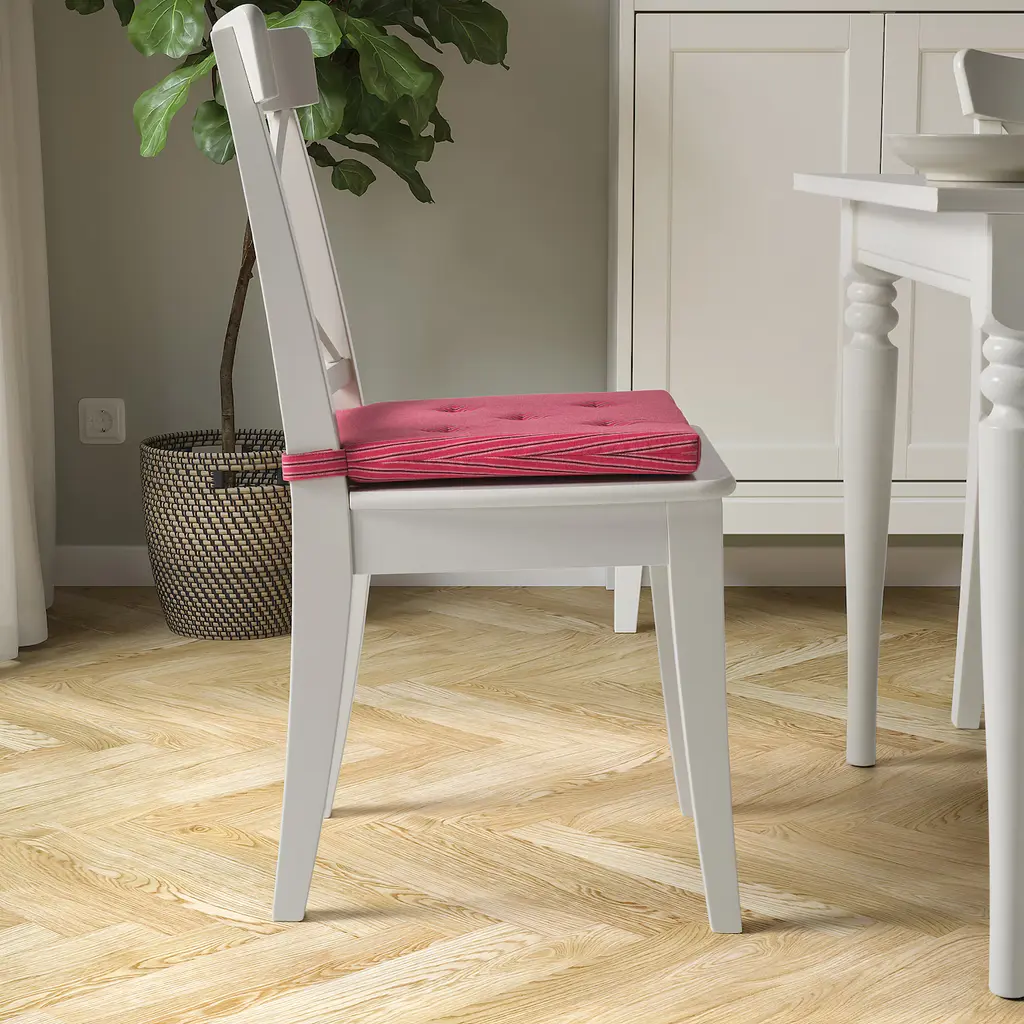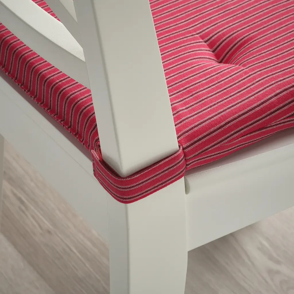JUSTINA Chair pad - red gray/stripe pattern 17/14x16x2 ". The thick foam filling provides great comfort and long-lasting support. Hook and loop fasteners keep the chair pad in place. The chair pad has two identical sides so it can be turned over for even wear. Machine washable for easy care.