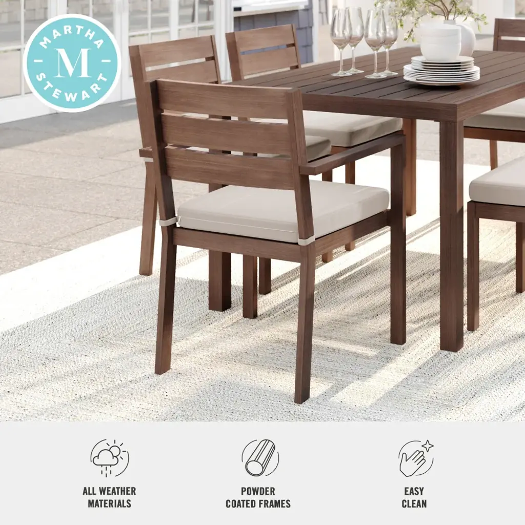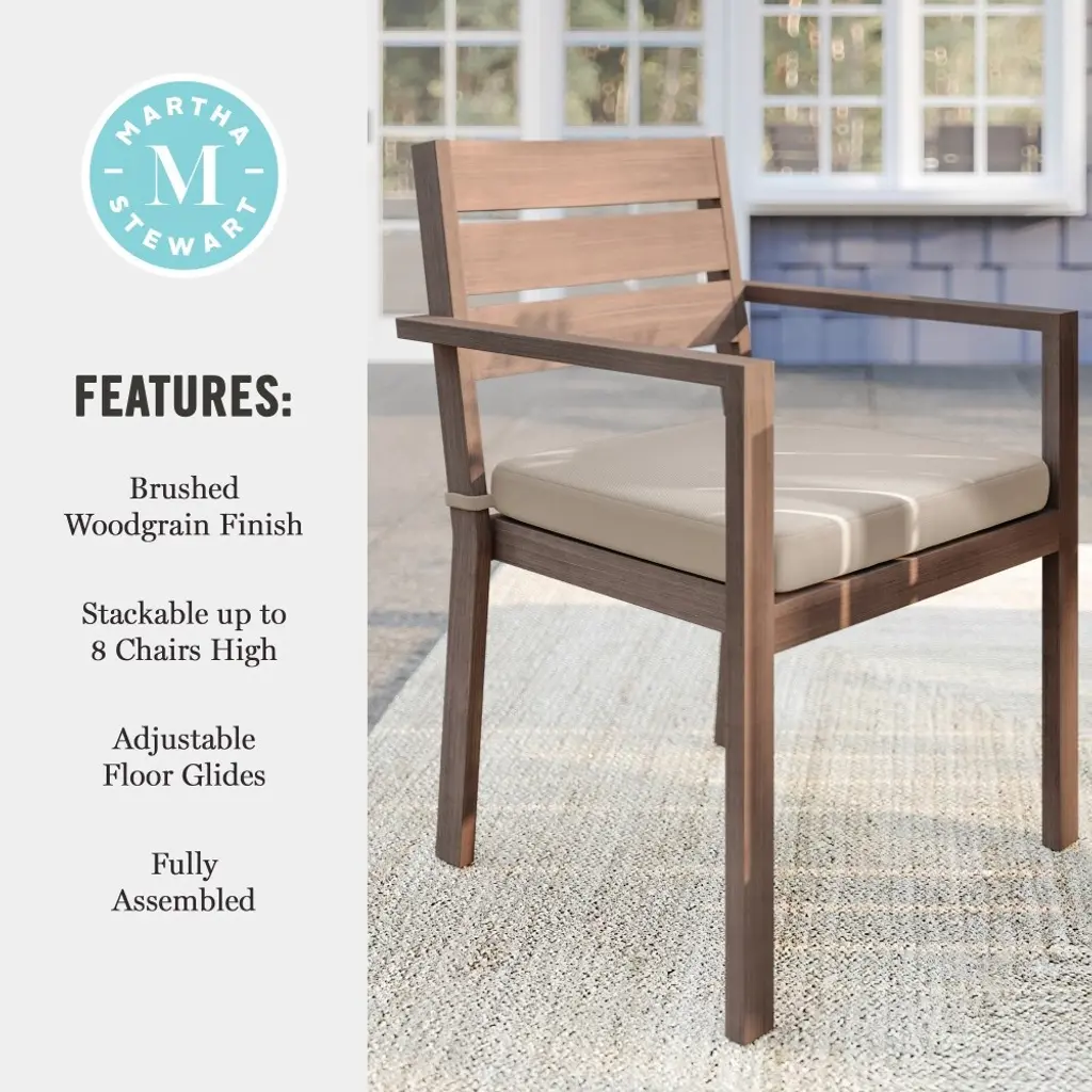 Elevate your indoor-outdoor sanctuary with the set of two Martha Stewart Bedford Patio Dining Armchairs. Masterfully crafted with a durable, rustproof aluminum frame in a beautiful hand-brushed woodgrain finish, these pieces lend elegance to any occasion. All-weather materials and a recommended stack quantity up to eight chairs high deliver peace of mind and welcome convenience by making it easy to store multiple chairs and save space when not in use. The addition of 2.5" thick seat cushions grant gracefully comfortable seating to pair with your morning coffee or a favorite novel. Part of our Bedford collection, these armchairs pair wonderfully with the coordinating armless chairs, accent chairs, barstools, and dining tables, perfect for crafting a custom collection that fits your entertaining needs. Arriving conveniently ready for use and requiring only minimal maintenance, these dining chairs are a must have for everyday use as well as special occasions.Set of two elegant indoor-outdoor dining chairs that elevate any patio into a sanctuary of comfortAll-weather aluminum frames with a hand-brushed woodgrain finish lend rustic beauty2.5" thick seat cushions crafted from all-weather Olefin fabricEnjoy hassle-free, space-saving storage with a recommended stack quantity of eight chairs highPair with other pieces in this patio collection for a custom arrangement to fit your hosting needsMaximum static weight capacity: 300 lbs. per pieceNo assembly requiredUse a damp cloth to wipe clean; Unzip and remove cushion covers for machine washing