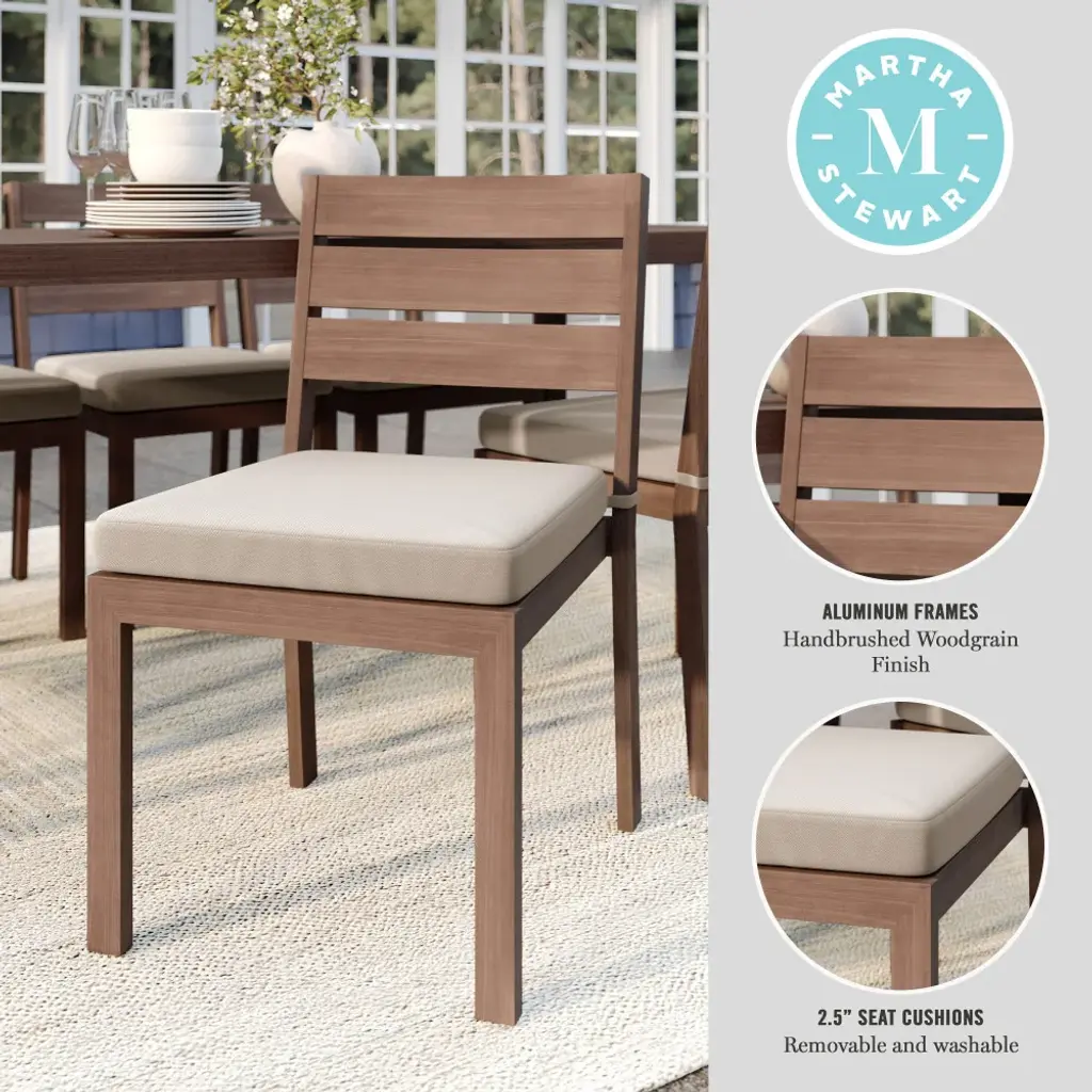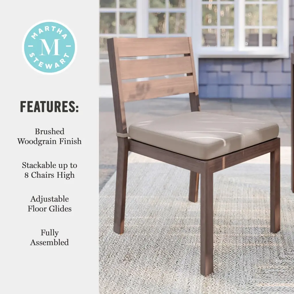 Elevate your indoor-outdoor sanctuary with the set of two Martha Stewart Bedford Patio Side Dining Chairs. Masterfully crafted with durable, rustproof aluminum frames in a beautiful hand-brushed woodgrain finish, these pieces lend elegance to any occasion. All-weather materials and a recommended stack quantity up to eight chairs high deliver peace of mind and welcome convenience by making it easy to store multiple chairs and save space when not in use. The addition of 2.5" thick seat cushions grant gracefully comfortable seating to pair with your morning coffee or a favorite novel. Part of our Bedford collection, these armless chairs pair wonderfully with the coordinating armchairs, accent chairs, barstools, and dining tables, perfect for crafting a custom collection that fits your entertaining needs. Arriving conveniently ready for use and requiring only minimal maintenance, these dining chairs are a must have for everyday use as well as special occasions.Set of two elegant indoor-outdoor dining chairs that elevate any patio into a sanctuary of comfortAll-weather aluminum frames with a hand-brushed woodgrain finish lend rustic beauty2.5" thick seat cushions crafted from all-weather Olefin fabricEnjoy hassle-free, space-saving storage with a recommended stack quantity of eight chairs highPair with other pieces in this patio collection for a custom arrangement to fit your hosting needsMaximum static weight capacity: 300 lbs. per pieceNo assembly requiredUse a damp cloth to wipe clean; Unzip and remove cushion covers for machine washing