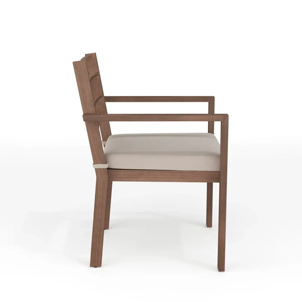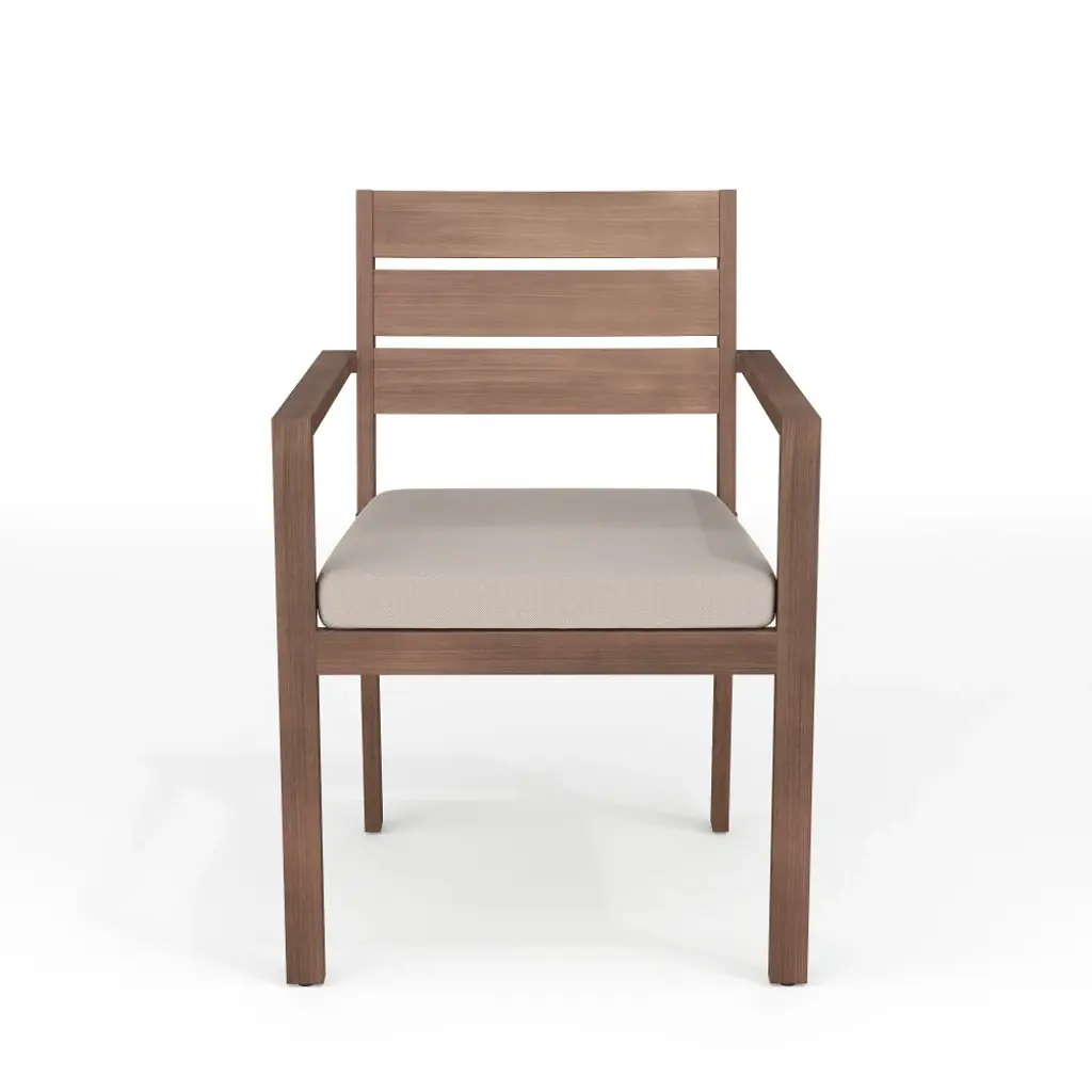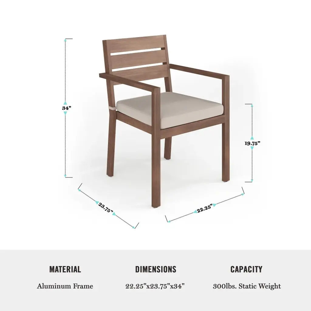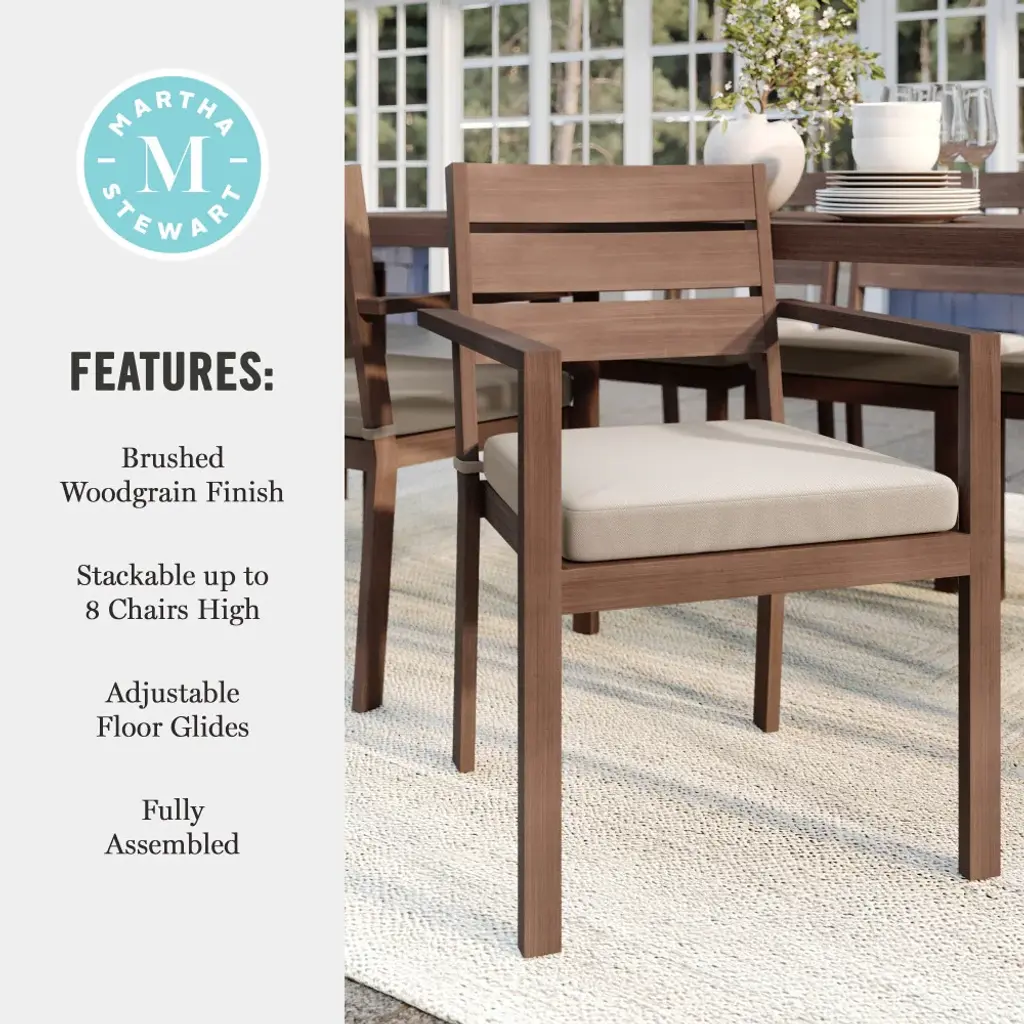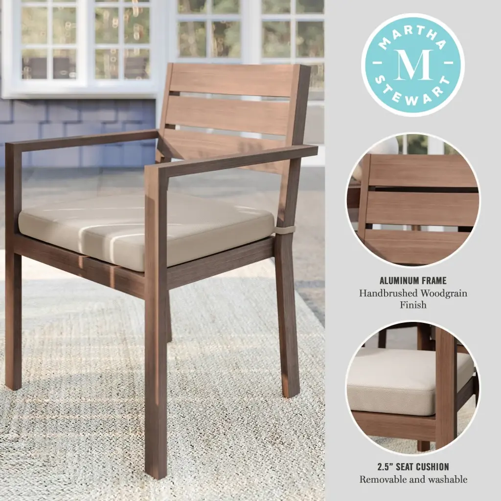 Elevate your indoor-outdoor sanctuary with the Martha Stewart Bedford Patio Dining Armchair. Masterfully crafted with a durable, rustproof aluminum frame in a beautiful hand-brushed woodgrain finish, this piece lends elegance to any occasion. All-weather materials and a recommended stack quantity up to eight chairs high deliver peace of mind and welcome convenience by making it easy to store multiple chairs and save space when not in use. The addition of a 2.5" thick seat cushion grants gracefully comfortable seating to pair with your morning coffee or a favorite novel. Part of our Bedford collection, this armchair pairs wonderfully with the coordinating armless chairs, accent chairs, barstools, and dining tables, perfect for crafting a custom collection that fits your entertaining needs. Arriving conveniently ready for use and requiring only minimal maintenance, this dining chair is a must have for everyday use as well as special occasions.Elegant indoor-outdoor dining chair that elevates any patio into a sanctuary of comfortAll-weather aluminum frame with a hand-brushed woodgrain finish lends rustic beauty2.5" thick seat cushion crafted from all-weather Olefin fabricEnjoy hassle-free, space-saving storage with a recommended stack quantity of eight chairs highPair with other pieces in this patio collection for a custom arrangement to fit your hosting needsMaximum static weight capacity: 300 lbs.No assembly requiredUse a damp cloth to wipe clean; Unzip and remove cushion cover for machine washing