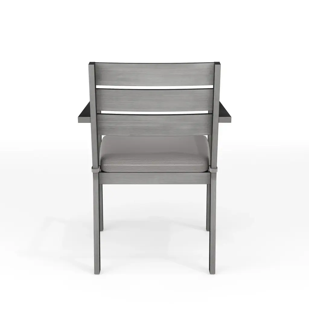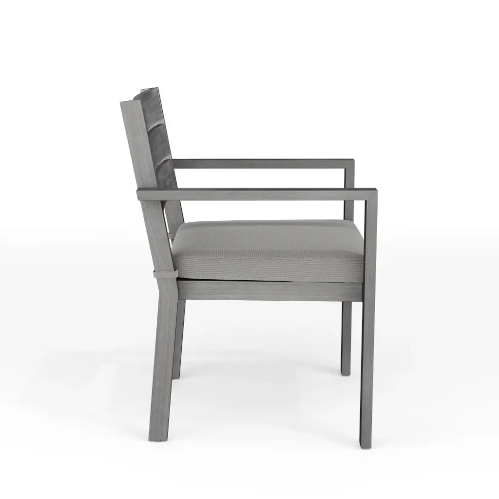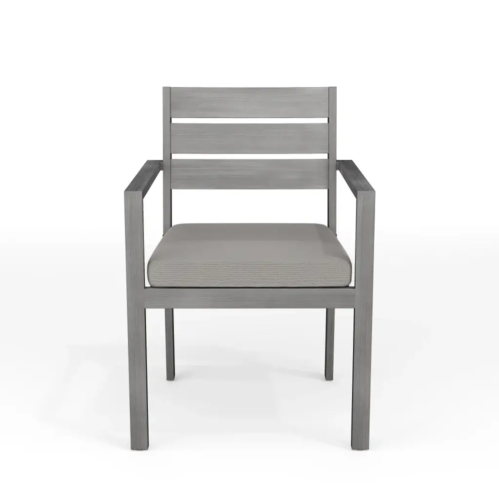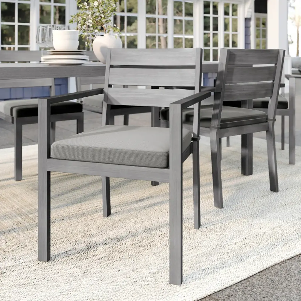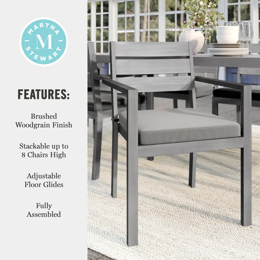 Elevate your indoor-outdoor sanctuary with the Martha Stewart Bedford Patio Dining Armchair. Masterfully crafted with a durable, rustproof aluminum frame in a beautiful hand-brushed woodgrain finish, this piece lends elegance to any occasion. All-weather materials and a recommended stack quantity up to eight chairs high deliver peace of mind and welcome convenience by making it easy to store multiple chairs and save space when not in use. The addition of a 2.5" thick seat cushion grants gracefully comfortable seating to pair with your morning coffee or a favorite novel. Part of our Bedford collection, this armchair pairs wonderfully with the coordinating armless chairs, accent chairs, barstools, and dining tables, perfect for crafting a custom collection that fits your entertaining needs. Arriving conveniently ready for use and requiring only minimal maintenance, this dining chair is a must have for everyday use as well as special occasions.Elegant indoor-outdoor dining chair that elevates any patio into a sanctuary of comfortAll-weather aluminum frame with a hand-brushed woodgrain finish lends rustic beauty2.5" thick seat cushion crafted from all-weather Olefin fabricEnjoy hassle-free, space-saving storage with a recommended stack quantity of eight chairs highPair with other pieces in this patio collection for a custom arrangement to fit your hosting needsMaximum static weight capacity: 300 lbs.No assembly requiredUse a damp cloth to wipe clean; Unzip and remove cushion cover for machine washing
