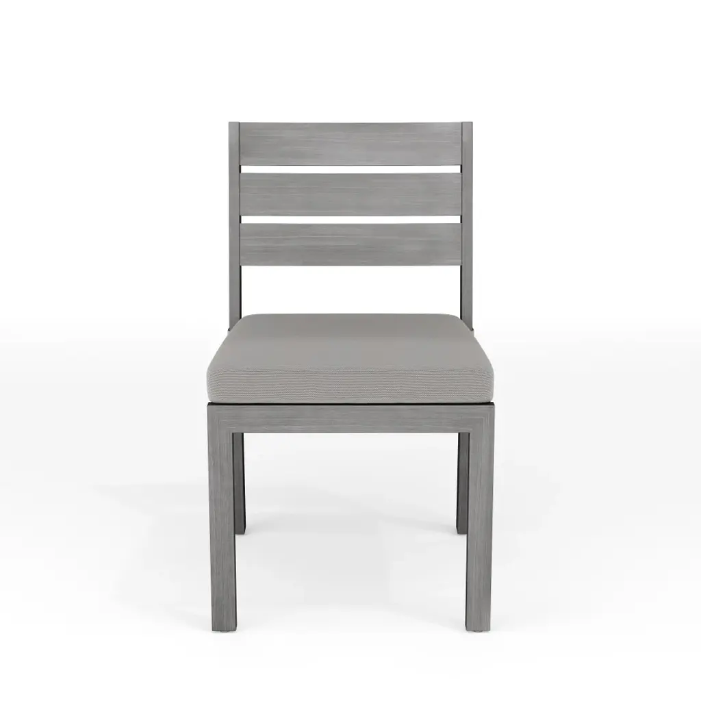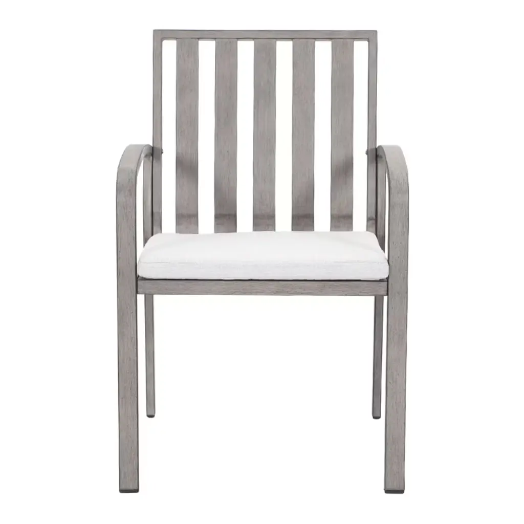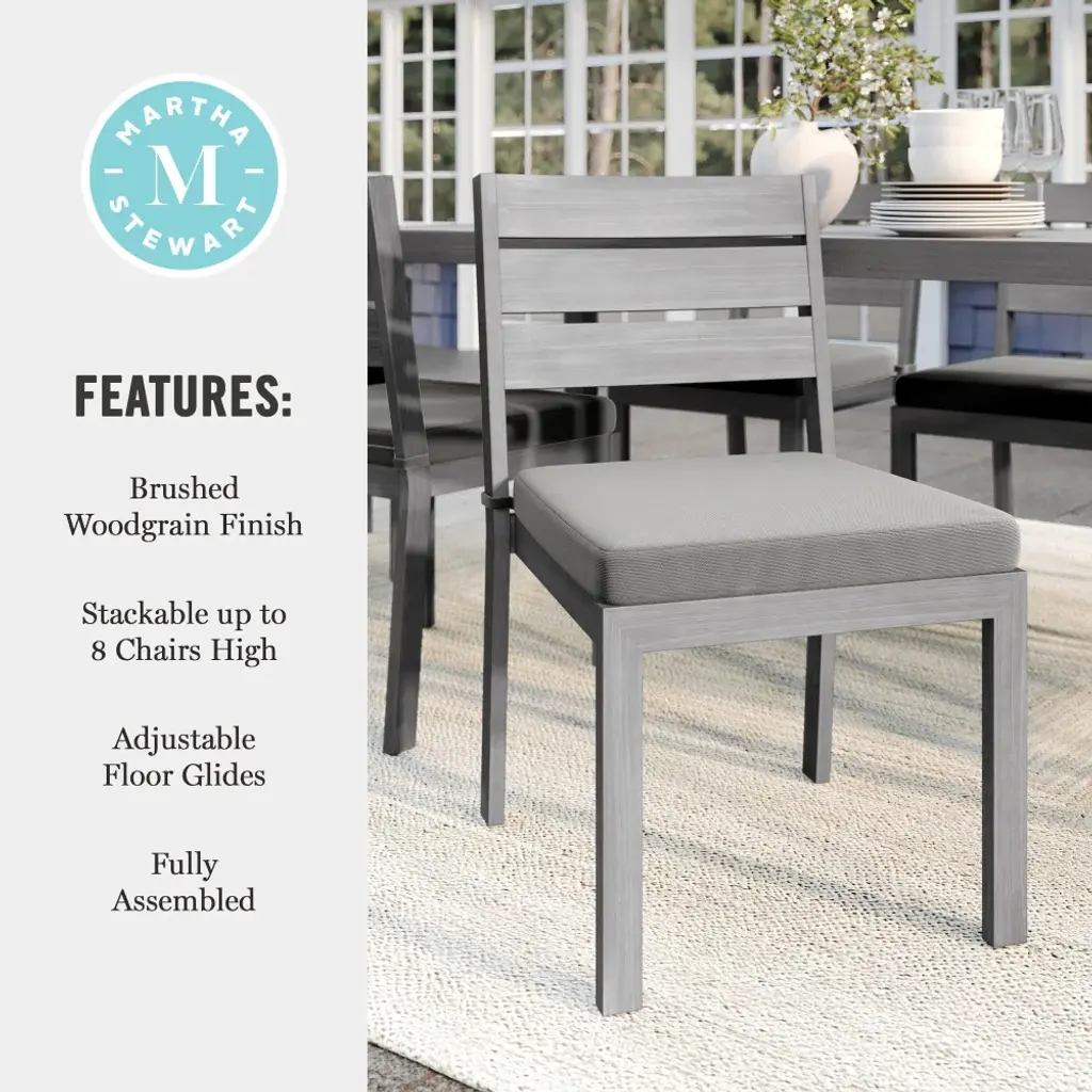 Elevate your indoor-outdoor sanctuary with the Martha Stewart Bedford Patio Side Dining Chair. Masterfully crafted with a durable, rustproof aluminum frame in a beautiful hand-brushed woodgrain finish, this piece lends elegance to any occasion. All-weather materials and a recommended stack quantity up to eight chairs high deliver peace of mind and welcome convenience by making it easy to store multiple chairs and save space when not in use. The addition of a 2.5" thick seat cushion grants gracefully comfortable seating to pair with your morning coffee or a favorite novel. Part of our Bedford collection, this armless chair pairs wonderfully with the coordinating armchairs, accent chairs, barstools, and dining tables, perfect for crafting a custom collection that fits your entertaining needs. Arriving conveniently ready for use and requiring only minimal maintenance, this dining chair is a must have for everyday use as well as special occasions.Elegant indoor-outdoor armless dining chair that elevates any patio into a sanctuary of comfortAll-weather aluminum frame with a hand-brushed woodgrain finish lends rustic beauty2.5" thick seat cushion crafted from all-weather Olefin fabricEnjoy hassle-free, space-saving storage with a recommended stack quantity of eight chairs highPair with other pieces in this patio collection for a custom arrangement to fit your hosting needsMaximum static weight capacity: 300 lbs.No assembly requiredUse a damp cloth to wipe clean; Unzip and remove cushion cover for machine washing