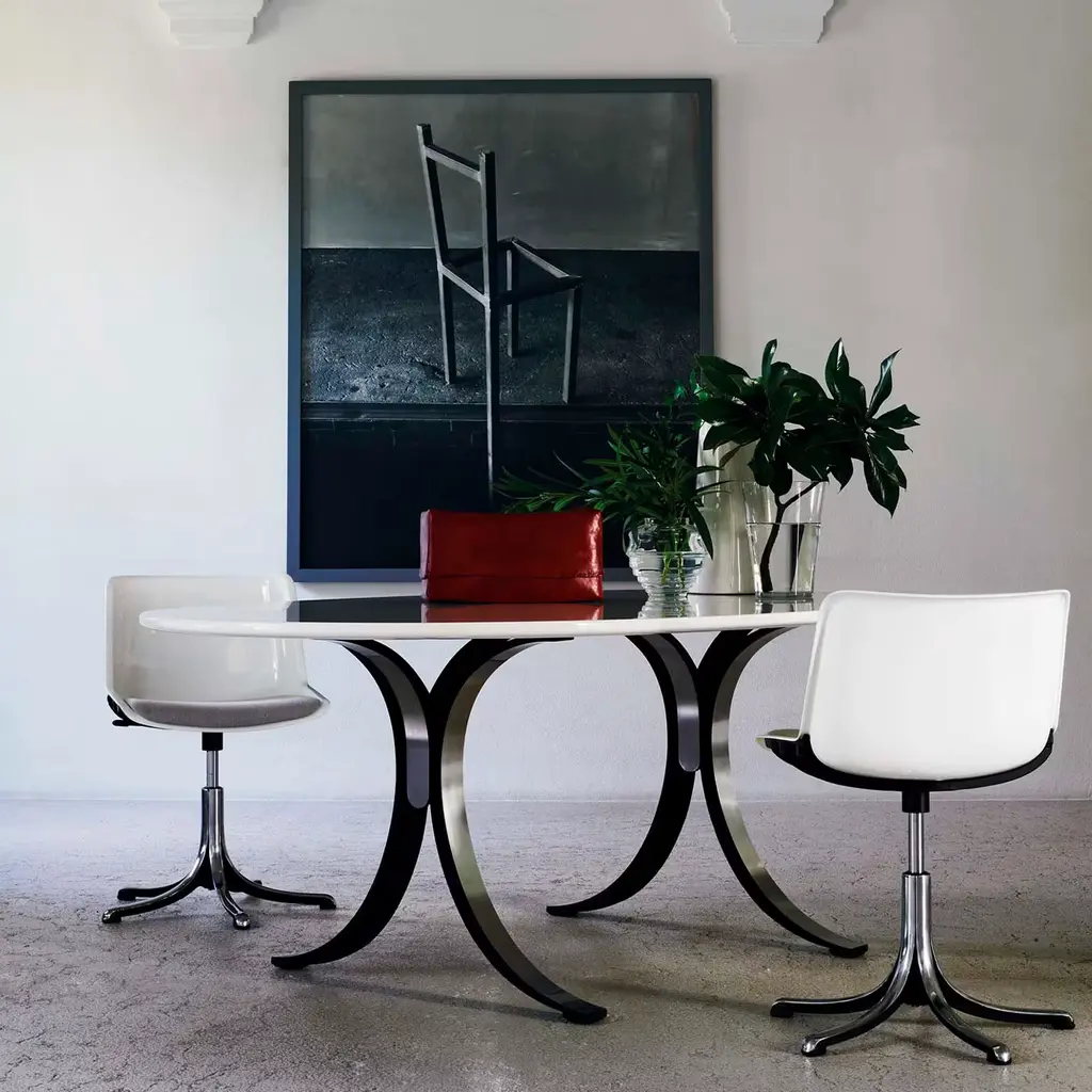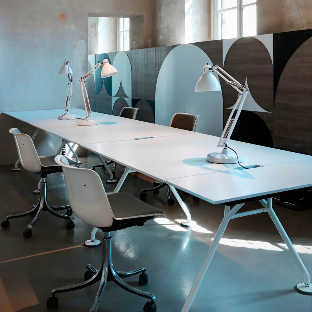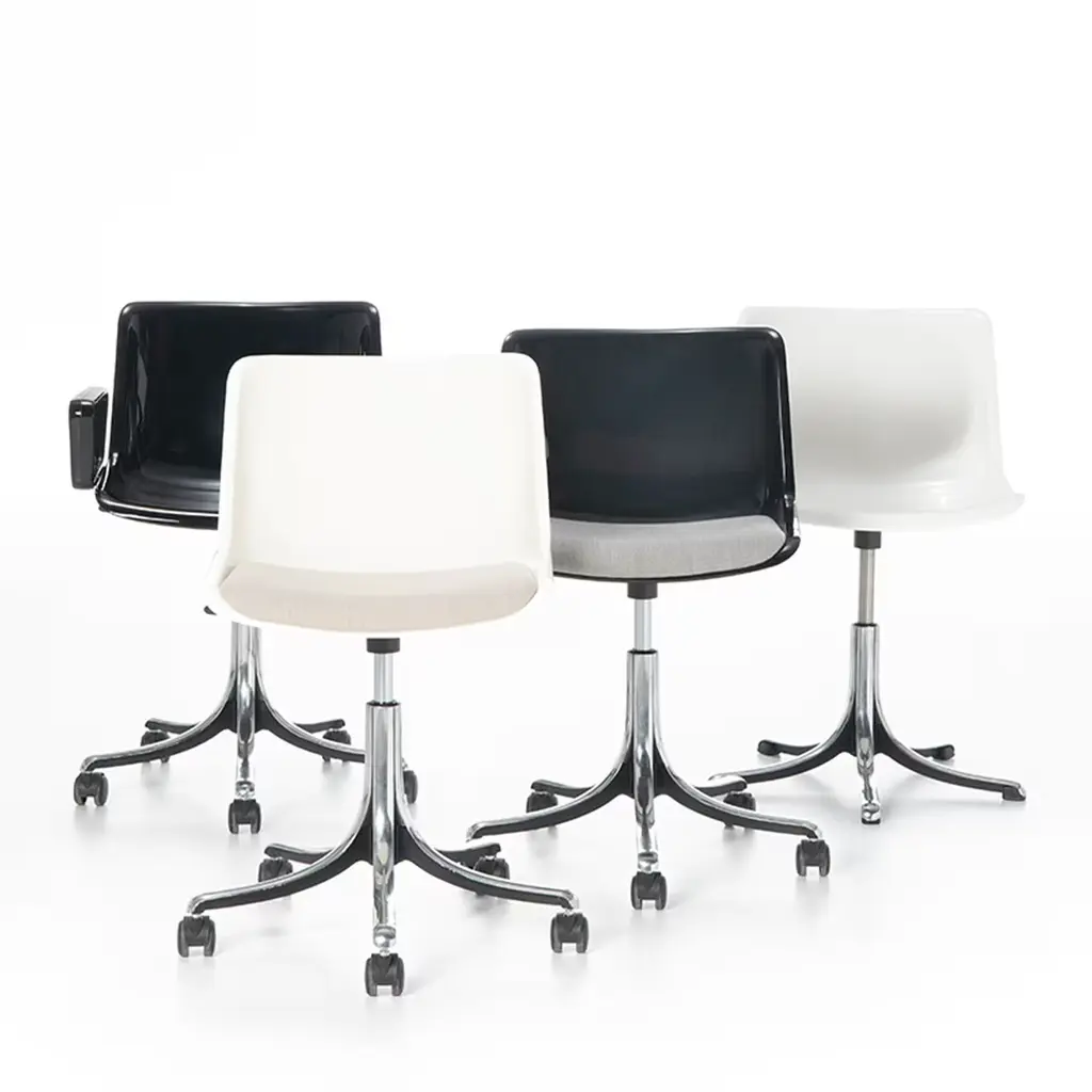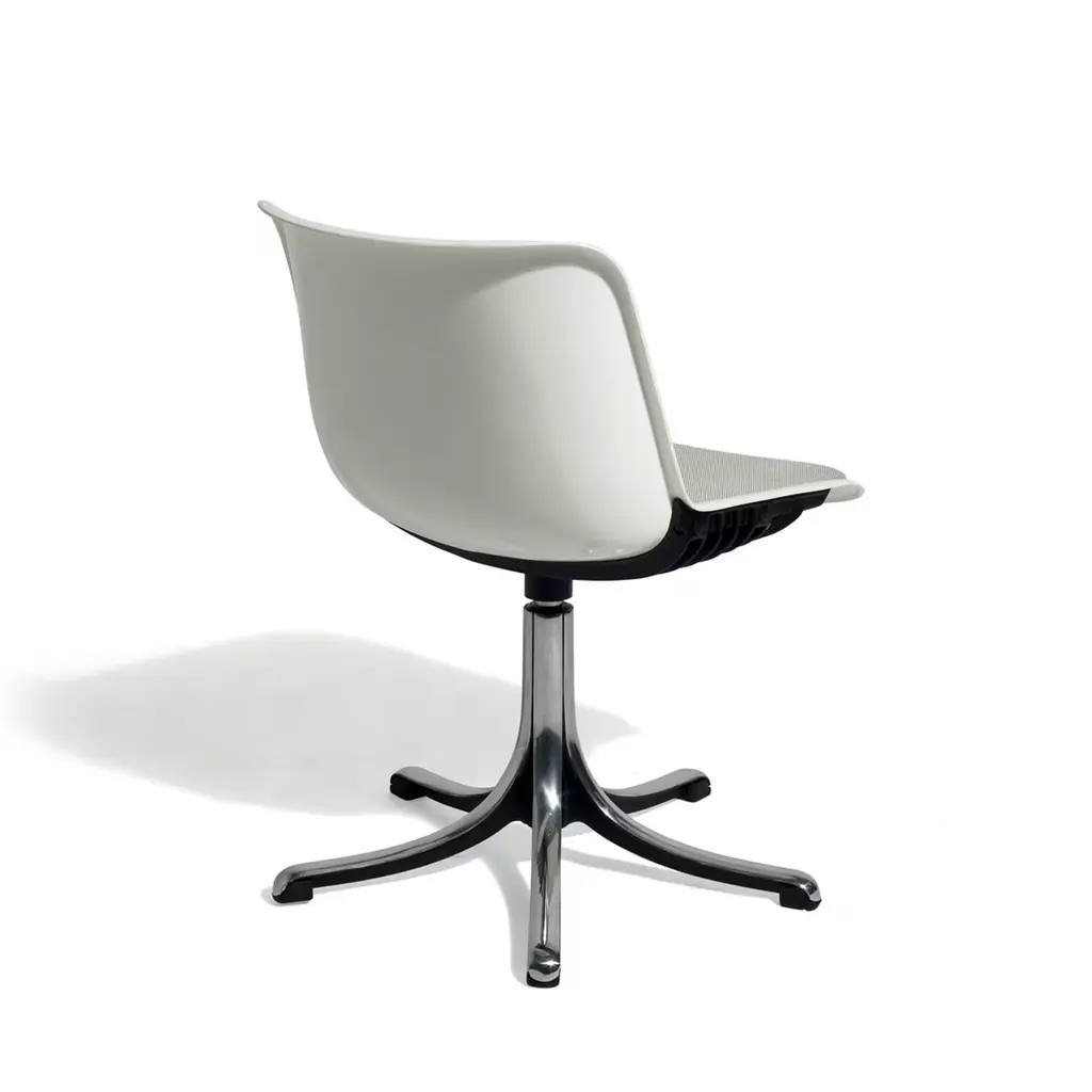 A restrained evolution of the basic model featuring a completely bare polyamide shell for the seat, this chair will suit in any sort of professional context providing a dash of unexpected comfort to the user. A five-spoke base in die-cast aluminum sustains the height-adjustable seat, whose white polyamide body is equipped with a lower cushion covered in soft, gray fabric for an improved and more relaxed seating experience.
