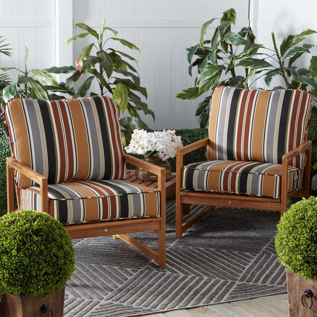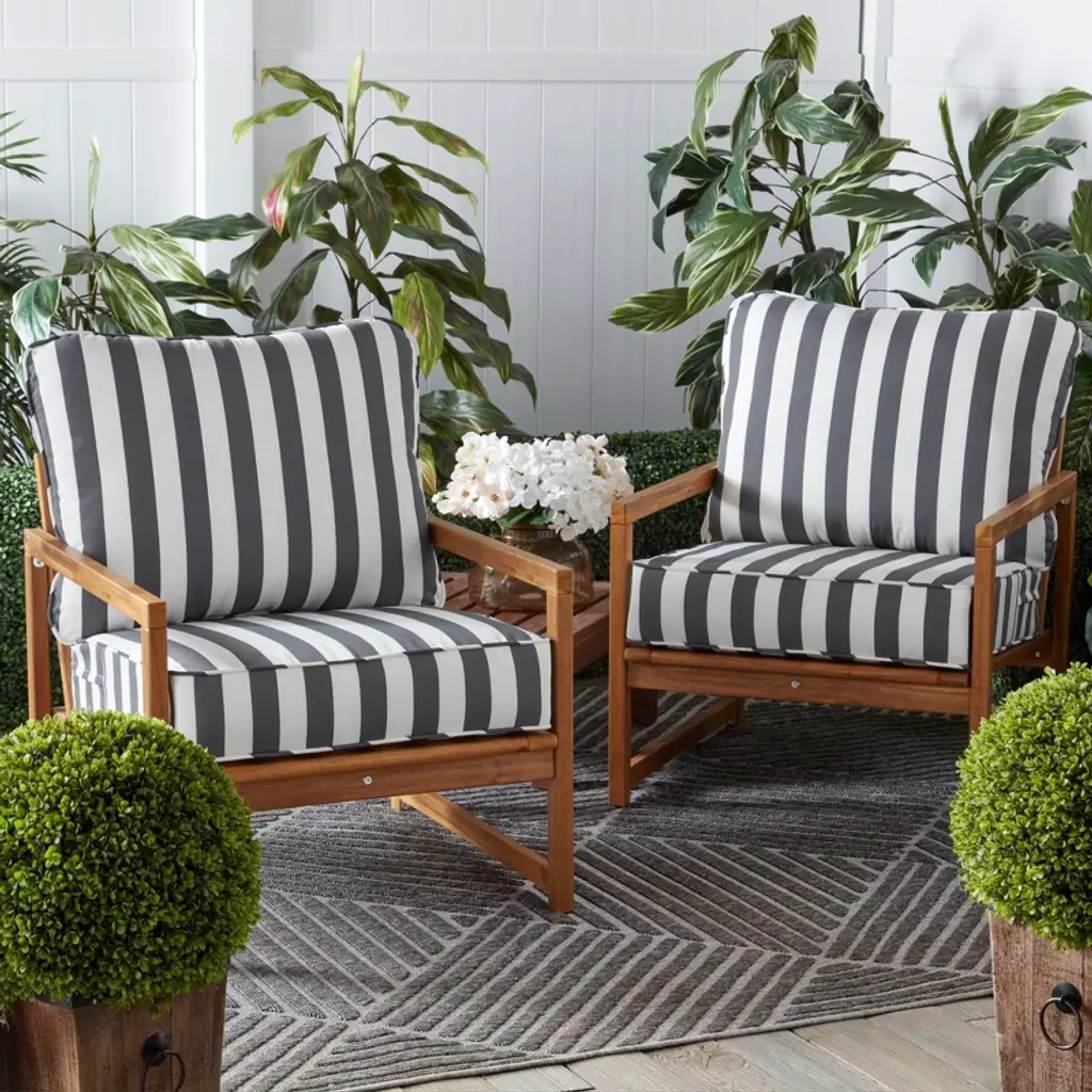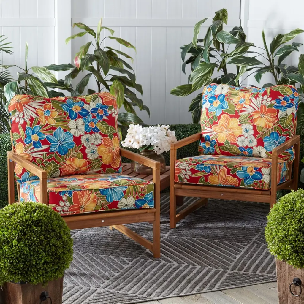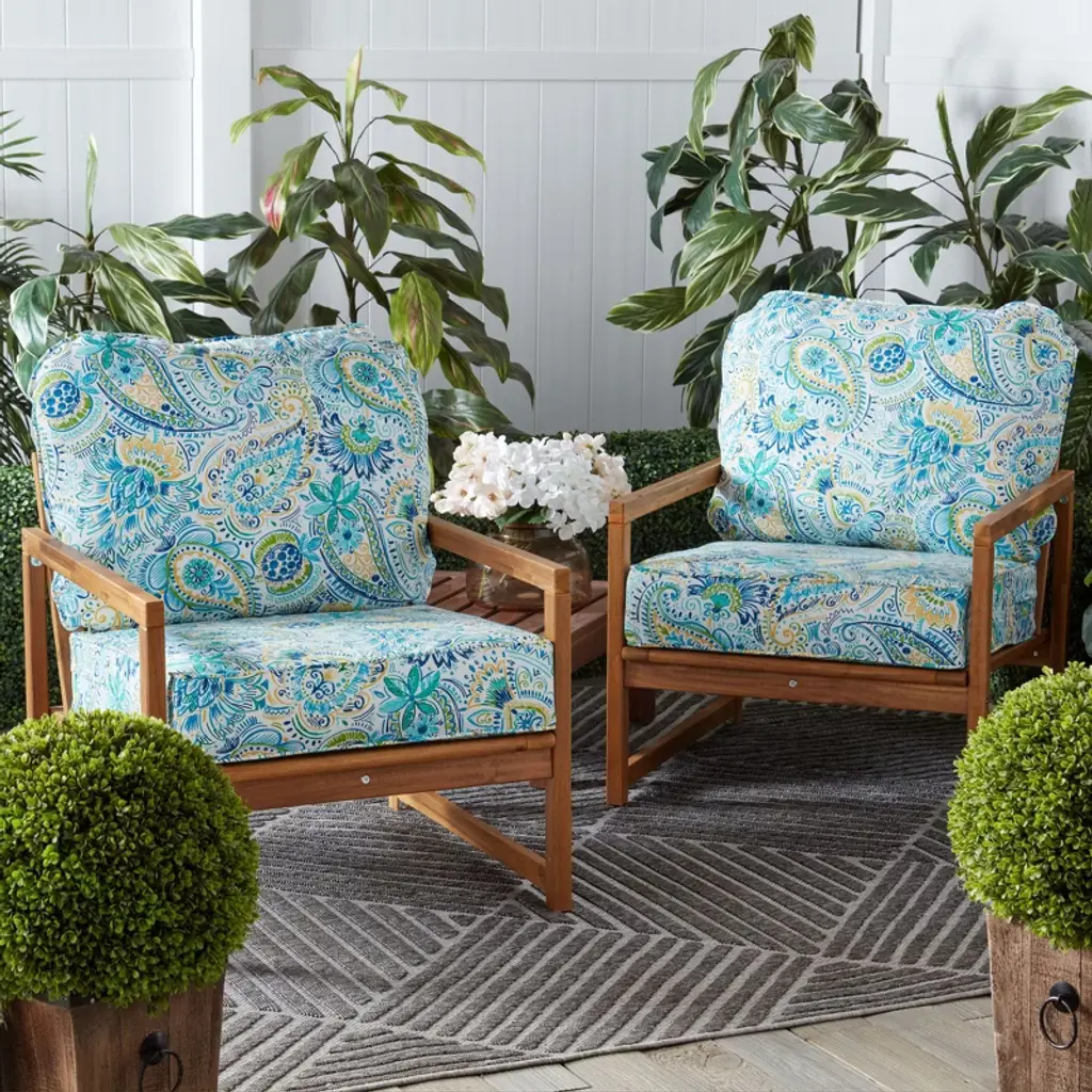 Add comfort and style to your outdoor space with this 2-piece Deep Seat Cushion set from Kensington Gardens. The set includes both a seat and back cushion, both covered in heavy-duty outdoor polyester fabric and finished with a matching cord trim for added style. Both seat and back cushions offer plush support so you can relax longer and enjoy time in your outdoor oasis. Our deep seat cushions are made to fit a variety of outdoor lounge chairs and sofas. Available in a wide variety of solid colors and vibrant prints.