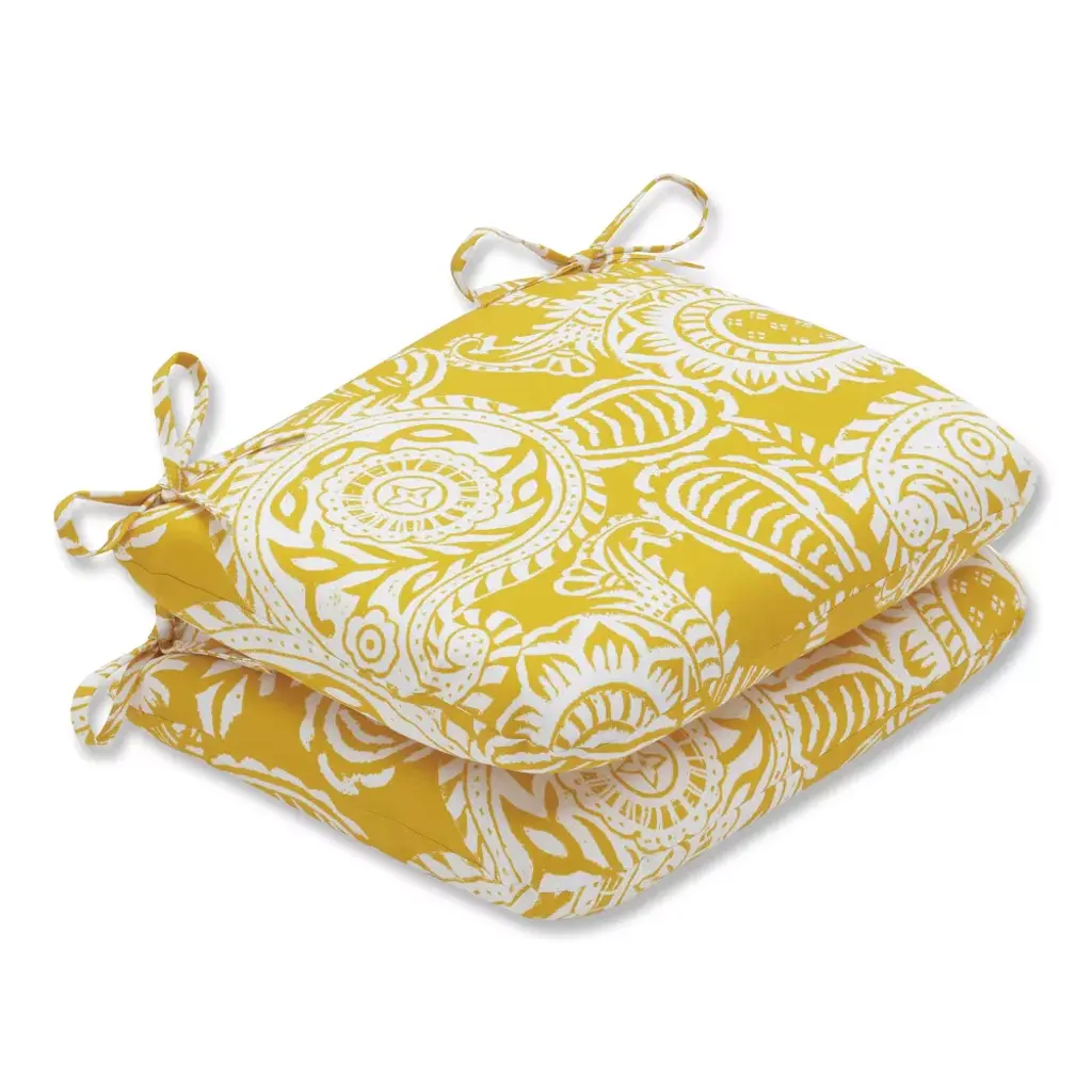 Bring fun style to your sitting area with the Outdoor/Indoor Rounded Corners Seat Cushion Set from Pillow Perfect. This set of two cushions can easily be placed on a hard chair and attached with the corner ties for a secure fit. Enjoy the comfort of this padded cushion and the vibrant pattern. The UV- and weather-resistant fabric can stand up to harsh weather and won't fade when left outside.