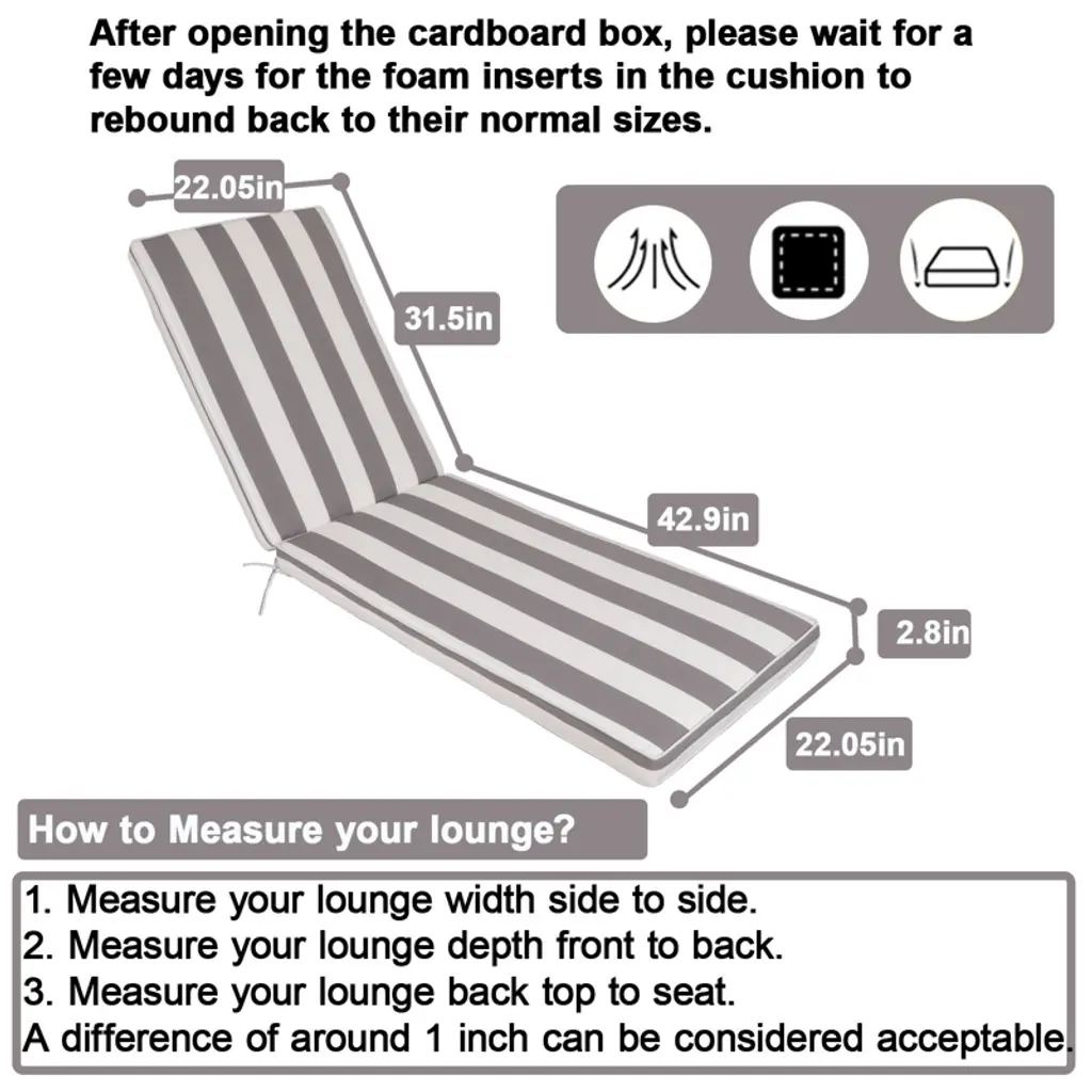 Outdoor lounge cushions feature all-weather fade-resistant fabric and removable zip-off covers for cloud-like comfort. Adjustable straps secure them to most chairs, while anti-slip anchors prevent shifting.Maintain easily with spot cleaning and air drying—effortless outdoor relaxation.
