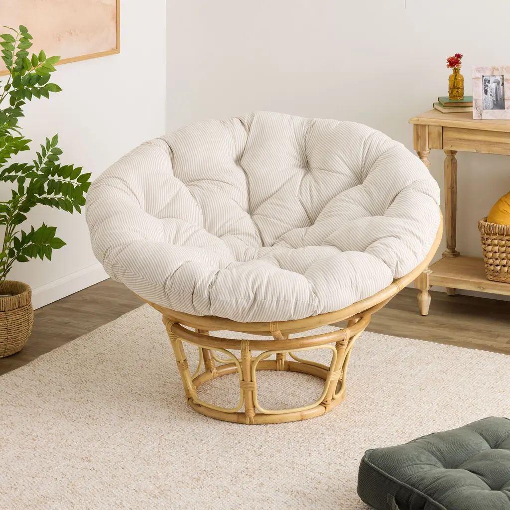 Our plush, tufted papasan chair cushion is an ultra-cozy addition to our iconic, bestselling papasan chair frame. Achieve maximum relaxation with this on-trend faux-linen cushion, decorated with neutral stripes in sand and white and supportive enough for a lazy afternoon of reading, a comforting snuggle with a pup or, a night at home watching your favorite movie. Our exclusive papasan lounge chairs and coordinating chair cushions are legends for a reason – we've crafted the best seat in the house!
