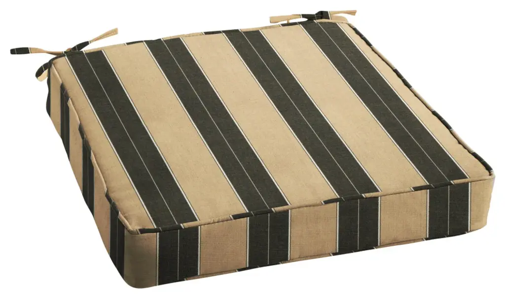 Step out on your porch or patio and start brightening it up with this beautiful new chair cushion! Featuring a stunning stripe fabric in a rich, black tan hue, this cushion will instantly enhance your space and help you comfortably enjoy the outdoors! Crafted out of a performance material right here in North America, this chair cushion is made to withstand the sun, rain and even stains so that all you have to do is sit back and relax! Sunbrella is founded on the belief that fabrics should be both beautiful and functional. We began in the 1960s with the challenge of creating an awning canvas with a substantially longer lifespan than cotton. Sunbrella has become widely adopted for shade structures, marine canvas and upholstery fabric for both outdoor and indoor applications.Our textiles are made with close attention to design detail, and engineered with robust performance characteristics that provide resistance to fading and degradation from sunlight and chemical exposure. The fabric is tactile yet durable, has industry-leading environmental characteristics, is easy to care for and offers long life wherever it''s used.No Sunbrella manufacturing facility in the world sends waste to landfills. A result of our focus on efficiency, this monumental achievement allows Sunbrella to lead by example, putting sustainability into practice every day across the globe. Our unique coloring process not only makes Sunbrella fabrics fade-resistant, it also conserves more water than conventional dyeing processes. At Sunbrella we believe it''s important to preserve the environment around our facilities. We work to conserve the plant and animal life that is native to the area and encourage our employees to plant gardens designed to provide fresh food and nourish local wildlife.We stand behind our fabrics with a guarantee that''s the best in the industry: a 5-year limited warranty for upholstery. This warranty protects the original purchaser of Sunbrella fabric. This warranty protects against Sunbrella fabric becoming unserviceable due to color or strength loss from normal usage and exposure conditions, including sunlight, mildew and atmospheric chemicals.• Ideal for casual indoor and outdoor use• Includes one (1) chair cushion• Cushion cover can be removed for easy cleaning• Available in 19 inch and 20 inch sizes• Cushion only. Furniture not included.• • Made in North America•