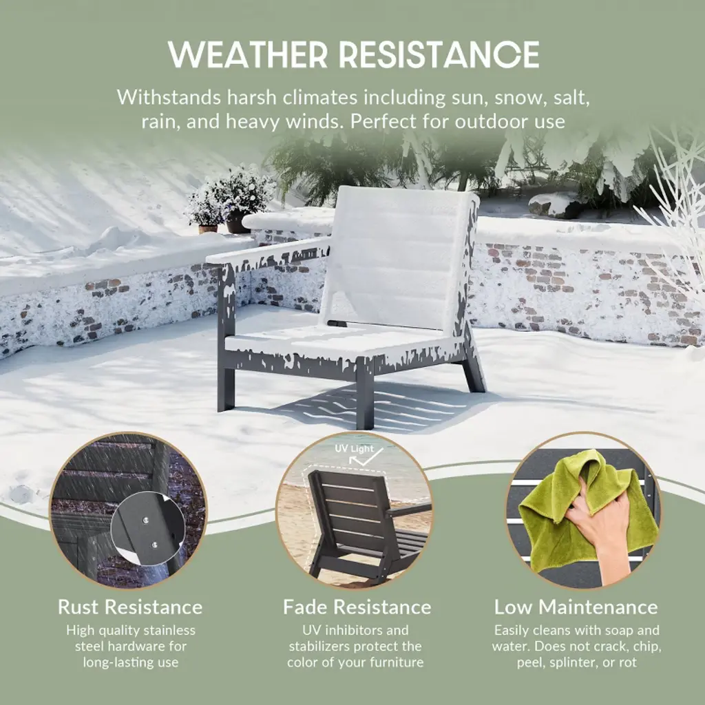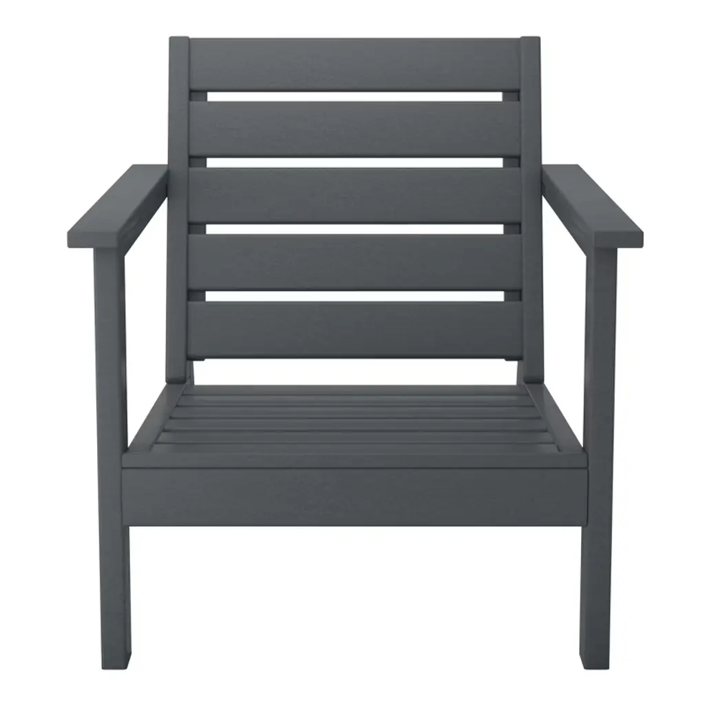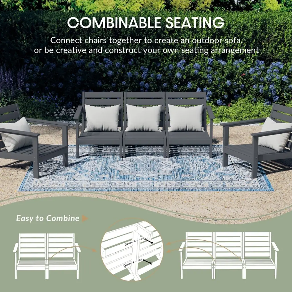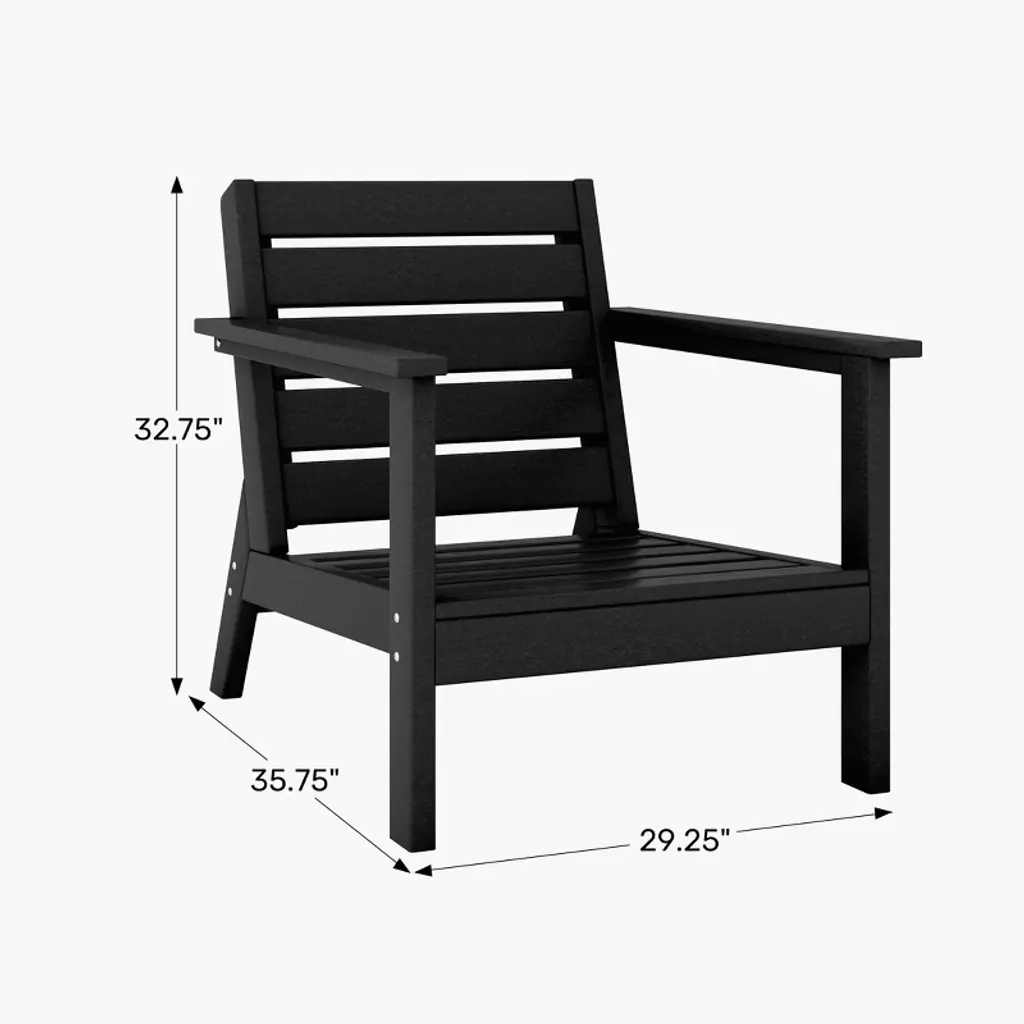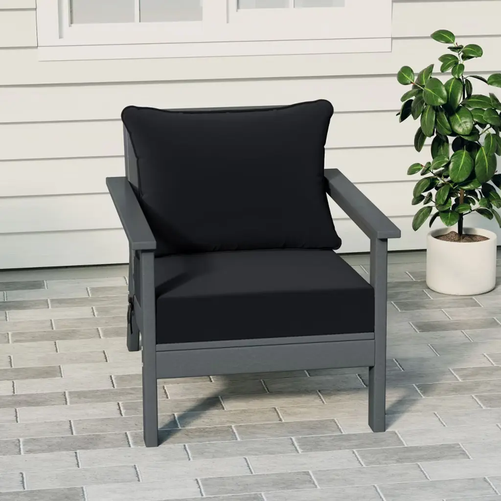 Relax by the poolside or on your patio under the stars with our charming Modern Outdoor Club Chair with Deep Seating Cushions. lounge back in bliss with the deep inclined seat rest and the slanted backrest that offers a relaxing design. our outdoor club armchair is a perfect blend of comfort and design with the durable and thick HDPE material that ensures a stable design. turn your backyard into an oasis with this patio sofa chair this season.While we strive to accurately represent product colors, please be aware that actual colors may vary slightly due to individual screen settings and lighting conditions. FeaturesSet Includes: One (1) patio club chair, One (1) deep seat back cushion, and One (1) deep seat rest cushionConstructed from robust and environmentally friendly HDPE materialWeather resistant to protect against the harsh outdoor elementsFade and UV resistant to protect against the sunInclined seat rest allows you to slide into comfortWater repellent patio cushions that allows water to bead offSolution-dyed polyester fade resistant fabric and filled with high-resilience foam for a comfortable cushionDetails:Product Type: Patio ChairsWhat's Included: (1) Chair; (1) Seat Cushion; (1) Back CushionChairDimensions: 29.25" W x 35.75" D x 32.75" HWeight: 56.75 lbs.Seat Width: 24.5"Seat Depth: 24.5"Seat Height: 11.5"Weight Capacity: 330 lbs.Seat CushionSeat Cushion Width: 25.5"Seat Cushion Depth: 25.5"Seat Cushion Thickness: 5"Back CushionBack Cushion Width: 27.5"Back Cushion Depth: 21.5"Back Cushion Thickness: 21.5"