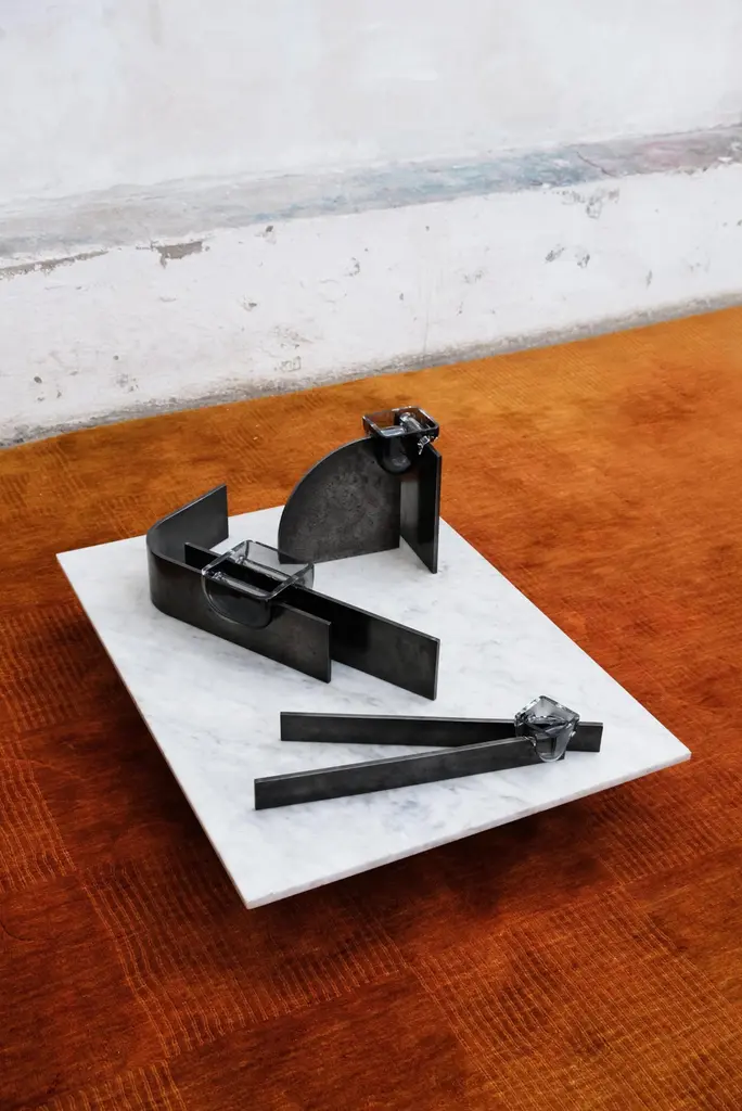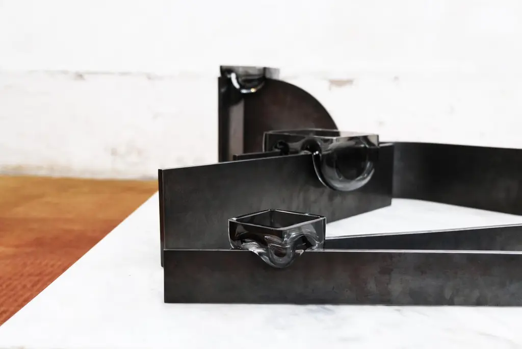 Vissio is delighted to announce the launch of 2B1G, a new series of limited-edition works produced in collaboration by: Héctor Esrawe, Emiliano Godoy, and Brian Thoreen. 2B1G (2 Bars one glass) represents an evolution of the precarious series which conceptually hinges on the beauty and anxiety provoked by glass balancing precipitously on rectilinear metallic bases. Through formal interplay of rigidity with elevated fragility, the piece highlights the materials’ physical properties. In this new iteration of the series, the team has reimagined the scale of precarious with glass hugging steel-plate bases for table-top presentation.2B1G Much in the spirit of Vissio’s collaborative approach, pieces in the 2B1G series rely on collective participation to maintain stability. There are no fasteners or glue holding the piece’s elements together. It’s the balance of forces that allows the piece to be more than the sum of its parts. 2B1G is available in three different sizes. Each work features a glass vessel floating on a two-part hand-patinated steel base. ? Each model of 2B1G is limited to an edition of 20 plus 2 studio proofs.