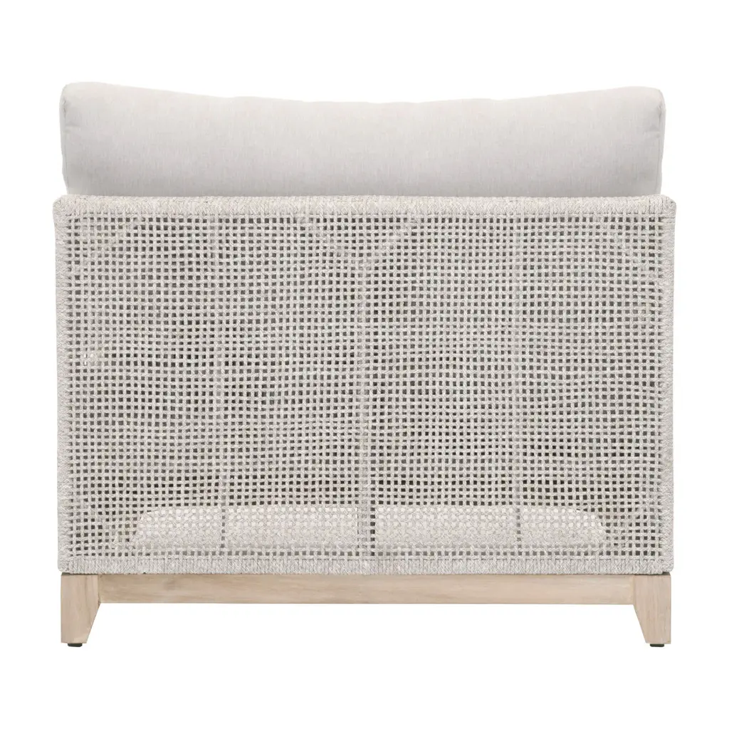 Transitional style outdoor modular 1-seat armless sofa chair featuring an intricate rope weave design and solid teak base. FEATURES & BENEFITS Dimensions: W:39" D:34" H:33" Modular Sofa System Intricate Rope Weave Design Solid Teak Base Removable Upholstered Cushions in Weather Resistant Fabric Removable Cushions Not Intended for Heavy Rain or Extreme Weather - Store Away When Not in Use U-Shape Clamp Connectors Included MORE DETAILS Materials: Solid Teak Wood, Aluminum, Polyolefin Rope, 100% Olefin Fabric, Foam Seat Height: 18" Seat Width: 39" Seat Depth: 17" Seat Depth (without Back Cushion): 27" Free Shipping & delivery in the continental U.S. Woven Collection's "Gray Teak" is solid teak wood finished with a solution that expedites the aging process of teak to a natural silver tone. Over time, the natural weathering of Gray Teak will cause its appearance to change in color and texture, with possible marks and cracks. By ordering Gray Teak, you accept these characteristics and agree that no claim will be approved regarding the natural aging process of teak or the special color qualities associated with the Gray Teak finish. Special care should be taken to protect this natural finish