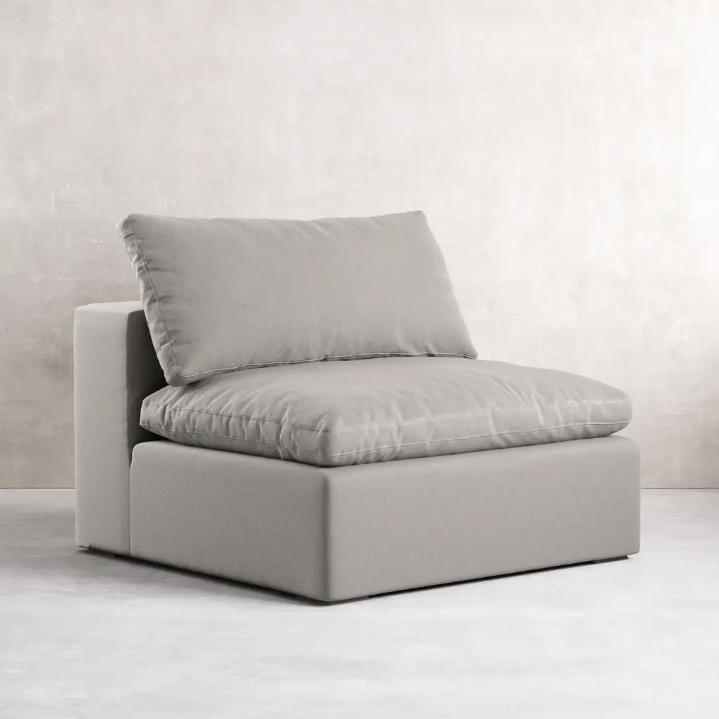 With a name that will inspire you to bring friends and family together, our Gather modular armless chair invites you to get comfortable and stay a while. Create a configuration that suits your space and enjoy the generous size and plush design of this component. Loose, reversible cloud-like cushions ensure even wear, longevity and easy cleanability, and a seat featuring foam encased in feather blend provides sink-in luxury.