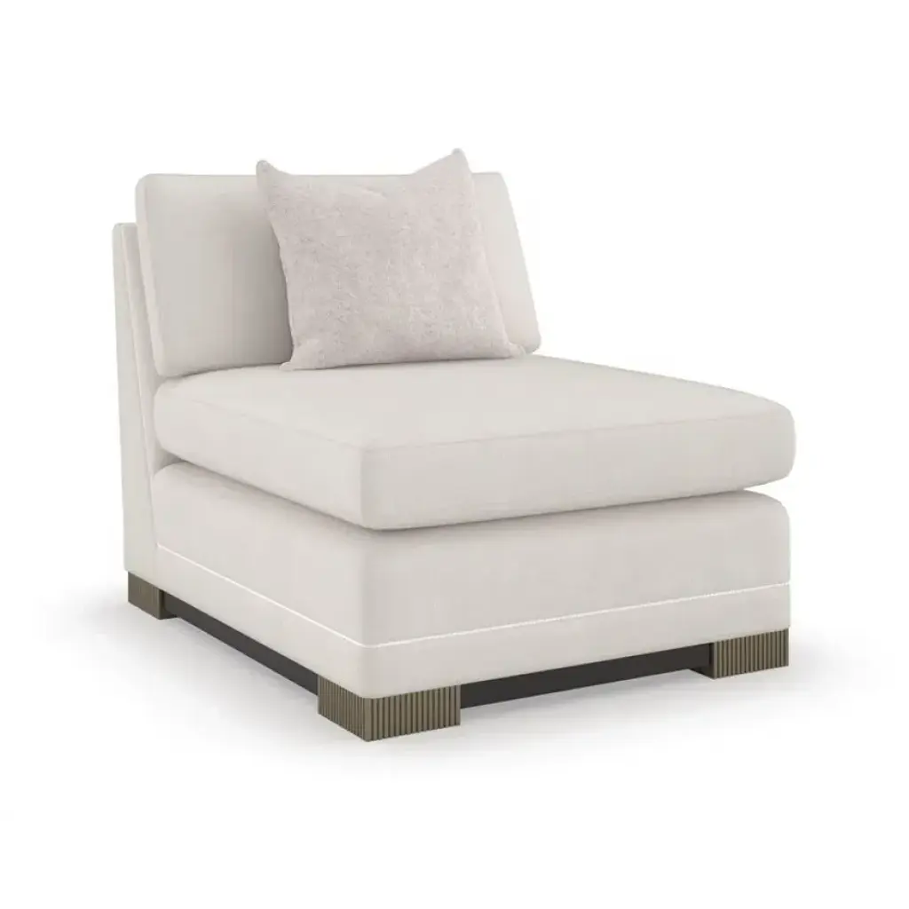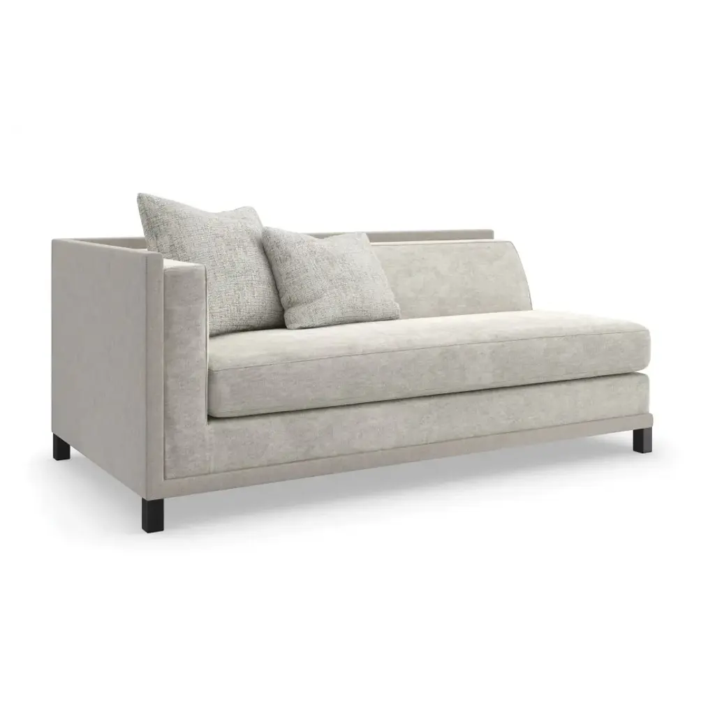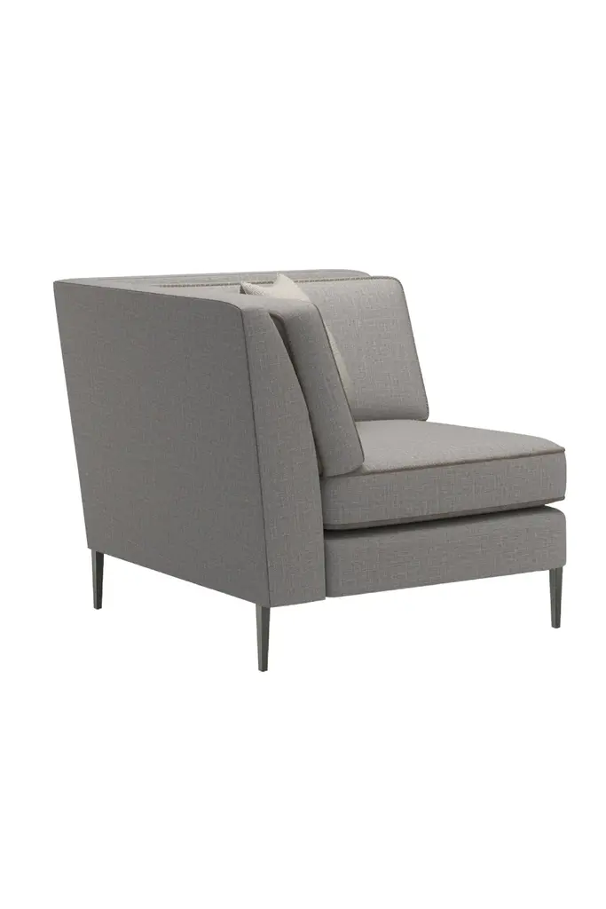 If an updated sectional is what you need for seating flexibility, we have a stylish piece that uses a mix of textural materials for classic appeal. Start with the Remix Sectional piece that affords a clean silhouette updated with a suspended frame, slim tapered metal legs, decorative leg brackets and loose seat and back Blendown cushions. A track arm is on the left side of the piece. This silhouette is upholstered in a grey wool blend woven with a contrasting tan leather welt.