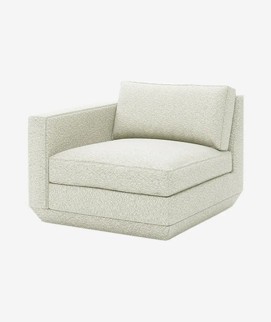The Podium Modular Collection is an adaptable seating system that brings modern elegance and luxurious comfort to any space. The Podium features seven core components (Right Arm, Left Arm, Armless, Corner, Ottoman, Left Lounge and Right Lounge) that can be arranged in unlimited configurations to suit any vision or layout. Components can then be easily reconfigured or added later to adapt to your evolving lifestyle. Each component showcases a relaxed silhouette inspired by 1970’s Modernism: a low and deep sit created by plush seat and back cushions (filled with eco-friendly synthetic down derived from recycled water bottles), and an attractive, subtly angled, chamfered base.