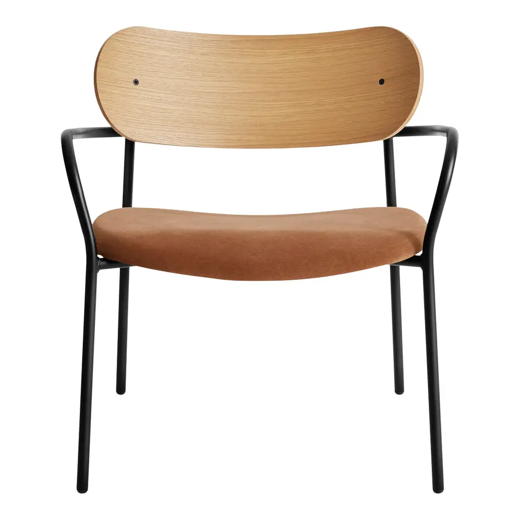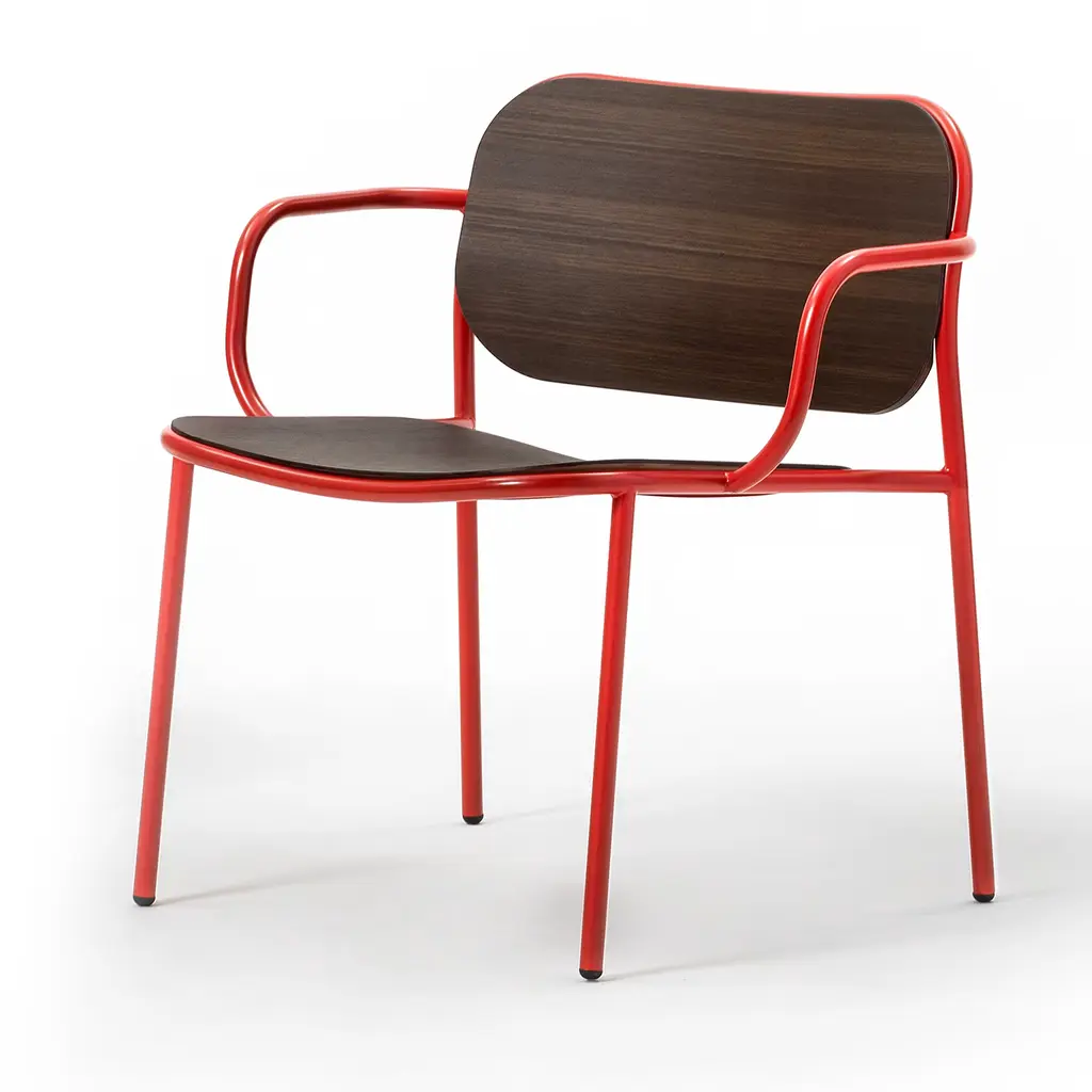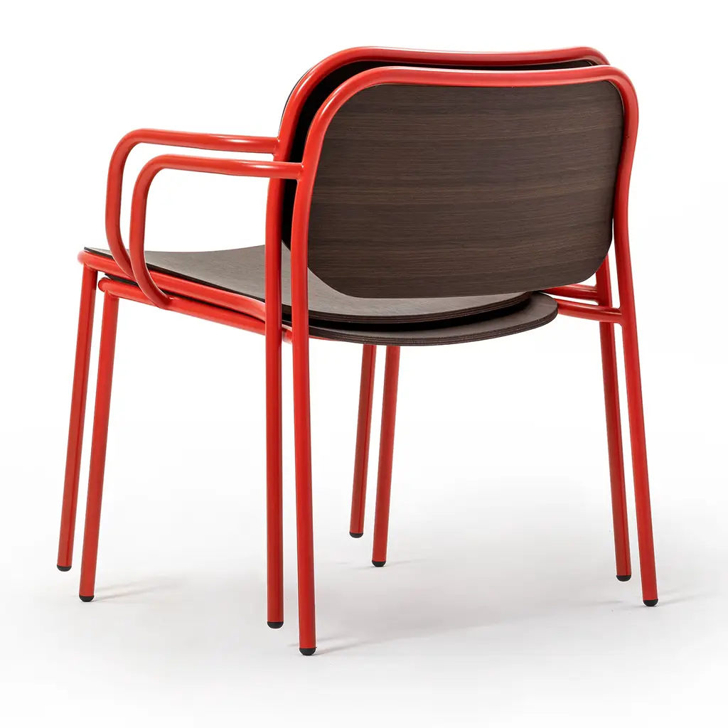 A sleek design perfect for adding a pop of color in minimalist or monochromatic spaces, this chair stands out for the sharp conflict between the red-lacquered tubular metal frame and seat and backrest in heat-treated oak. It will make for an eclectic addition to stylish professional decors. Please inquire with the Concierge for details on the versions with seat and backrest in ash, light oak, or black aniline.