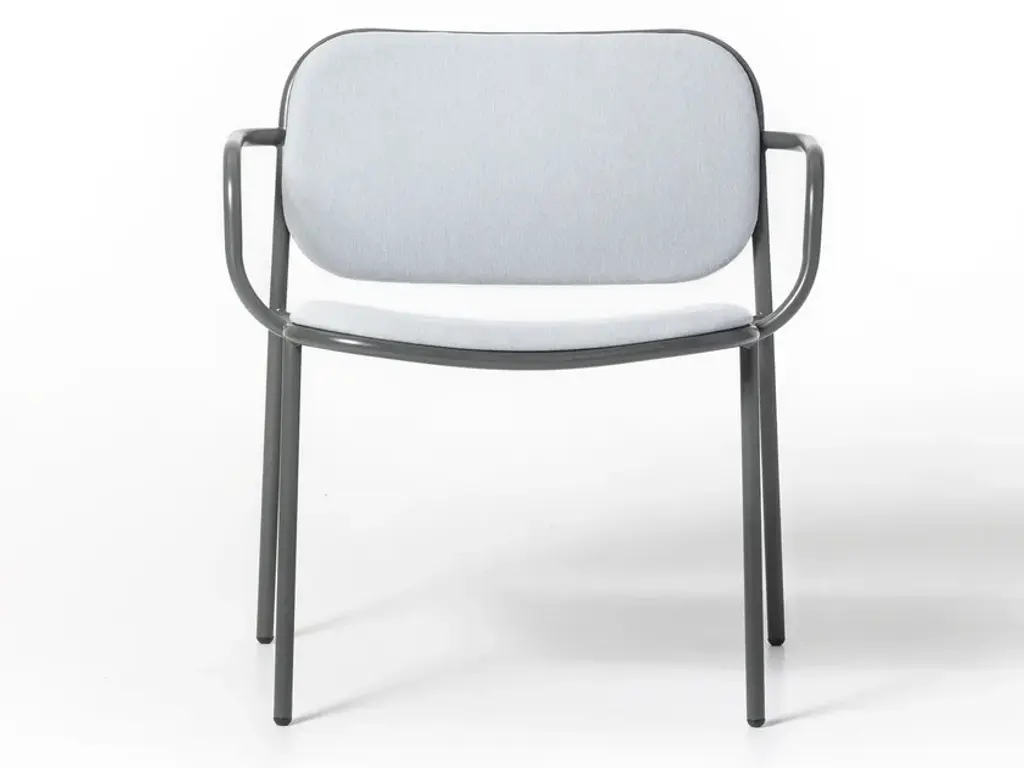 This padded chair from the Metis Collection embodies a harmonious synthesis between minimalism and comfort. Ideal to complement offices or waiting rooms, it features a sleek cylindrical metal frame lacquered in gray (RAL 7043) whose padded seat and backrest are flanked by curved, incorporated armrests. A light-toned fabric completes this design also available in a chair counterpart.