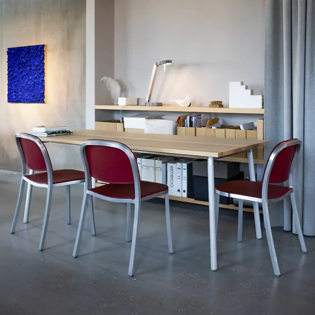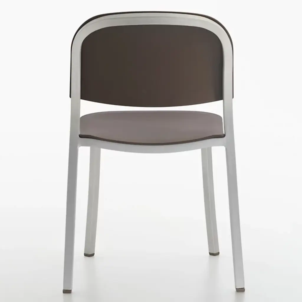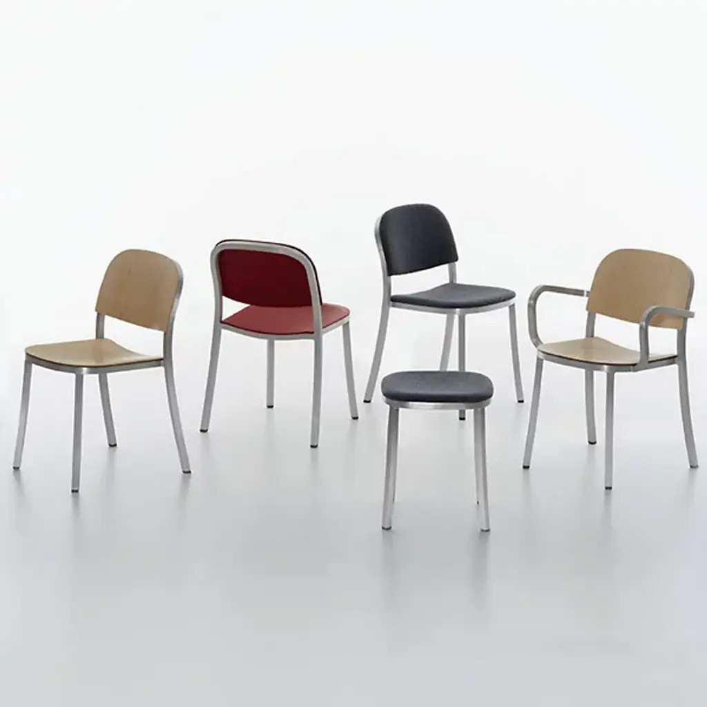 Pull up the 1 Inch Stacking Chair by Emeco and you'll see it stands out for its simplicity and strength. Handcrafted of recycled aluminum, it’s sturdy, lightweight and ideal for eating areas or offices. The slightly curved backrest and seat make sitting at a table or desk comfortable. It conveniently stacks six chairs high for effortless storage and mobility. With its timeless design and a choice of seats, this furniture is perfect for contemporary spaces.