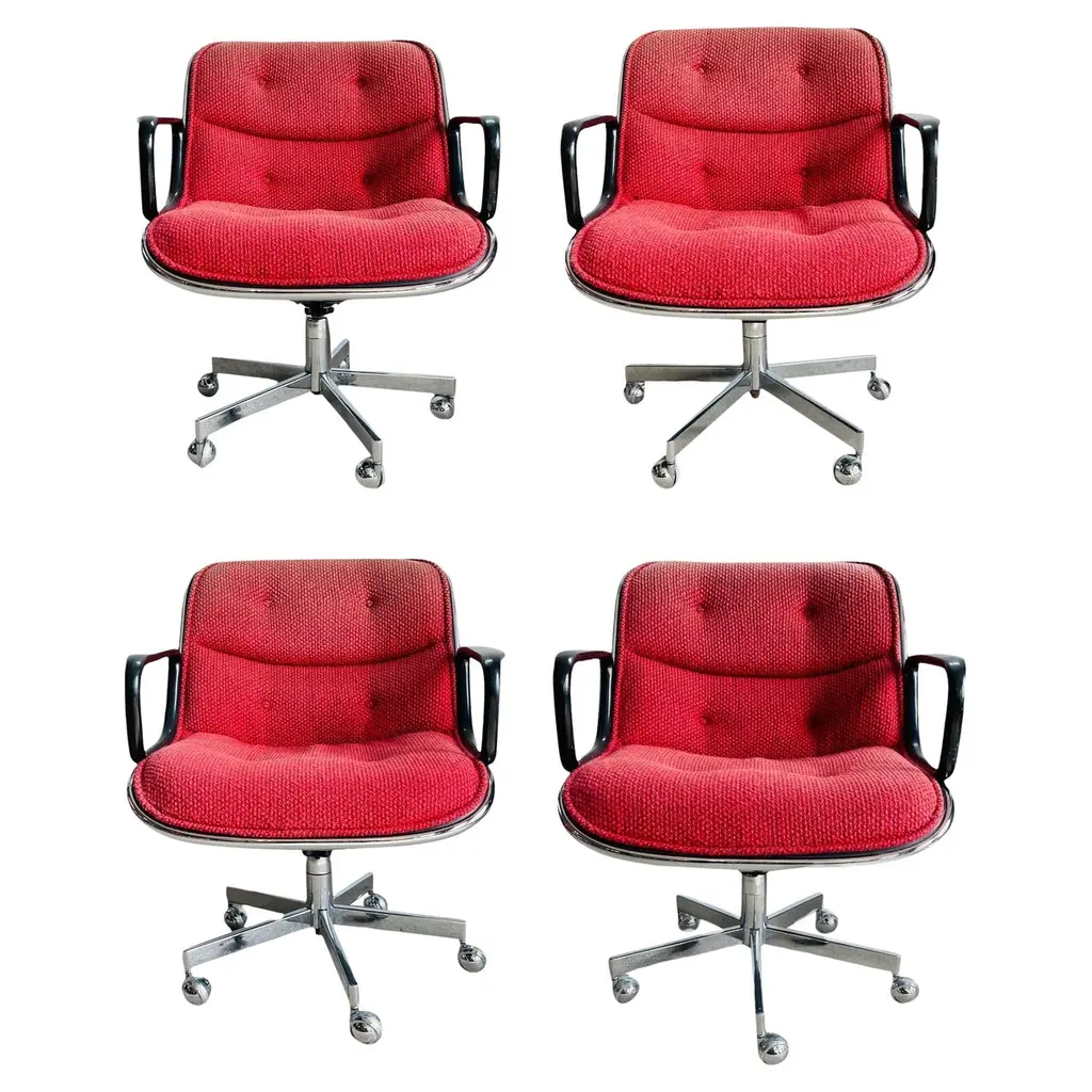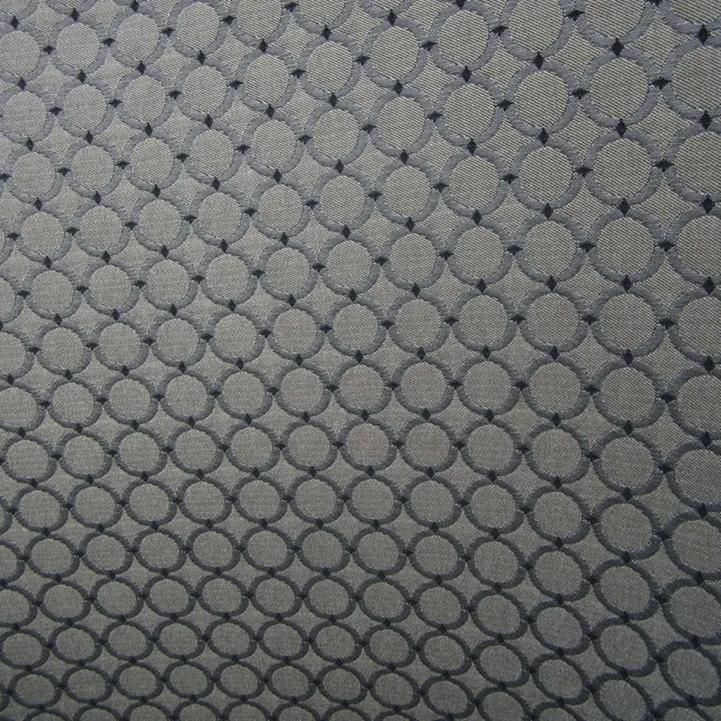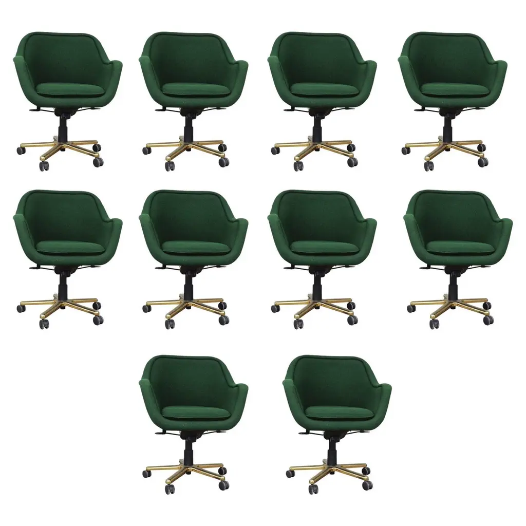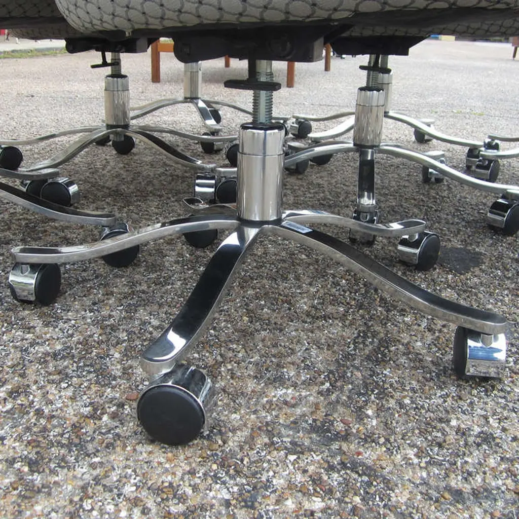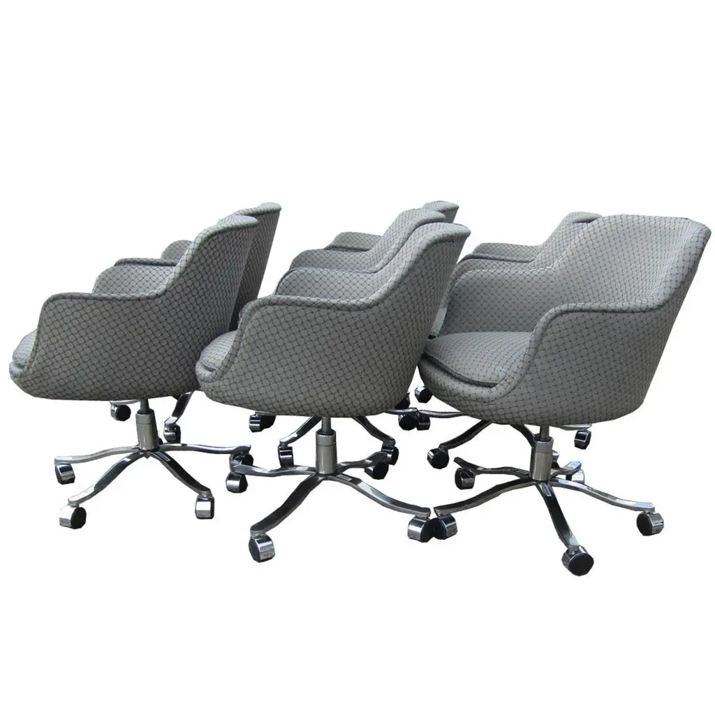One bucket chair by Nicos Zographos. These chairs have a five star steel base on coasters and the upholstery is a gray fabric with circle patterns. These timeless chairs would look great in any modern space. Multiple available.