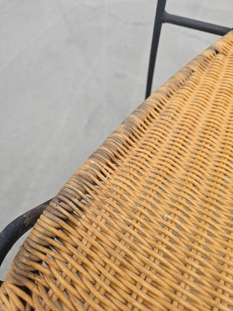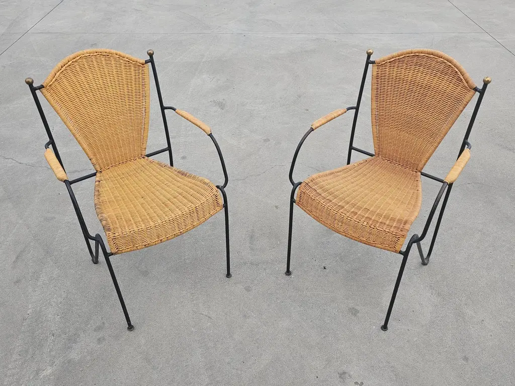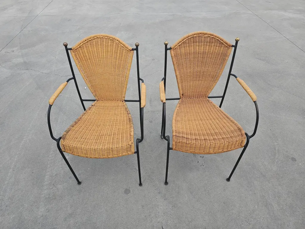 In this listing you will find Mid-Century Modern chairs designed by Frederic Weinberg, the renowned US designer. Chairs are made of wrought iron and wicker, with brass details on the backrests, which makes them stand out. Chairs are in good vintage condition with some visible signs of time and use. Apart from some patina, there are scratches on rattan as well as some discolorations, as well as the areas where the black paint has peeled off due to their age. Wicker is very well preserved otherwise and very sturdy. No restoration has been done on these chairs.The chairs are stackable.In addition to 6 chairs with armrests, there is an additional 16 chairs without armrests available. Please see the video.