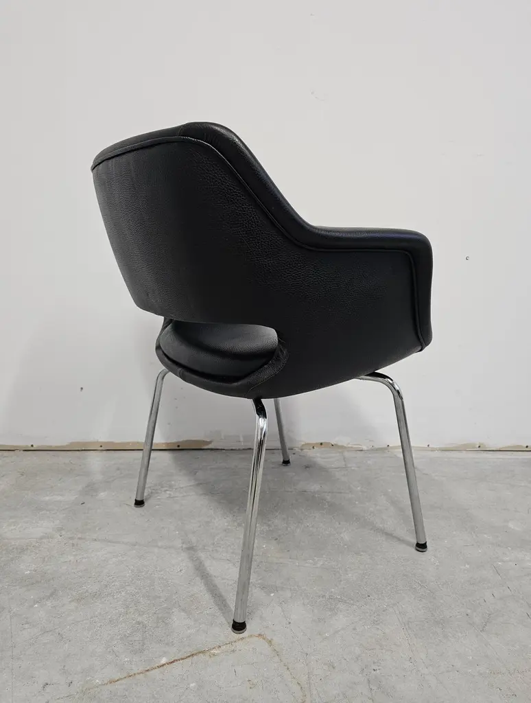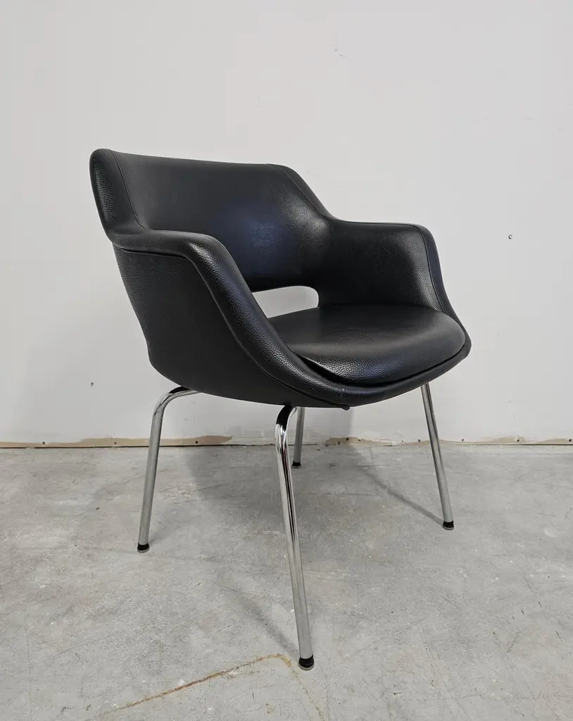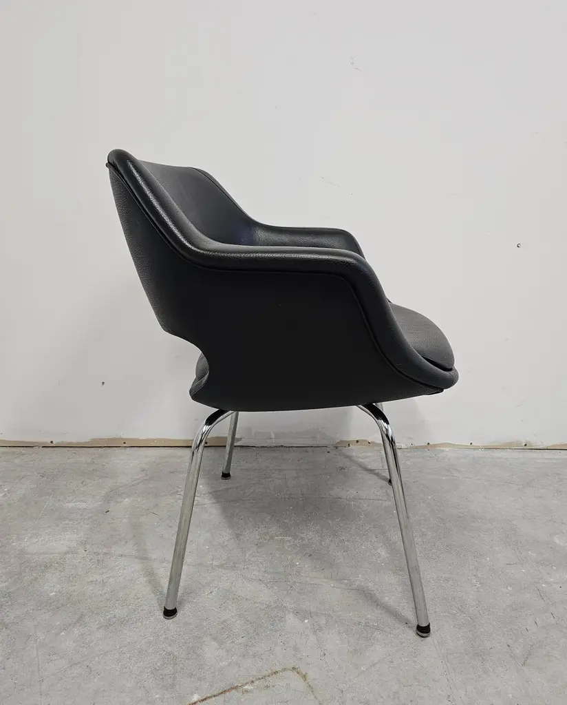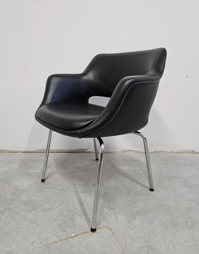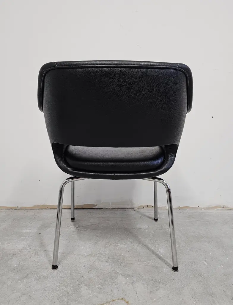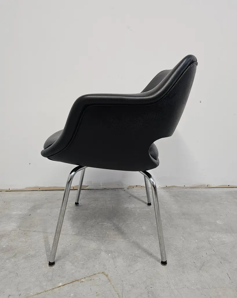 In this listing you will find an elegant and sleek Kilta armchair done in black leather and chrome plated steel. It was designed by Finnish designer Olli Mannermaa for Martela in Italy. The Kilta chair is a Finnish design Classic. Kilta’s timeless design and very comfortable seating guarantee its continuing popularity. It is a popular vintage product from the Mid-Century modern era, a testimony to its quality, durability and timelessness. Designed in 1955 in Italy. Manufactured in 1970s.Very good vintage condition with very few signs of time and use.10 chairs available.When purchased the chairs will be carefully wrapped up and packed in a way to avoid any damages in transport. As soon as shipped you will receive the tracking number for your package. If you have any additional questions regarding this piece please feel free to contact me. Happy shopping!