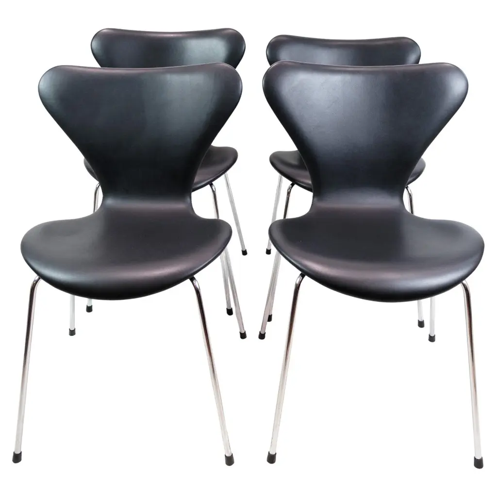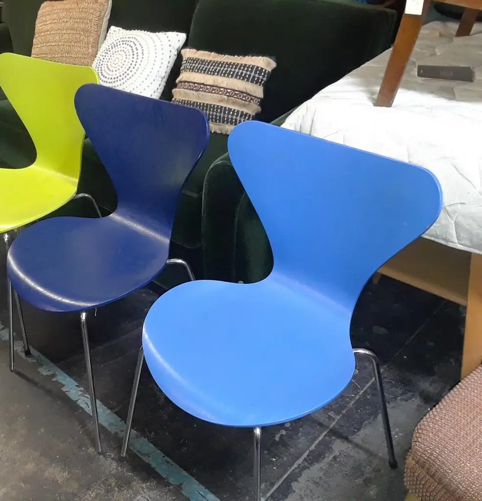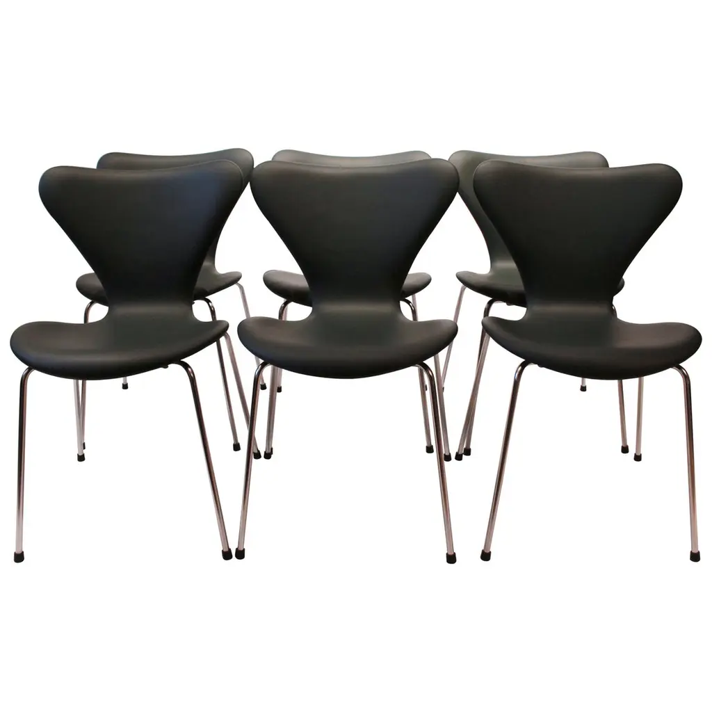 Arne Jacobsen Denmark (1902-1971) Arne Jacobsen bought a plywood chair designed by Charles Eames and installed it in his own studio, where it inspired one of the most commercially successful chair models in design history. The three-legged Ant chair (1951) sold in millions and is considered a classic today. It consists of two simple elements: tubular steel legs and a springy seat and back formed out of a continuous piece of plywood in a range of vivid colors. Vintage mid-century modern Series 7 chairs by Arne Jacobsen for Fritz Hansen. All chairs are made of pressure-molded sliced veneer. Bases are made of chromed steel tubes. Price is per chair.6 Light blue 10 Dark blue