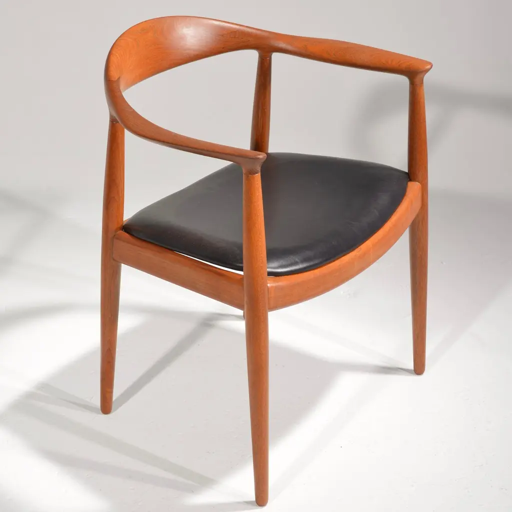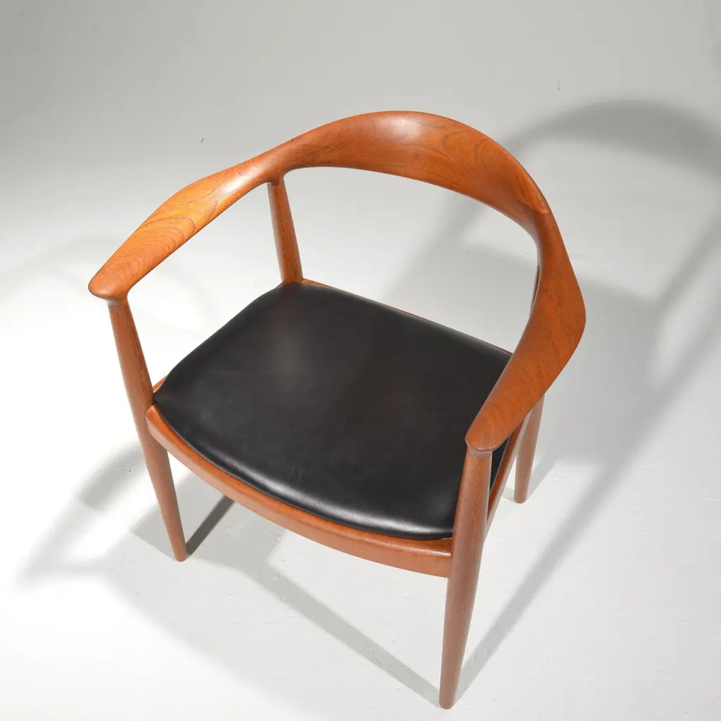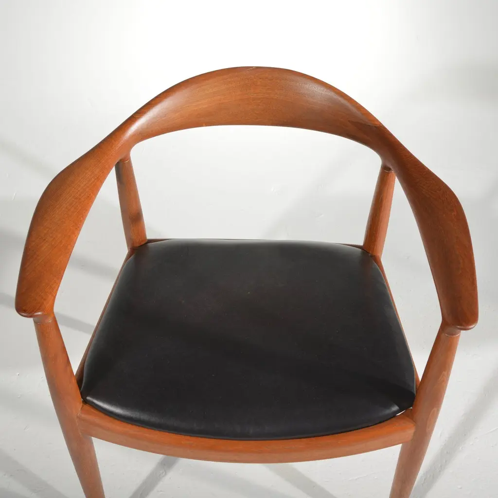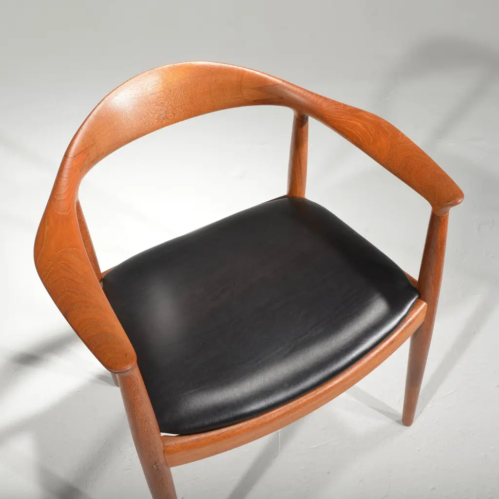 We are excited to offer 4 early Hans Wegner JH-503 chairs designed in 1949 and Produced by Johannes Hansen. Fully restored solid old growth teak construction. Stamped with the maker's mark. Currently we have 10 upholstered in black leather and one in white leather.