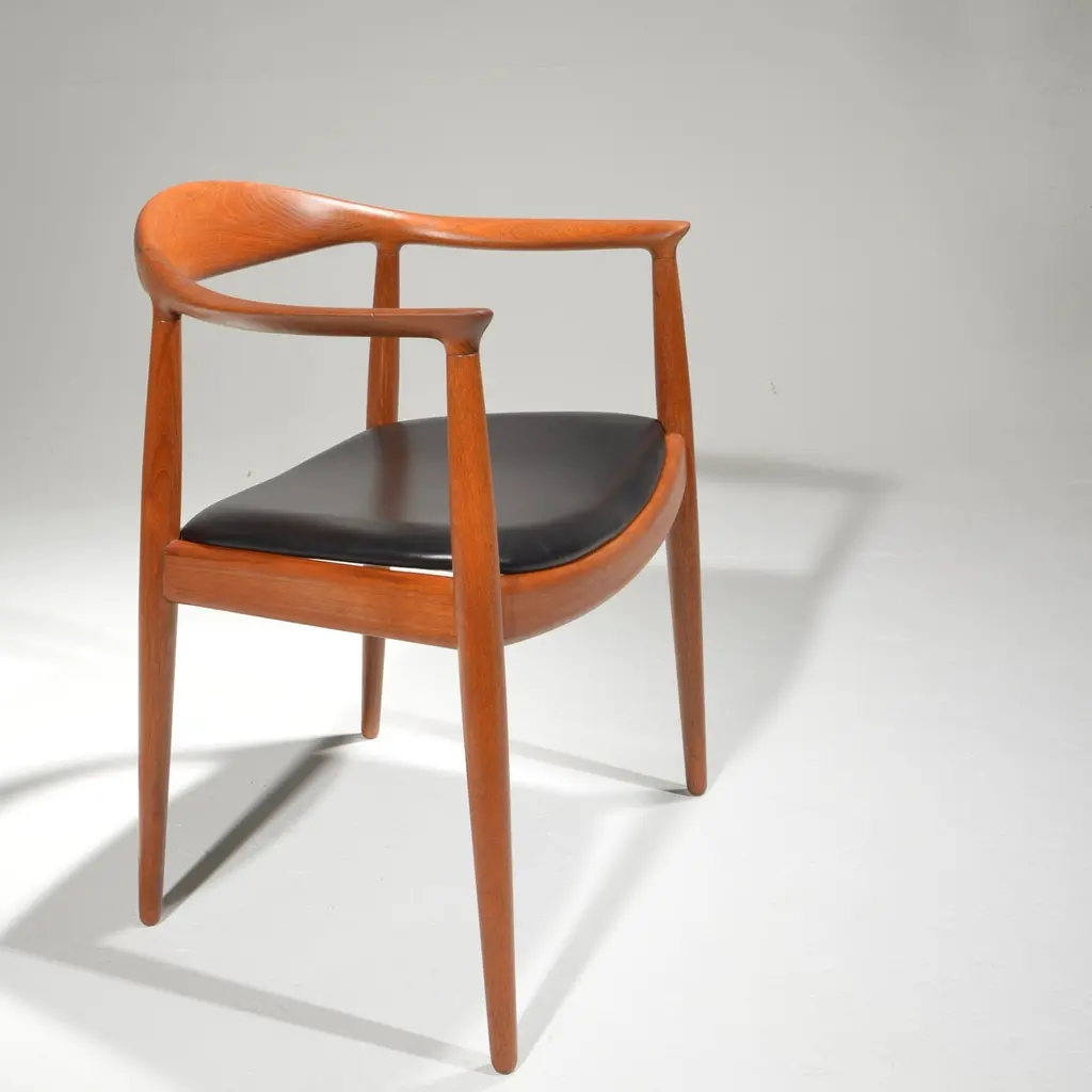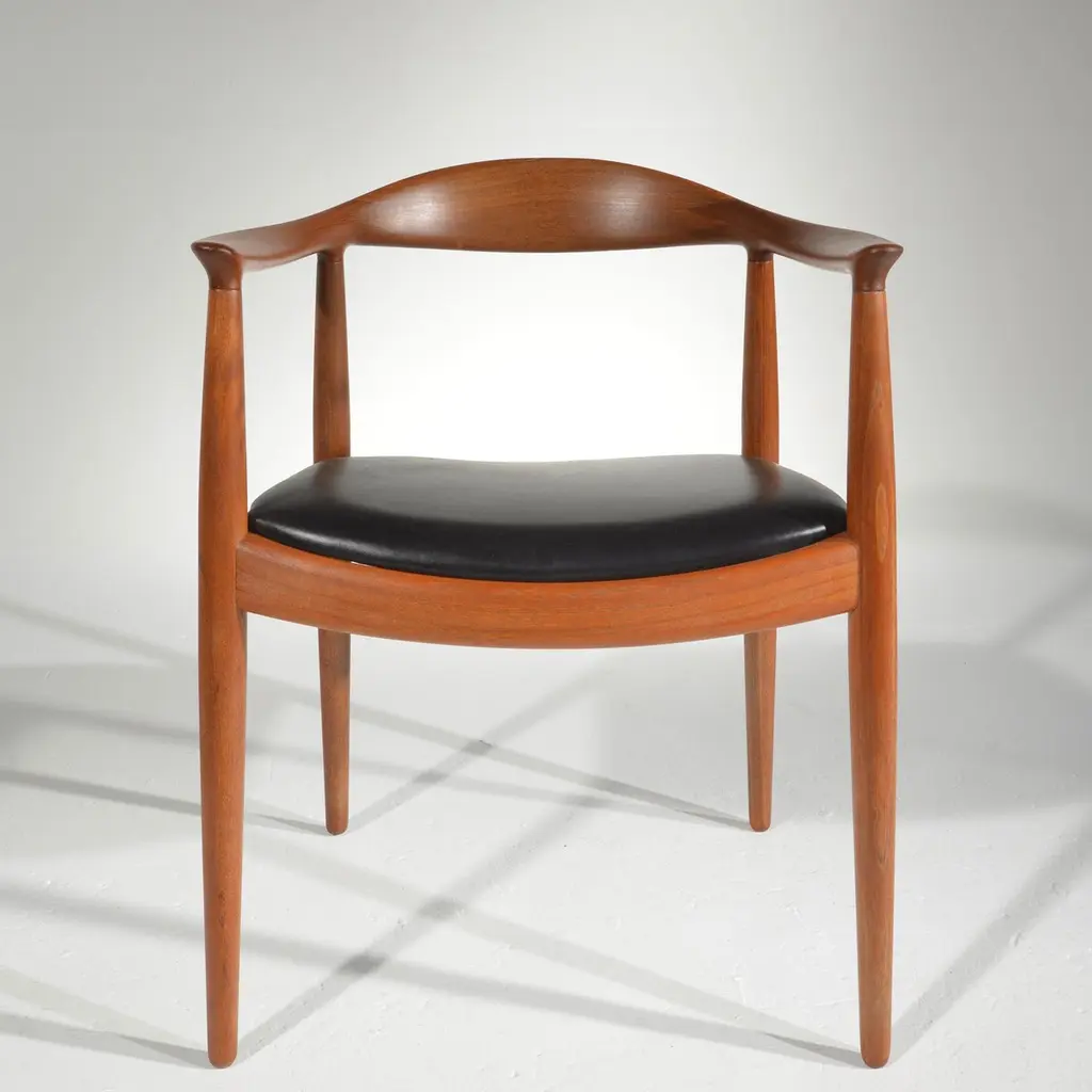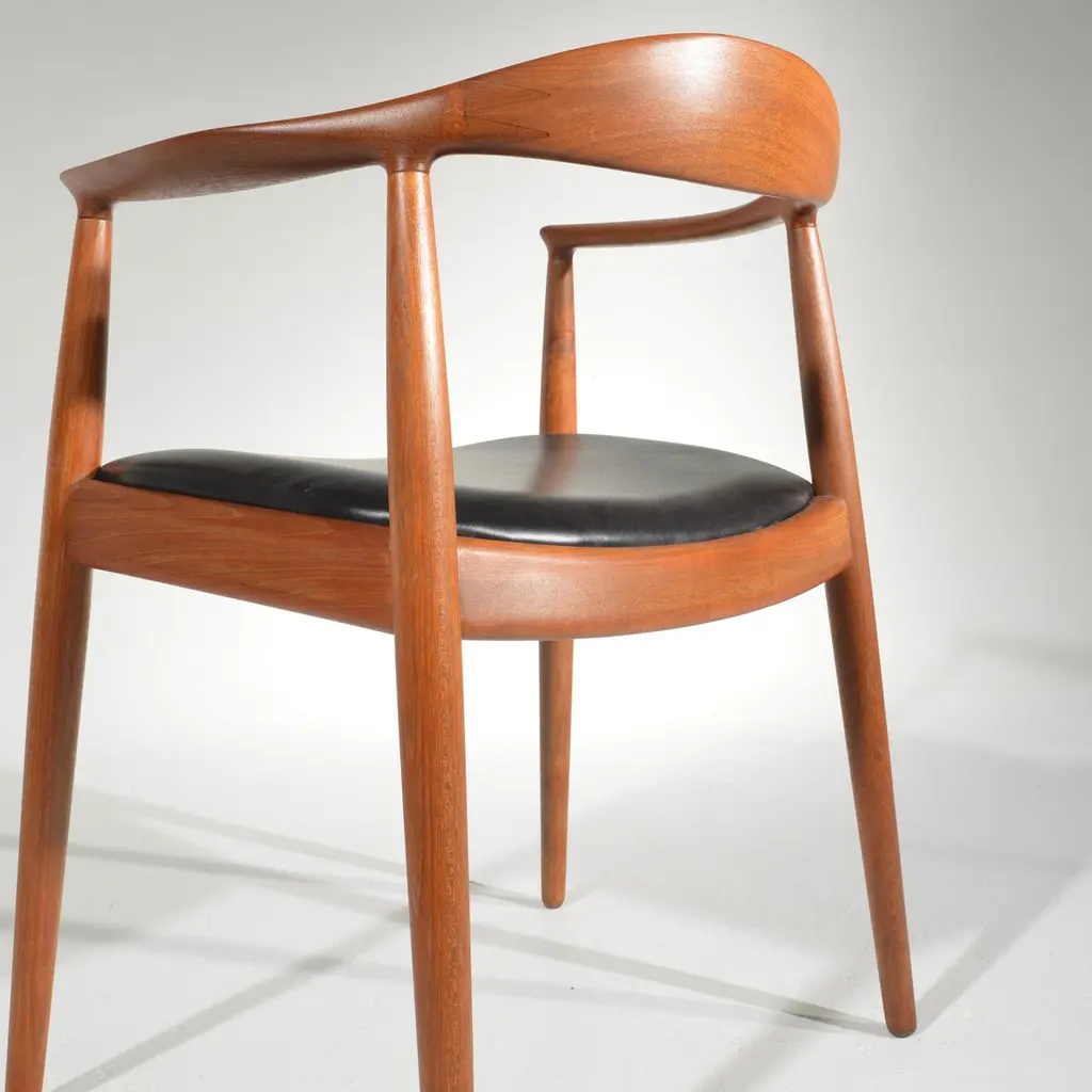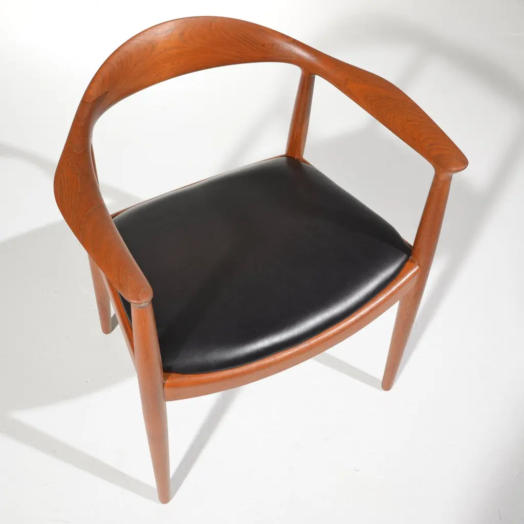 We are excited to offer 4 early Hans Wegner JH-503 chairs designed in 1949 and Produced by Johannes Hansen. Fully restored solid old growth teak construction. Stamped with the maker's mark. Currently we have 10 upholstered in black leather and one in white leather.