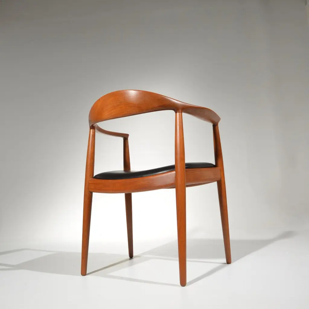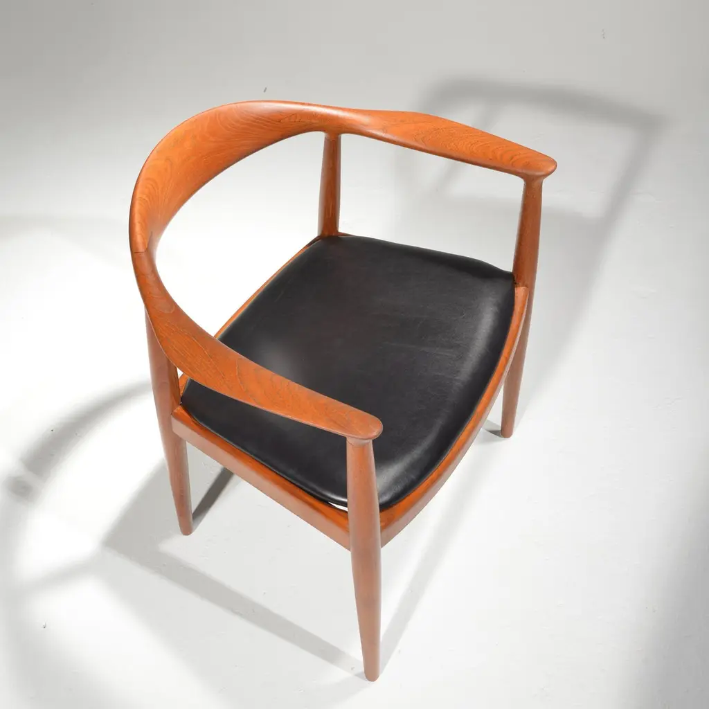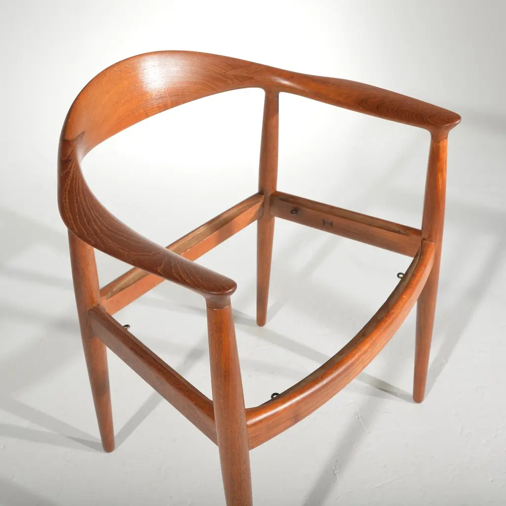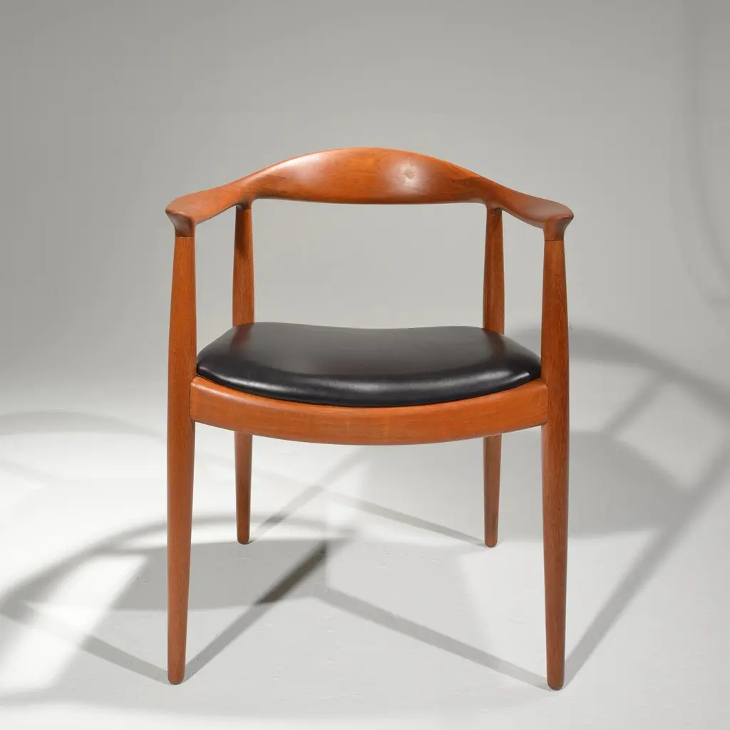 We are excited to offer 4 early Hans Wegner JH-503 chairs designed in 1949 and Produced by Johannes Hansen. Fully restored solid old growth teak construction. Stamped with the maker's mark. Currently we have 10 upholstered in black leather and one in white leather.