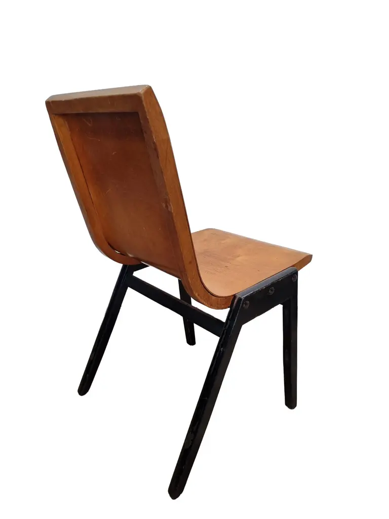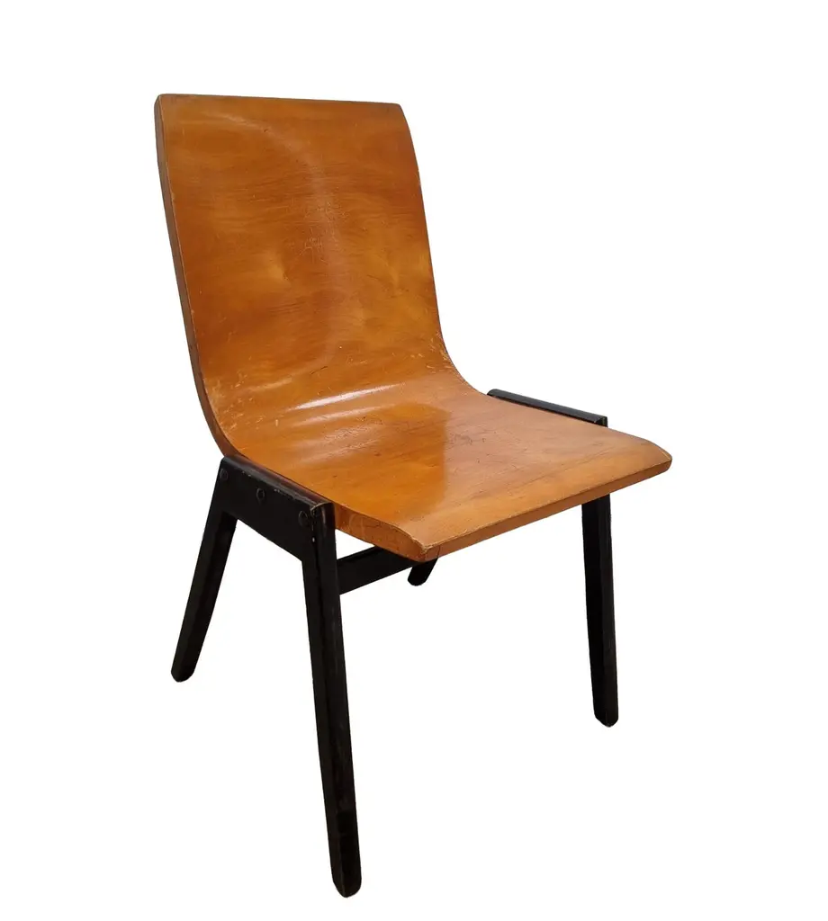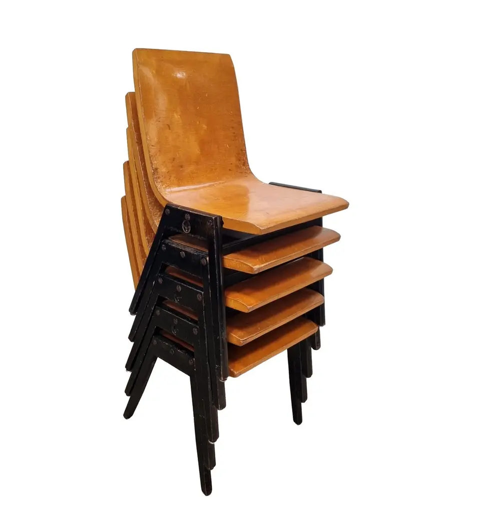 100+ Roland Rainer Stacking Chairs – Wiener Stadthalle, 1952 – Bent Plywood & Wooden A-FrameExceptional find: a cohesive lot of more than 100 original Roland Rainer stacking chairs (c. 1952), designed for the Wiener Stadthalle in Vienna. This iconic model embodies a streamlined, lightweight silhouette, making early use of bent-plywood technology, conceived for variability and efficiency in public architecture.The beautiful back–seat angle is purpose-shaped for bent plywood and is surprisingly comfortable. The distinctive, angular wooden A-frame contrasts elegantly with the gently curved shell—a timeless combination that makes a statement in interiors as well as hospitality/event settings.Why this lot is special100 chairs in matching specification — exceptionally rare in these quantitiesIdeal for hospitality, events, wedding venues, auditoriums, meeting rooms, film & stylingAuthentic mid-century character with a beautiful honey-colored patina