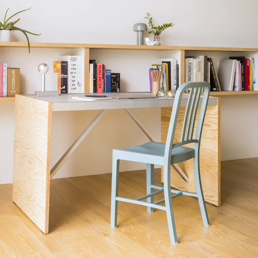 Originally designed for use on WWII submarines, today's 111 Navy Chair is an innovative collaboration between Coca-Cola and Emeco, Solving an environmental problem of the discarding of plastic soda bottles that pollute our environment, 111 discarded PET bottles are utilized towards the creation of the Navy Chair, saving millions of Coca-Cola bottles from the landfill each year. Crafted right here in the United States and built to last a lifetime, the simple silhouette and variety of colorful finishes let you effortlessly match to fit your interior needs. Highlights