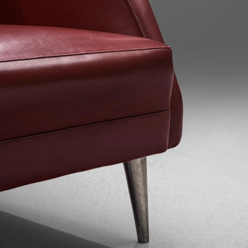 Carlo de Carli for Cassina, lounge chair, model 802, leatherette, nickel-plated metal, Italy, 1954Carlo De Carli, a prominent Italian architect and designer, designed this elegant chair that dates back to the 1950s. The chair features a sleek, streamlined silhouette that exemplifies the modernist ethos of simplicity and purity of form. Its clean lines and absence of decorative elements highlight De Carli's commitment to functional beauty. The slightly angled backrest and gently sloping armrests are designed to provide ergonomic comfort, showing De Carli's attention to the user's experience. The tapered legs are slender yet sturdy, finished in nickel-plated metal. The deep color of the red burgundy leatherette emphasizes the chair's sophisticated appearance. Carlo De Carli was born in 1910 in Milan and became an important architect and designer in the 1940s and 1950s working with Gio Ponti (1891-1979). He became a keen exponent of Italian furniture bringing it to the international market. Kindly note that the piece is in good, used condition with signs of age and use. For further details, we encourage you to reach out to our team of design specialists.