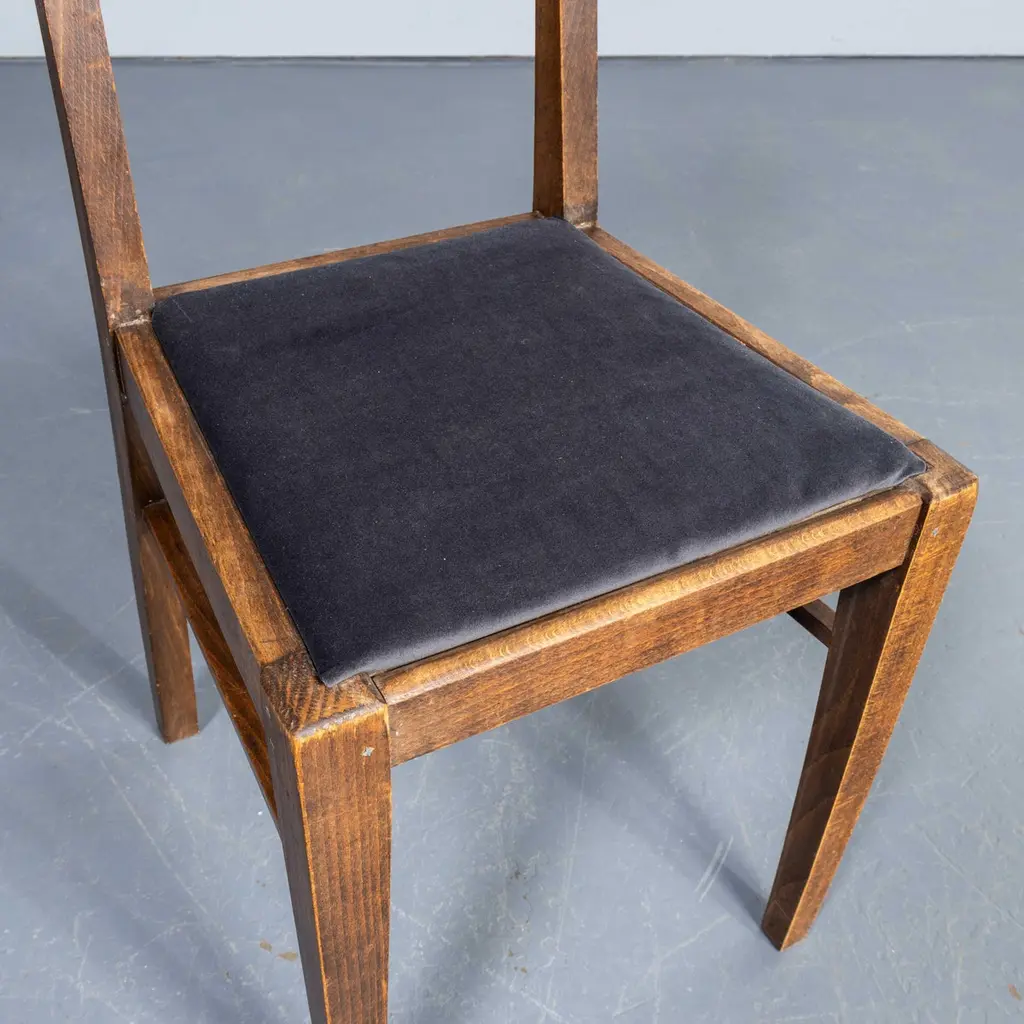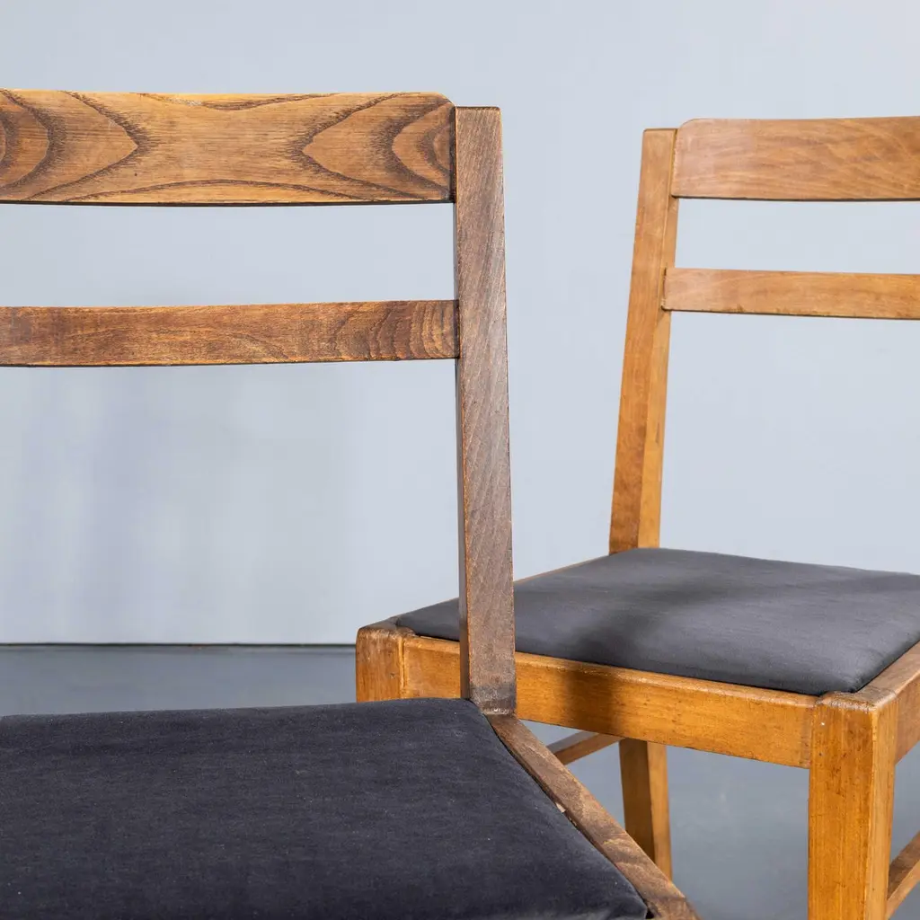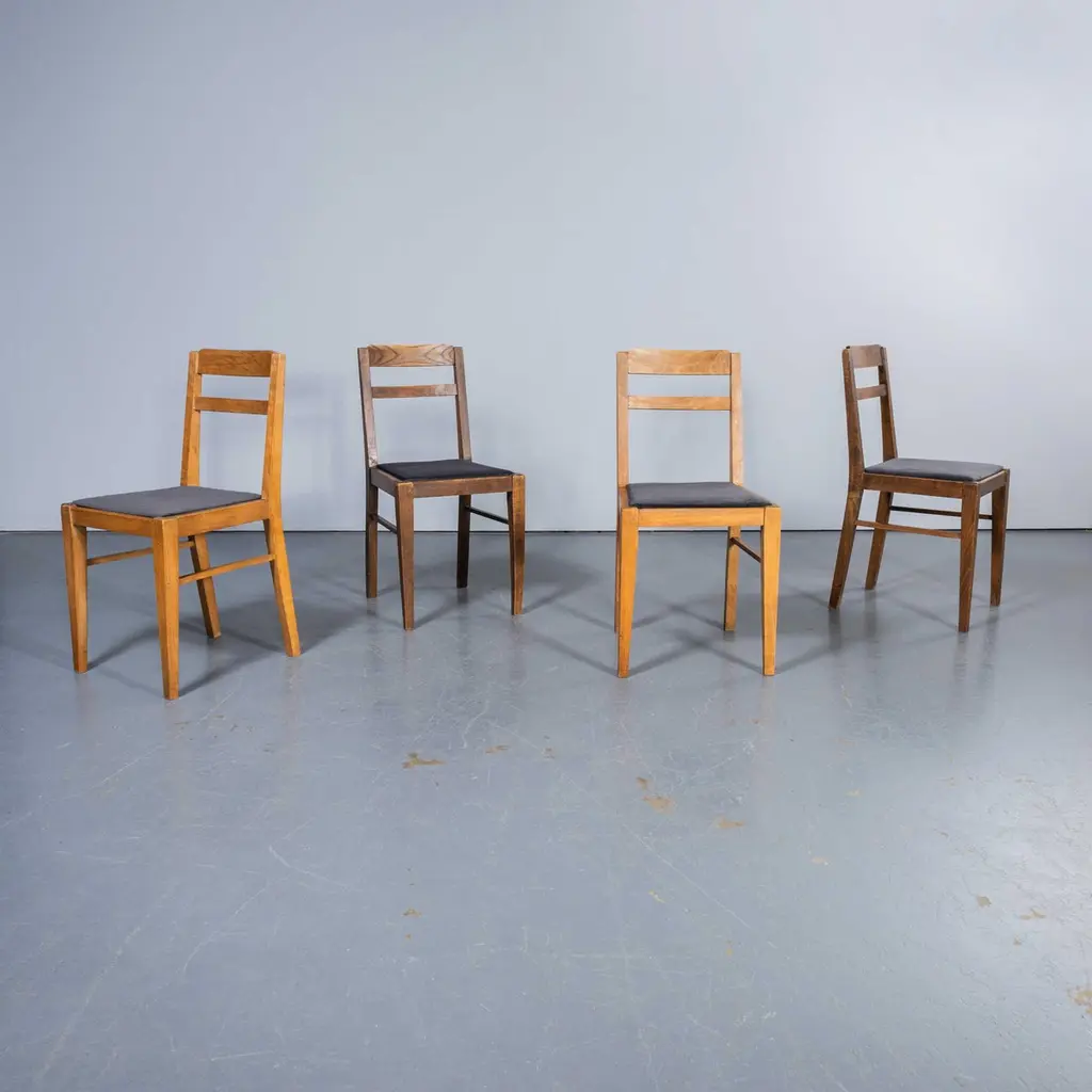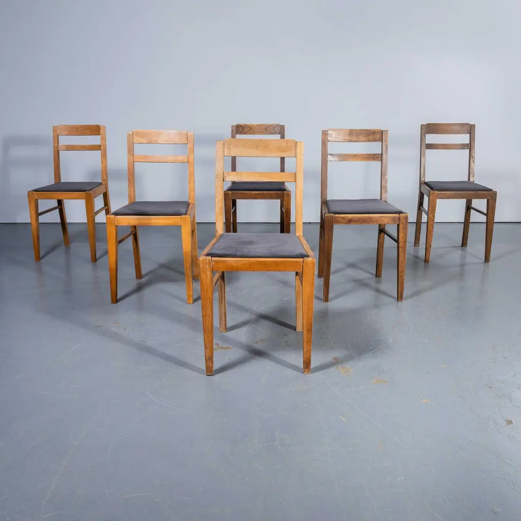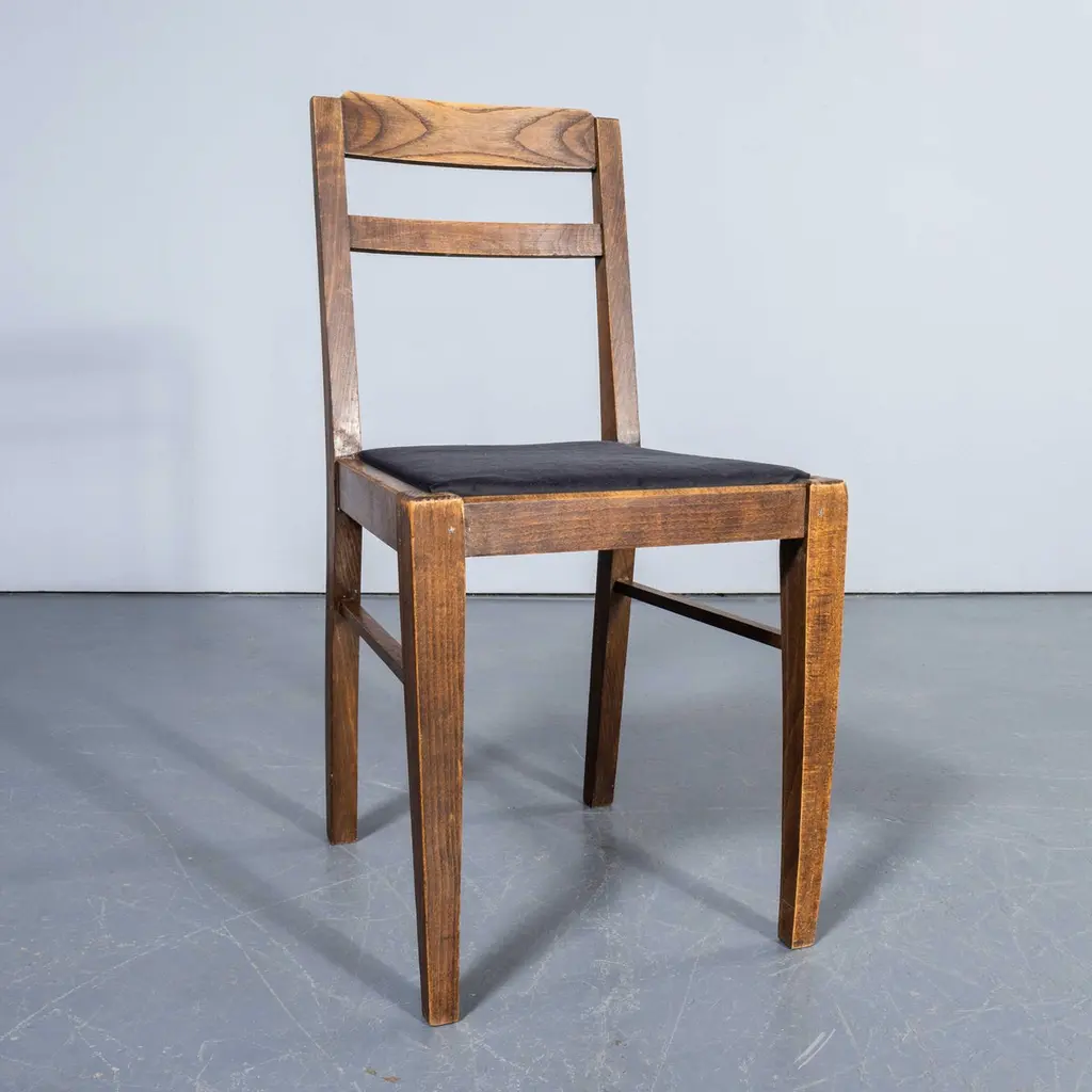 1950's French Upholstered Chairs By Vibo Vesoul - Good Quantities Available. A very unusual find for us we sourced these from a college library in central France. Vibo Vesoul was a niche French workshop best known for its work with the French designers Adrien Audoux and Frida Minet. These chairs are very much inspired by the arts and crafts movement with confident angles and the stepped back rail. Made in solid oak they have been rejuvenated on our workshop where we also reupholstered them. The listing is for one chair but we have a number available. Seat height 46 cm.Workshop Report:Our workshop team inspect every product and carry out any needed repairs to ensure that everything leaves us serviced and maintained ready for many more years of life. All of our vintage products show the rich beauty and history of their life with the knocks and bumps of many years of use and we try to minimise restoration to keep every piece as original as possible.Date:1950'sMaker:Handmade – FranceDimensions:40cm(w) x 43cm(l) x 81cm(h)