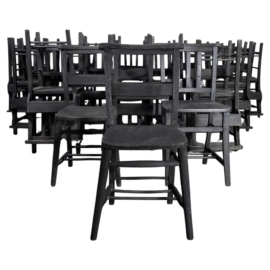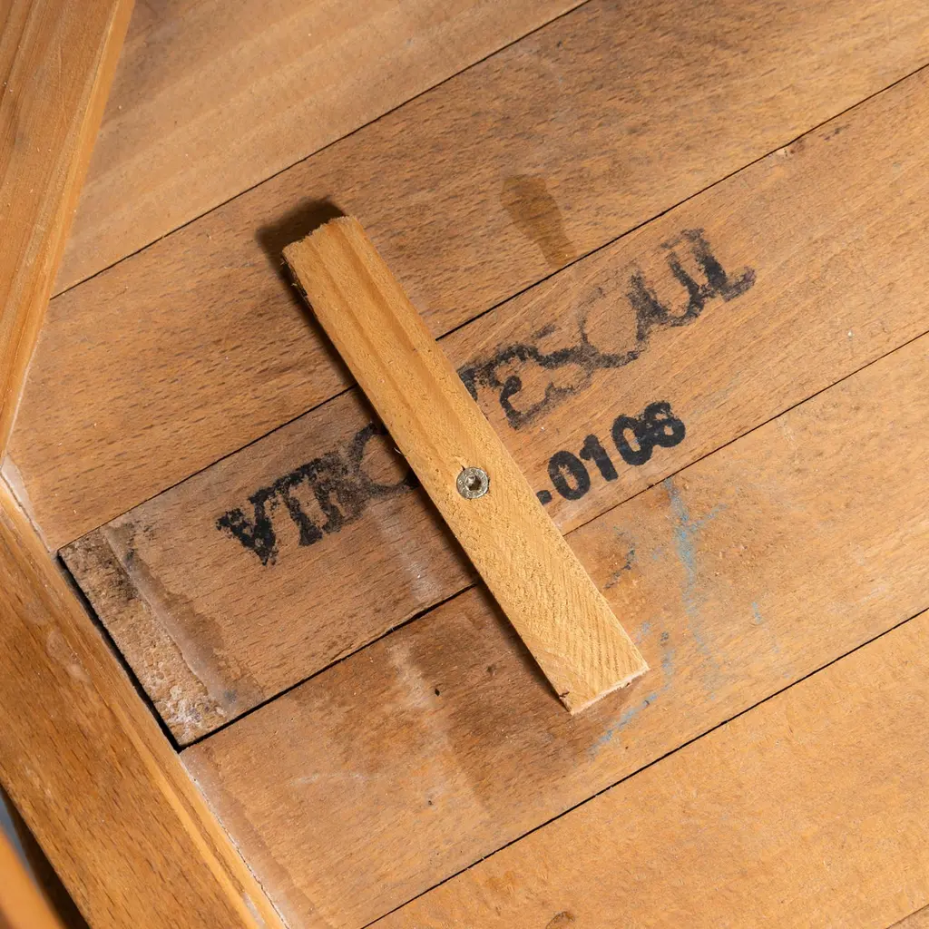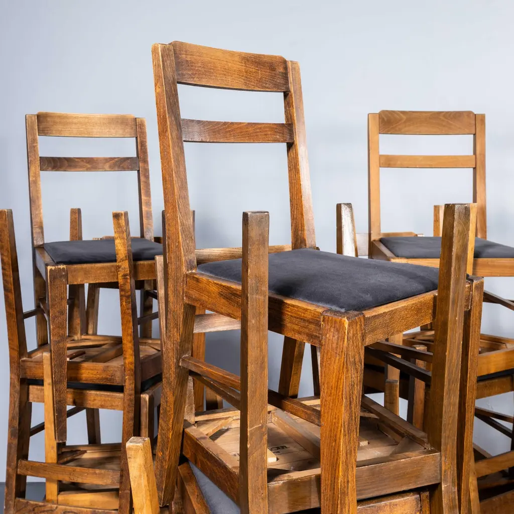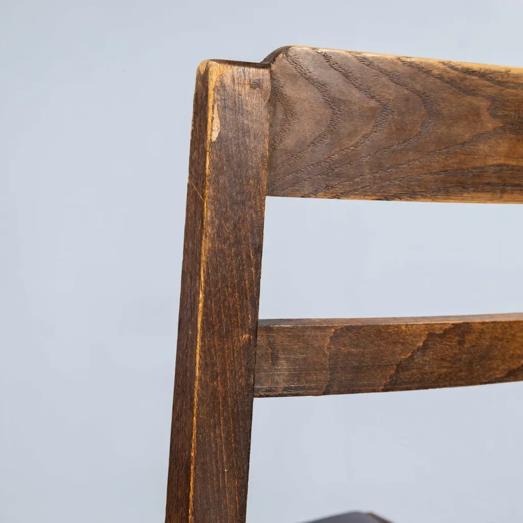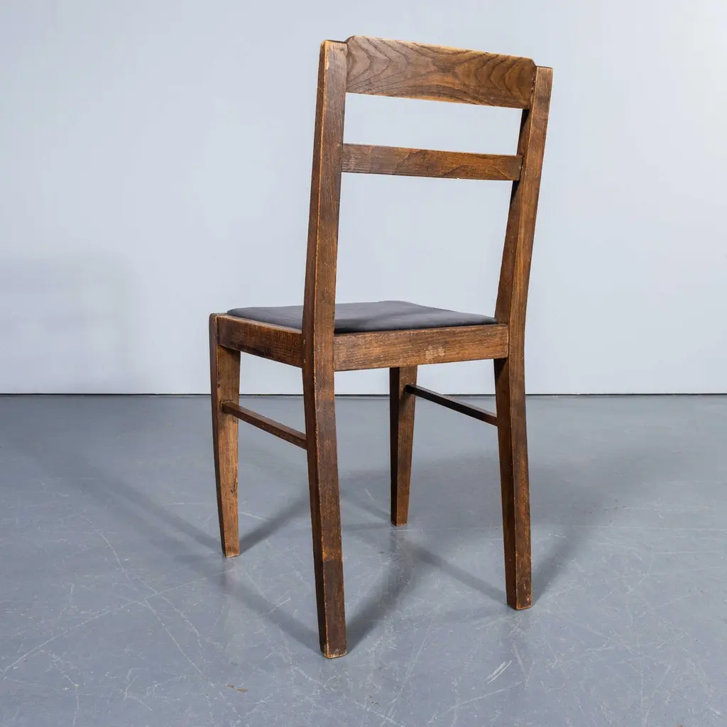 1950's French Upholstered Chairs By Vibo Vesoul - Good Quantities Available. A very unusual find for us we sourced these from a college library in central France. Vibo Vesoul was a niche French workshop best known for its work with the French designers Adrien Audoux and Frida Minet. These chairs are very much inspired by the arts and crafts movement with confident angles and the stepped back rail. Made in solid oak they have been rejuvenated on our workshop where we also reupholstered them. The listing is for one chair but we have a number available. Seat height 46 cm.Workshop Report:Our workshop team inspect every product and carry out any needed repairs to ensure that everything leaves us serviced and maintained ready for many more years of life. All of our vintage products show the rich beauty and history of their life with the knocks and bumps of many years of use and we try to minimise restoration to keep every piece as original as possible.Date:1950'sMaker:Handmade – FranceDimensions:40cm(w) x 43cm(l) x 81cm(h)