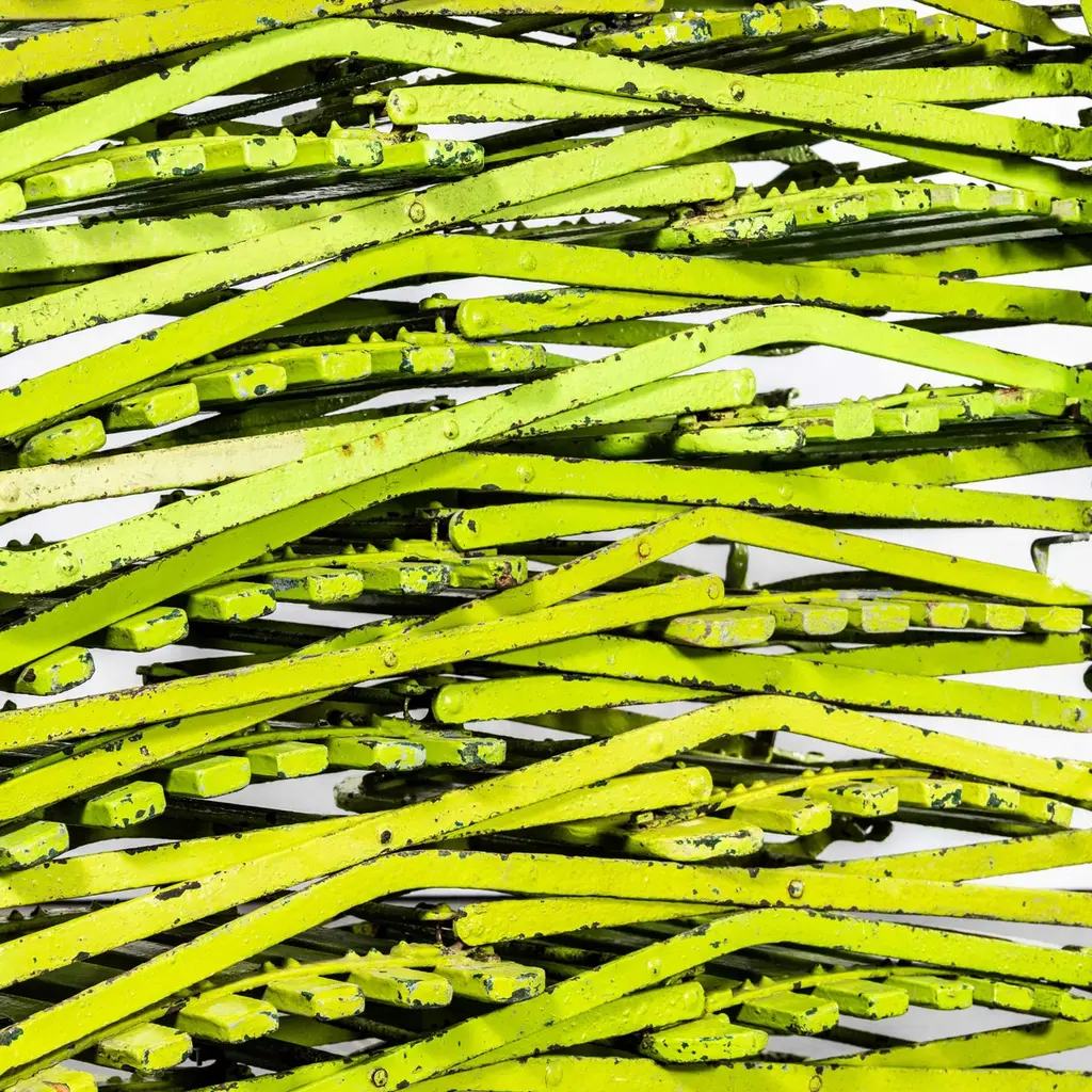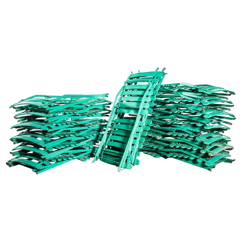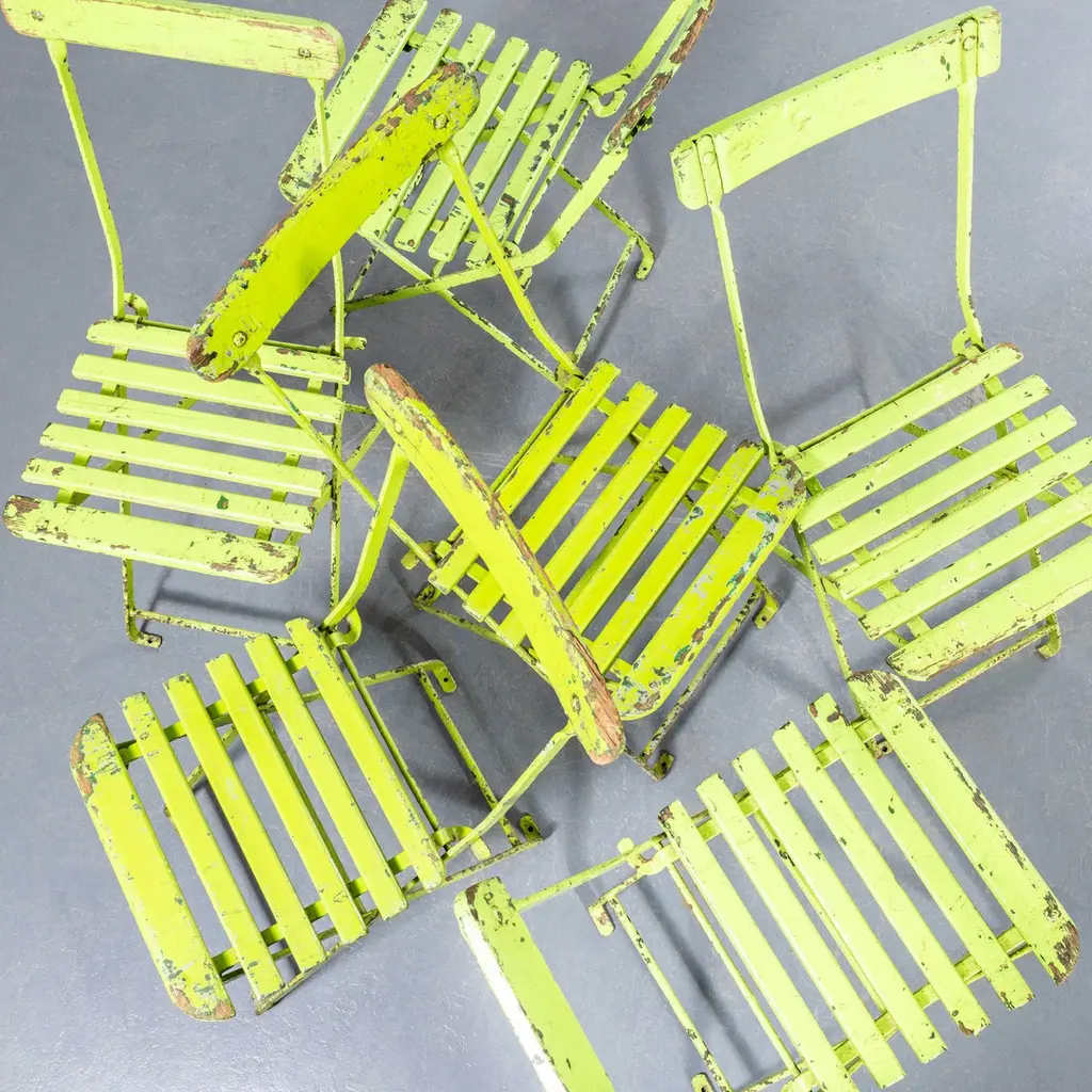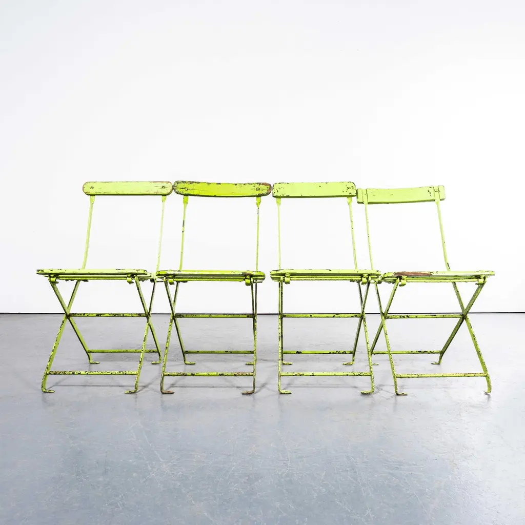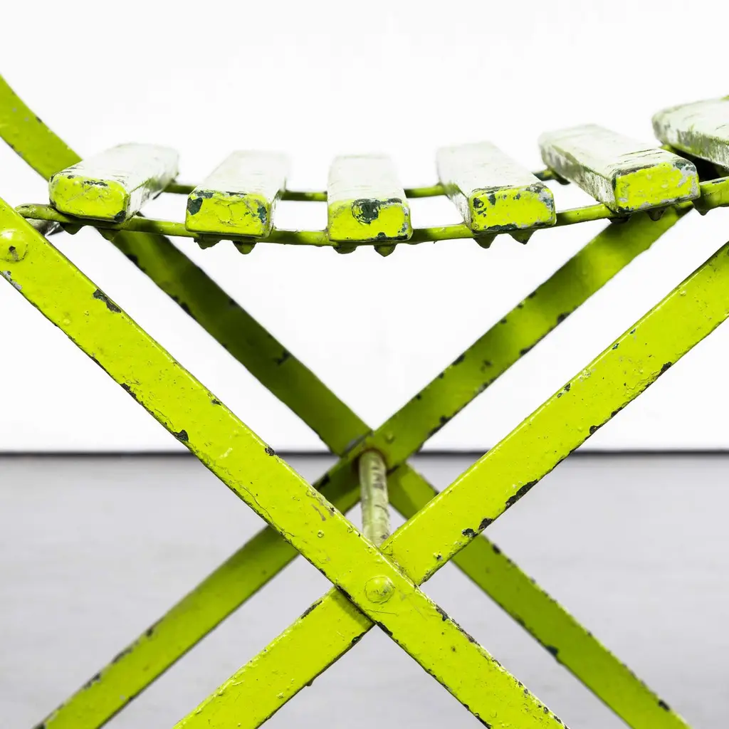 1950’s Original English Pavilion Lime Green Folding Chairs. We sourced these from a dusty community hall in Nottinghamshire where they had been stored for many years, having been removed from a local cricket ground. Classic English heavy weight folding chairs in good condition for their age with steel folding frames and original beech slats. Our workshop has inspected and serviced all the chairs, the folding mechanisms have been oiled and work well and the slats are solid. Please note these are 1950’s chairs that have been well used, they have movement but are fine for daily use but do not expect rock solid brand new chairs, we love these for the fact that they have survived and show their scars of life with great character and the original paint. Chair Seat Height: 45cm. Length when the chair is folded flat: 12cm.Workshop Report:Our workshop team inspect every product and carry out any needed repairs to ensure that everything leaves us serviced and maintained ready for many more years of life. All of our vintage products show the rich beauty and history of their life with the knocks and bumps of many years of use and we try to minimise restoration to keep every piece as original as possible.Date:1950'sMaker:Industrial Production – EnglandDimensions:45cm(w) x 56cm(l) x 84cm(h)
