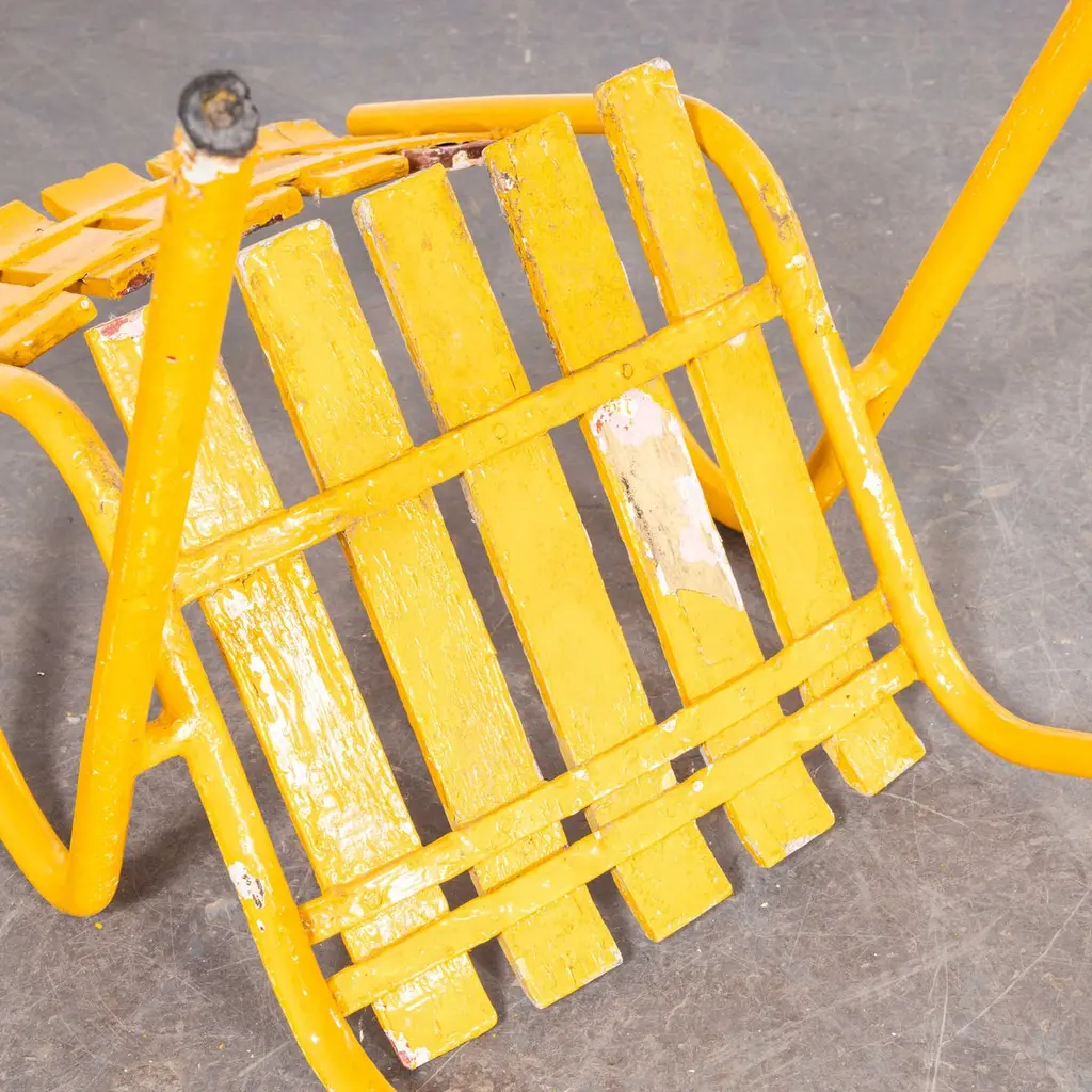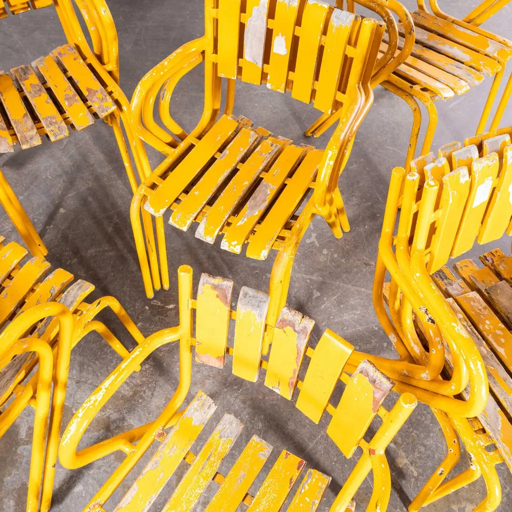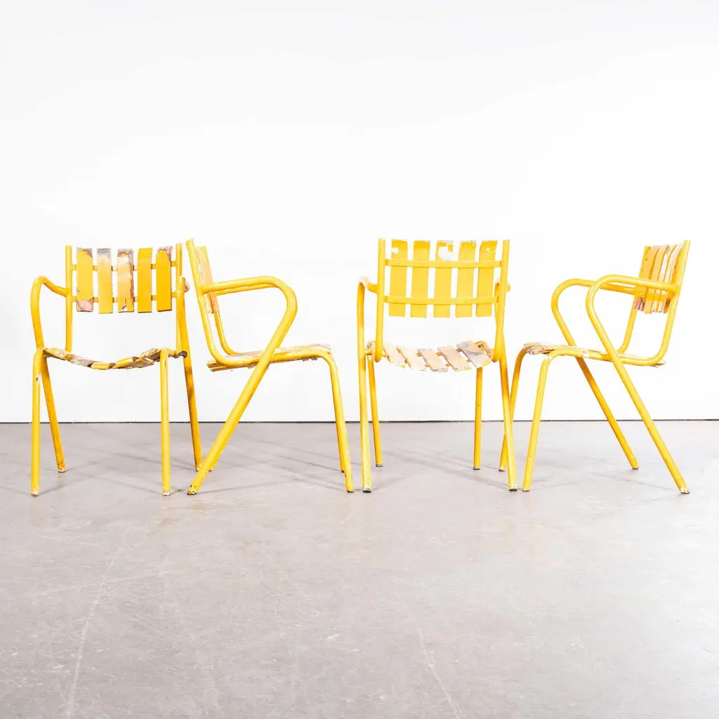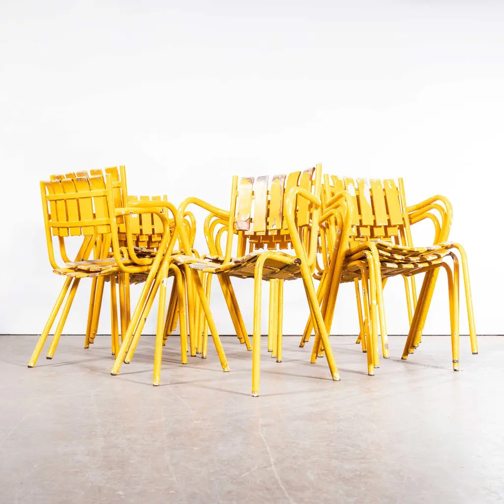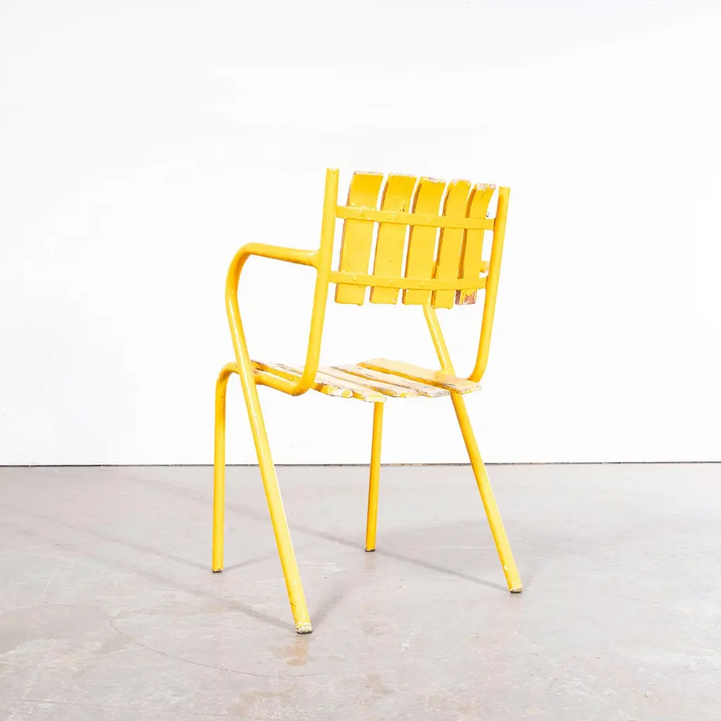 1950’s Original French Outdoor Yellow Slatted Chairs – Various Quantities Available1950’s Original French Outdoor Yellow Slatted Chairs – Various Quantities Available. Absolutely stunning and unusual set of French very fifties outdoor chairs. Heavy weight steel frames, all the chairs are arm chairs, the frames are heavy weight steel and the slats are painted beech with the original bold yellow. Our workshop has serviced each chair, replacing a handful of slats as required. The chairs are strong and comfortable. Seat height 44cm.WORKSHOP REPORTOur workshop team inspect every product and carry out any needed repairs to ensure that everything leaves us serviced and maintained ready for many more years of life. All of our vintage products show the rich beauty and history of their life with the knocks and bumps of many years of use and we try to minimise restoration to keep every piece as original as possible.Date: 1950'sMaker: Handmade - FranceDimensions:L 52 x W 49 x H 80 cm
