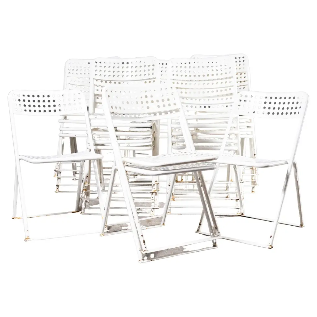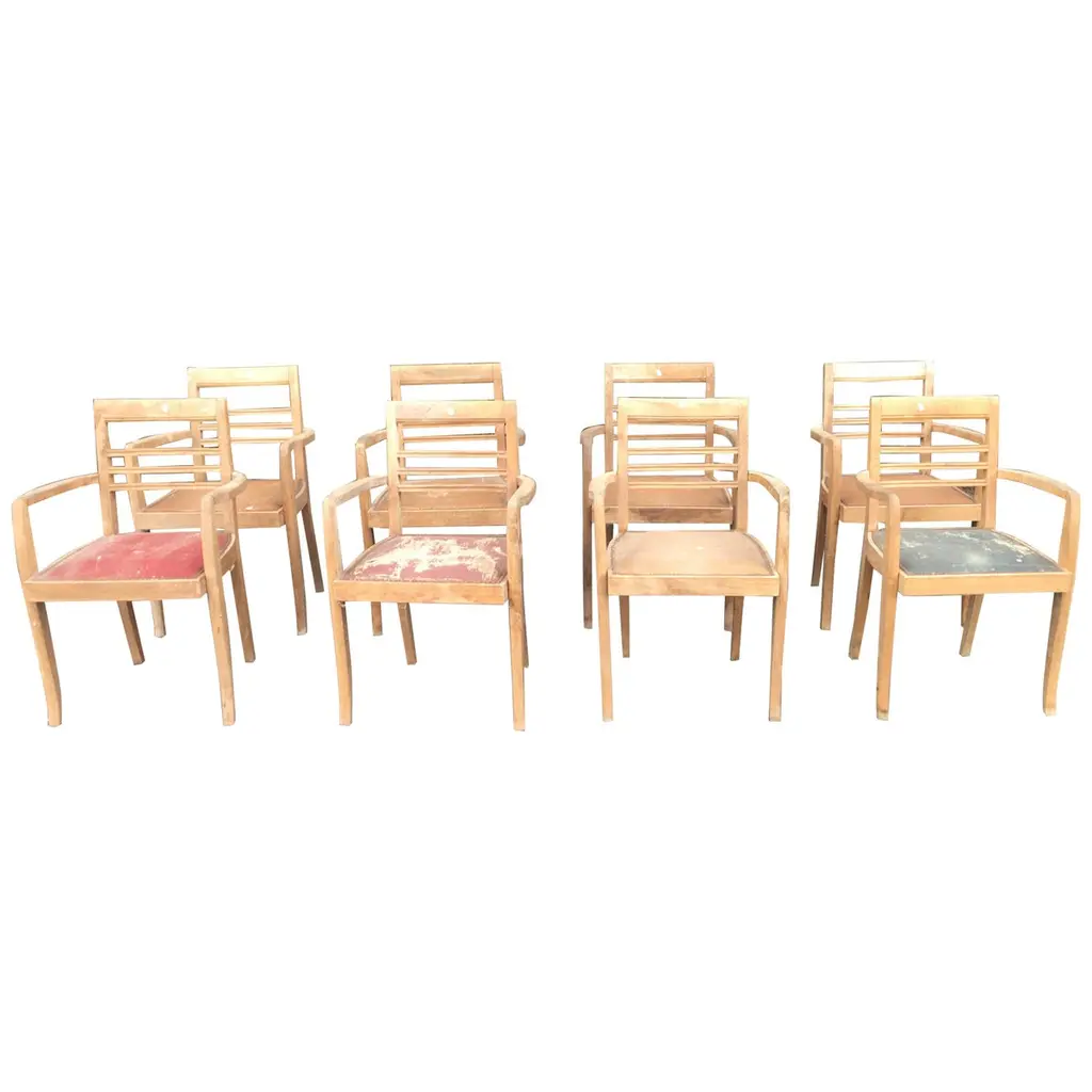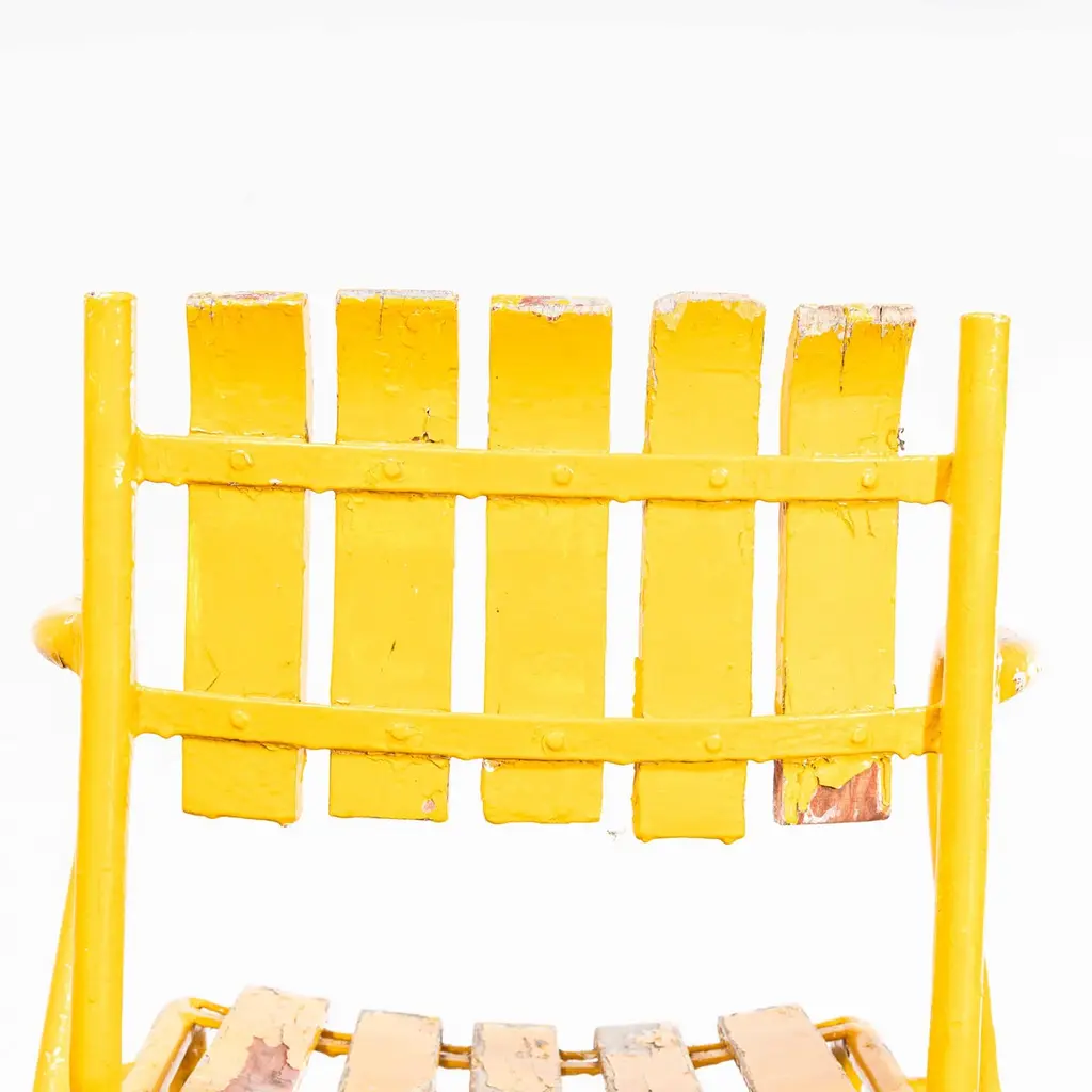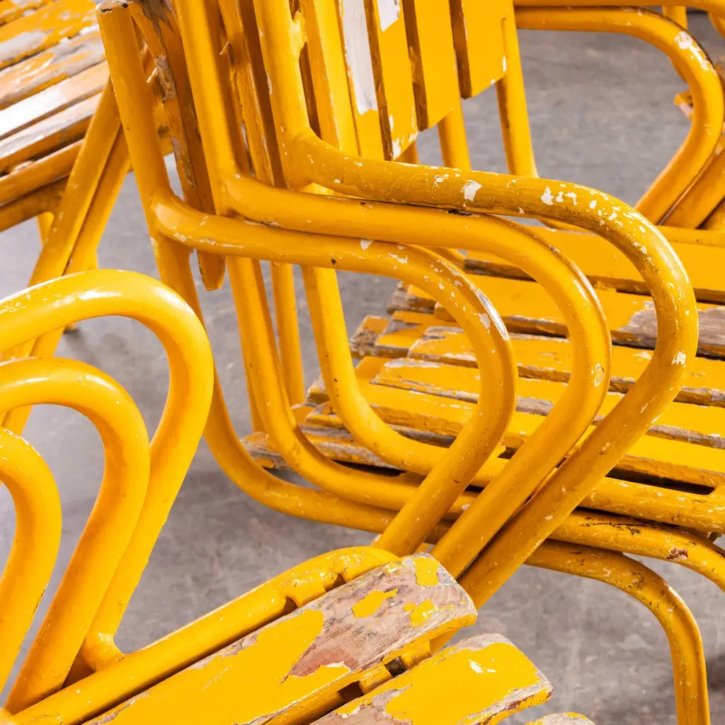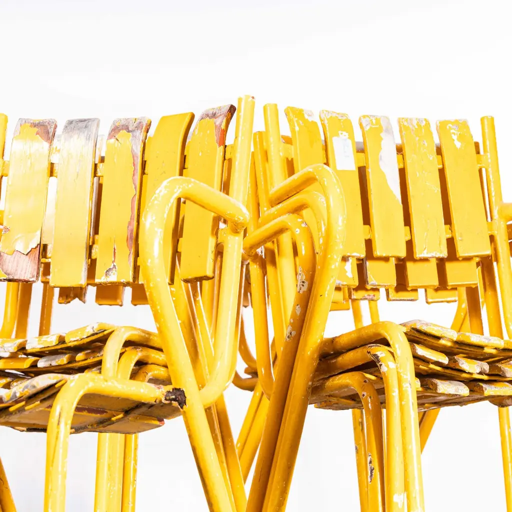 1950’s Original French Outdoor Yellow Slatted Chairs – Various Quantities Available1950’s Original French Outdoor Yellow Slatted Chairs – Various Quantities Available. Absolutely stunning and unusual set of French very fifties outdoor chairs. Heavy weight steel frames, all the chairs are arm chairs, the frames are heavy weight steel and the slats are painted beech with the original bold yellow. Our workshop has serviced each chair, replacing a handful of slats as required. The chairs are strong and comfortable. Seat height 44cm.WORKSHOP REPORTOur workshop team inspect every product and carry out any needed repairs to ensure that everything leaves us serviced and maintained ready for many more years of life. All of our vintage products show the rich beauty and history of their life with the knocks and bumps of many years of use and we try to minimise restoration to keep every piece as original as possible.Date: 1950'sMaker: Handmade - FranceDimensions:L 52 x W 49 x H 80 cm