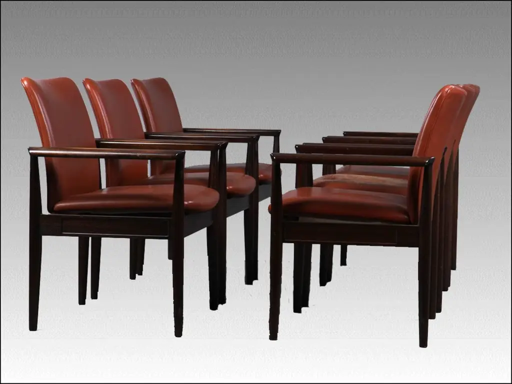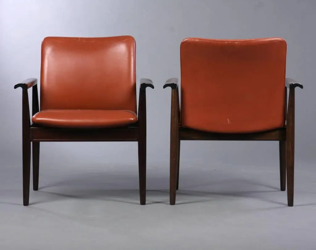 Finn Juhl designed the model 209 chairs in 1961. The chair is part of a series of furniture named the Diplomat series with chairs, desks, tables, cabinets and other furniture.The chairs features mahogany frames and brown leather upholstery and have a simple design with straight lines and curved armrests and legs and very comfortable seats that will fit in well both at home and at the office.Frames have been fully restored, sanded by hand and refinished. Leather upholstery is original and intact . Some of the seats have beginning cracks in the leather and will be renewed with new leather without extra cost if you do not wish to keep the original leather and patina.We are shipping pieces to most parts of the world - so feel free to ask for a shipping quote.