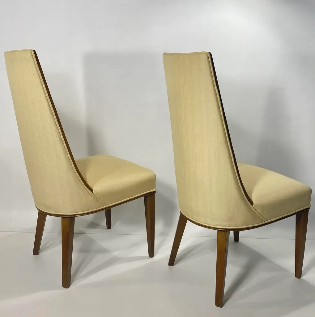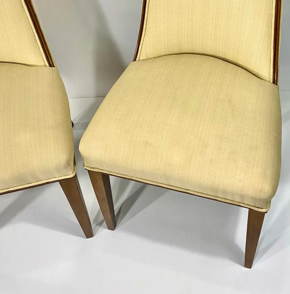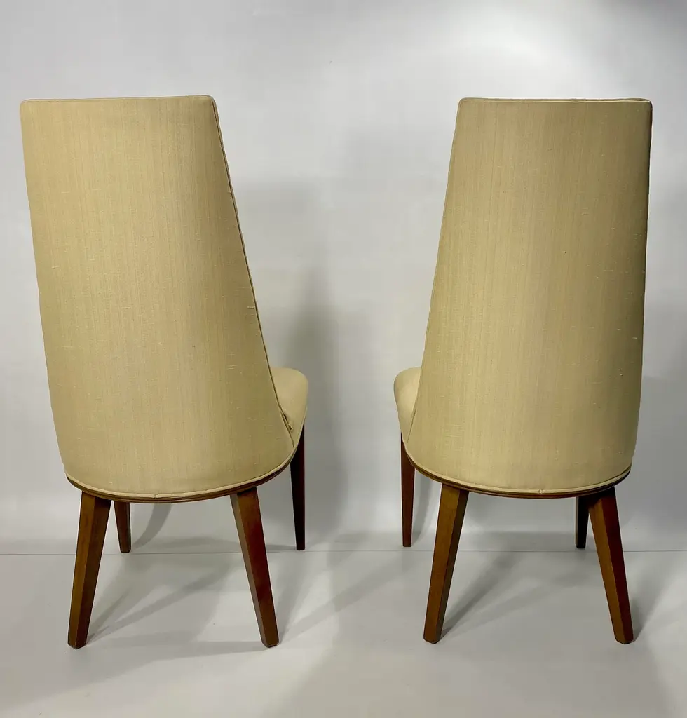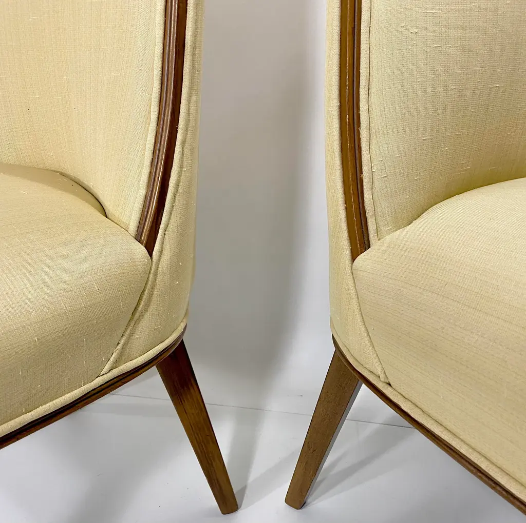 Pair Tall Back Mid Century Modern Chairs, Style of Erwin - Lambeth Tomlinson Walnut Wooden Surround Highlights Elegant Form See the Sides of the Chair. Wood Curves Gently Forward from Top to Seat Slubby (textured) Original Upholstery Quiet Luxury, MCM High Style