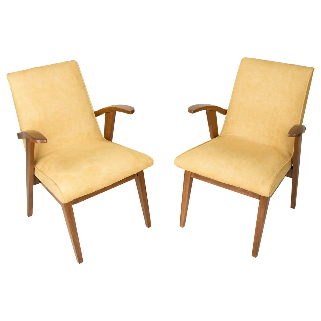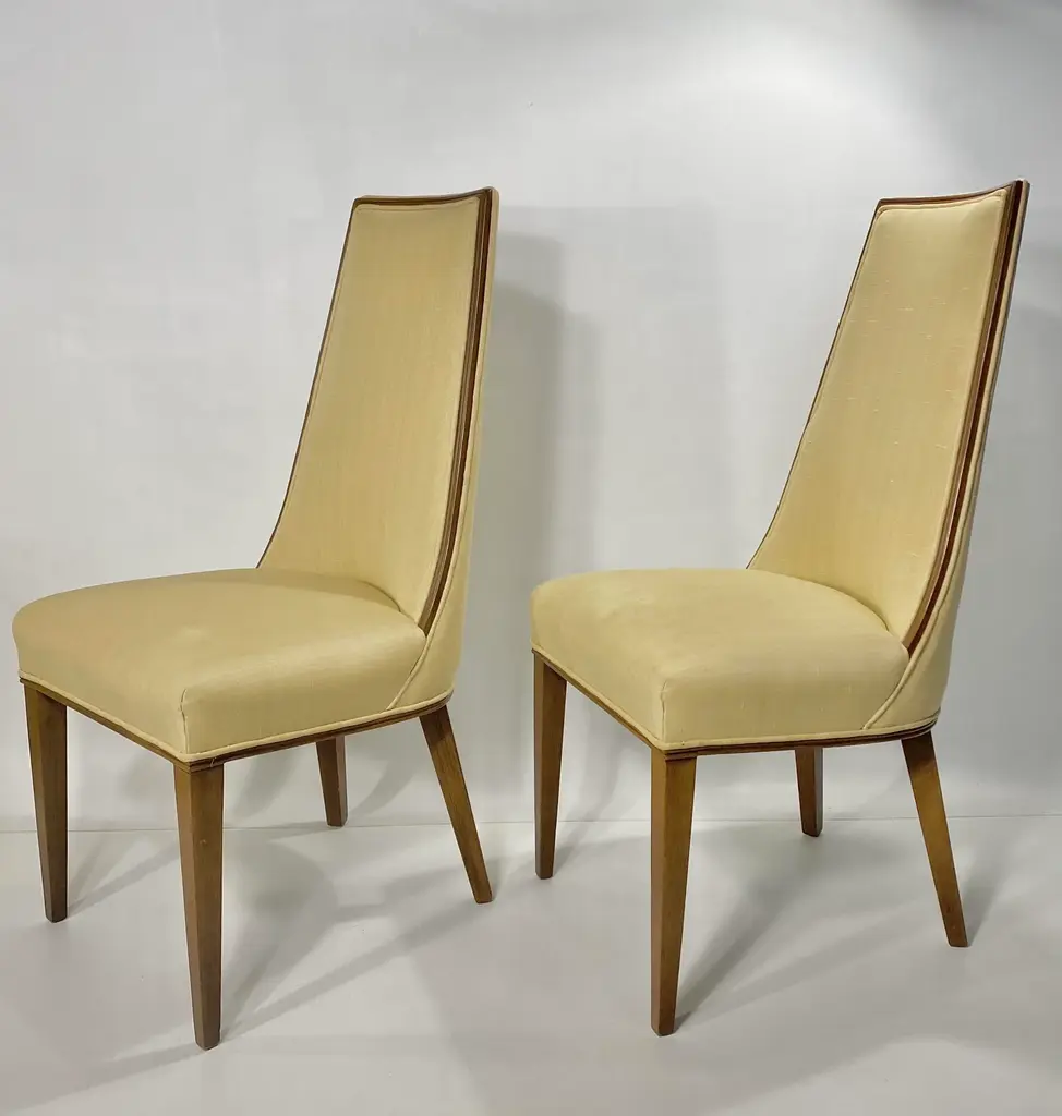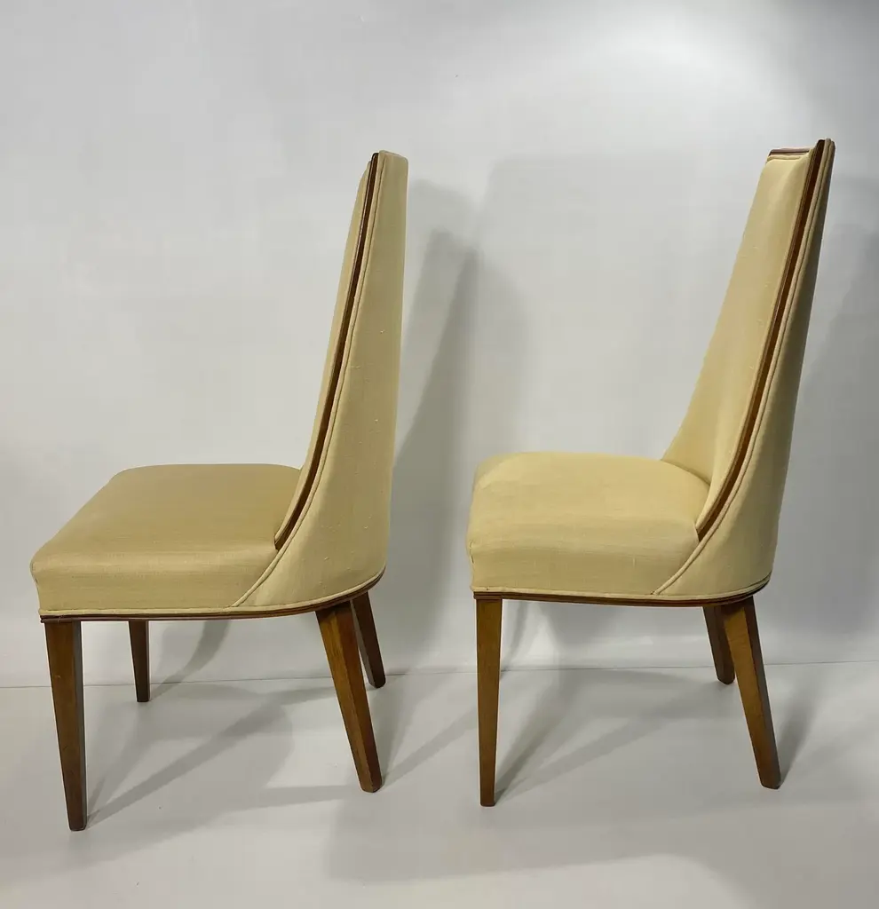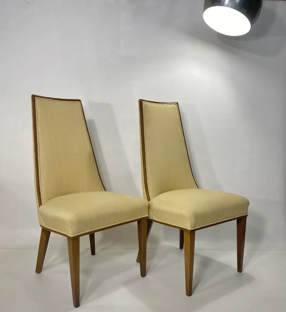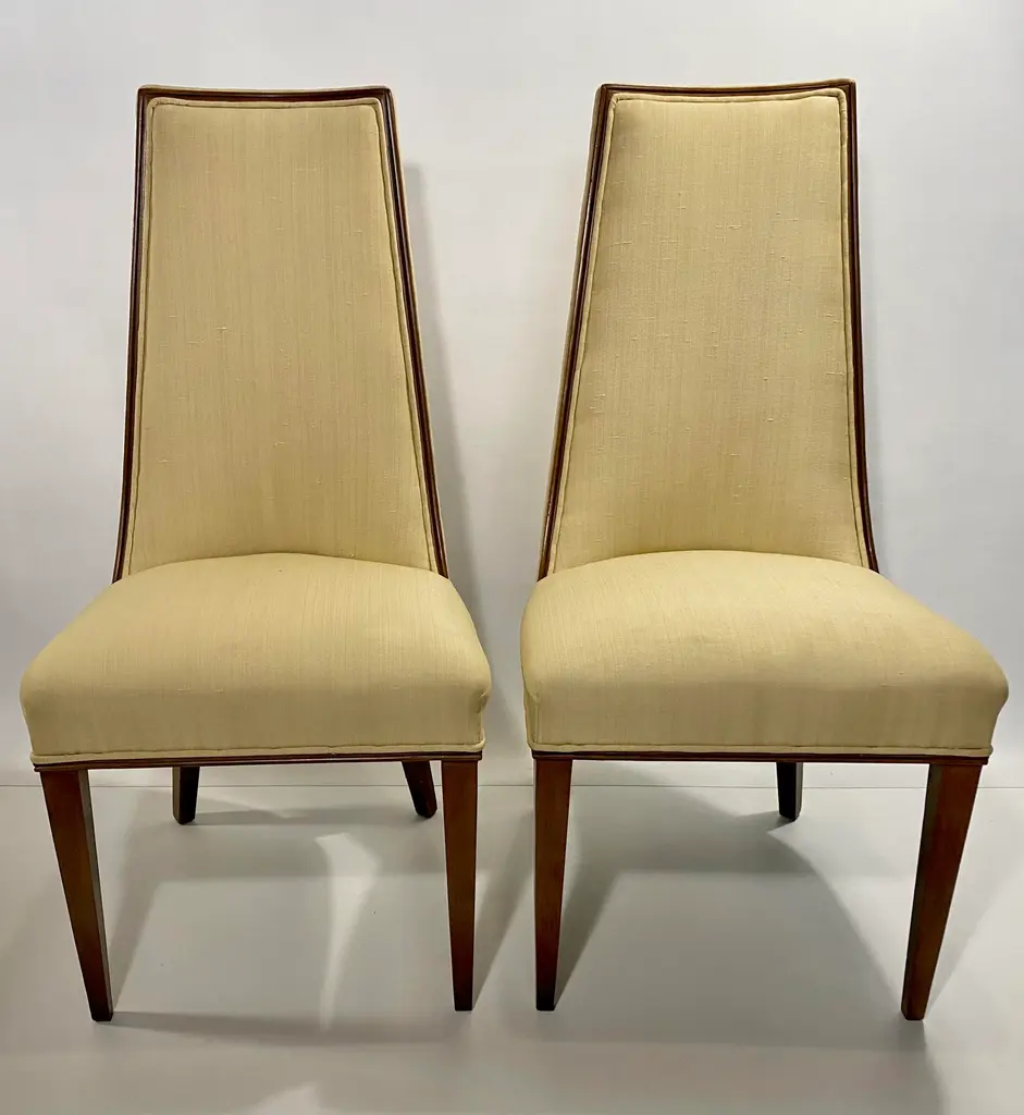 Pair Tall Back Mid Century Modern Chairs, Style of Erwin - Lambeth Tomlinson Walnut Wooden Surround Highlights Elegant Form See the Sides of the Chair. Wood Curves Gently Forward from Top to Seat Slubby (textured) Original Upholstery Quiet Luxury, MCM High Style