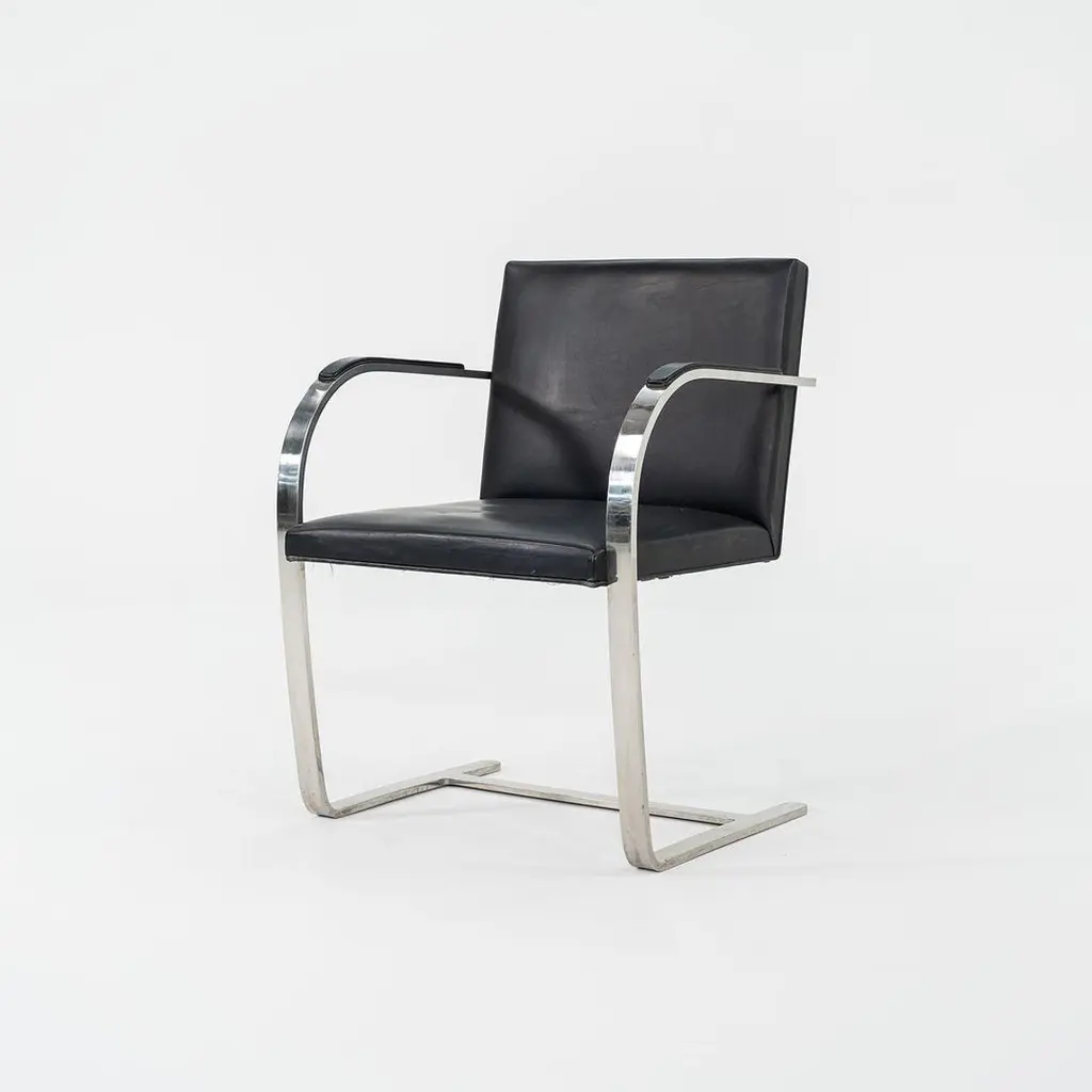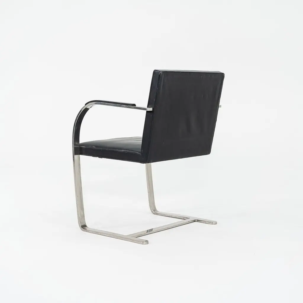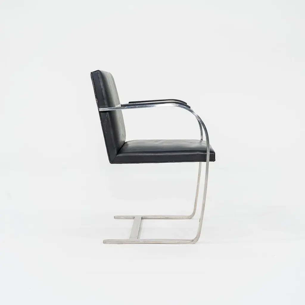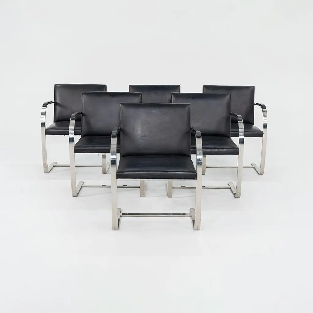 These are Brno Armchairs, model MR50, initially designed by Ludwig Mies van der Rohe and Lily Reich in 1929. These particular examples were produced by Knoll in the 1960s. The listed price includes one MR50, and we have six available for purchase in this colorway. The design features a flat, polished stainless-steel frame, utilized throughout the silhouette on both the arms and at the cantilever base. The flat-bar construction was a novel idea to emerge at the time, as the tubular stylings of the Bauhaus had but recently established themselves as the mode de-rigueur. Each MR50 chair measures 22.5 inches long, 22.75 inches wide, and 31.5 inches high. Their seat height is 17.5 inches, and their arm height is 25.75 inches. The steel frames are in good original condition with some scratches, and their leather upholstery has some marks and scratches, Overall, these chairs are in good vintage condition showing wear. They could either be used as/is or reupholstered. Please see photos. Genuinely faulty goods will be replaced or money refunded on a case by case basis, however we must be advised of any faulty goods upon receipt of the item. It is the customer's responsibility to pay for return shipping and ship the item back to us. If the item is found to be faulty, we will also refund the postage cost. If there is no damage to the item, but a return is approved, the buyer will be responsible for both the initial and return shipping cost. It is at our discretion to refuse the refund of undamaged goods. If an order is placed and you would like to cancel the order, please notify us immediately. Any refunds will be processed via the same means that payment was made.