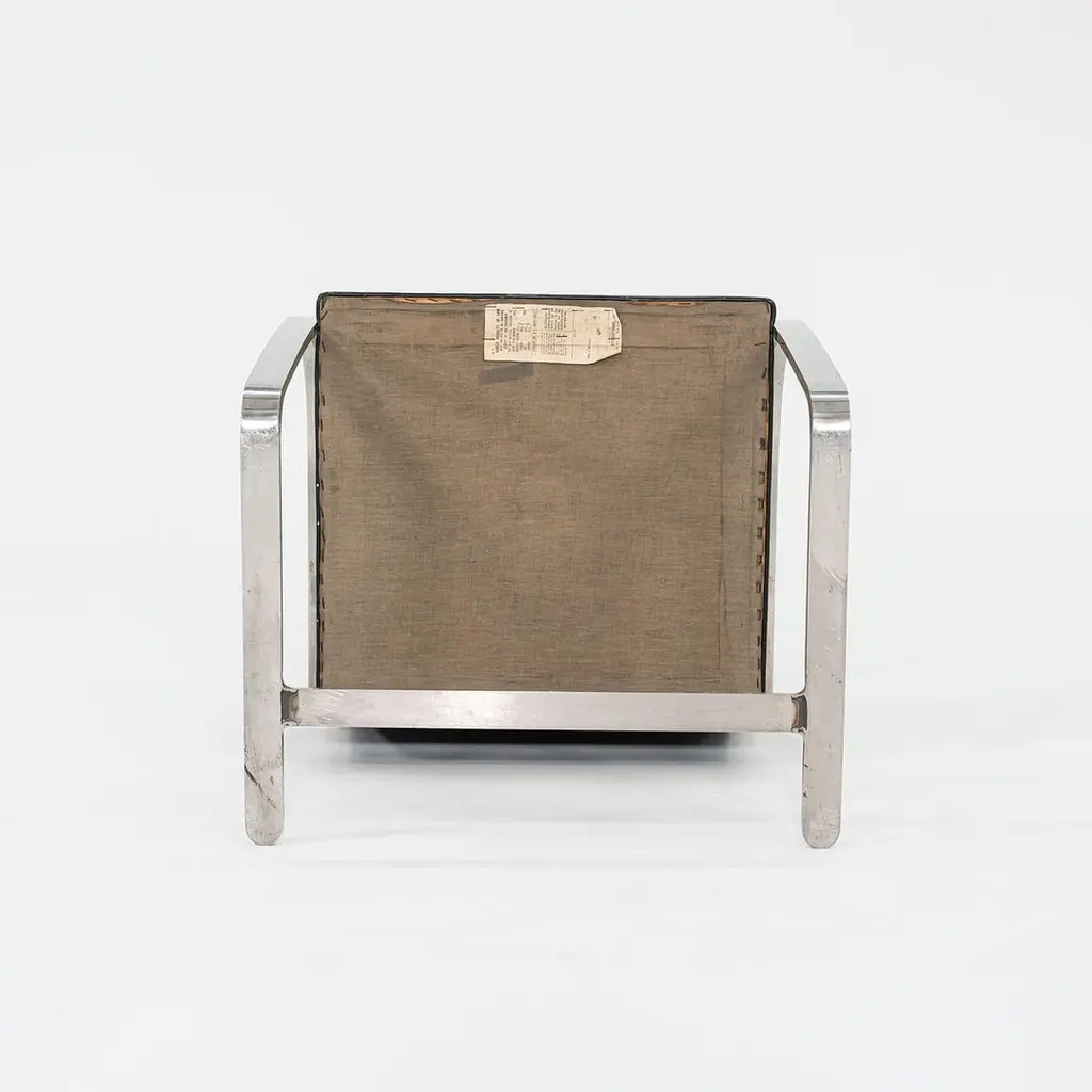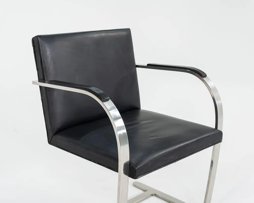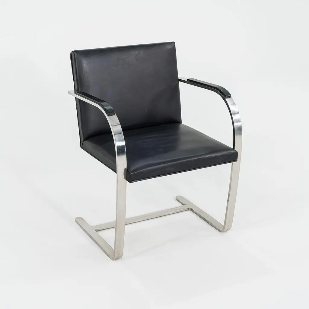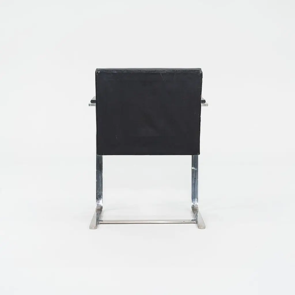 These are Brno Armchairs, model MR50, initially designed by Ludwig Mies van der Rohe and Lily Reich in 1929. These particular examples were produced by Knoll in the 1960s. The listed price includes one MR50, and we have six available for purchase in this colorway. The design features a flat, polished stainless-steel frame, utilized throughout the silhouette on both the arms and at the cantilever base. The flat-bar construction was a novel idea to emerge at the time, as the tubular stylings of the Bauhaus had but recently established themselves as the mode de-rigueur. Each MR50 chair measures 22.5 inches long, 22.75 inches wide, and 31.5 inches high. Their seat height is 17.5 inches, and their arm height is 25.75 inches. The steel frames are in good original condition with some scratches, and their leather upholstery has some marks and scratches, Overall, these chairs are in good vintage condition showing wear. They could either be used as/is or reupholstered. Please see photos. Genuinely faulty goods will be replaced or money refunded on a case by case basis, however we must be advised of any faulty goods upon receipt of the item. It is the customer's responsibility to pay for return shipping and ship the item back to us. If the item is found to be faulty, we will also refund the postage cost. If there is no damage to the item, but a return is approved, the buyer will be responsible for both the initial and return shipping cost. It is at our discretion to refuse the refund of undamaged goods. If an order is placed and you would like to cancel the order, please notify us immediately. Any refunds will be processed via the same means that payment was made.